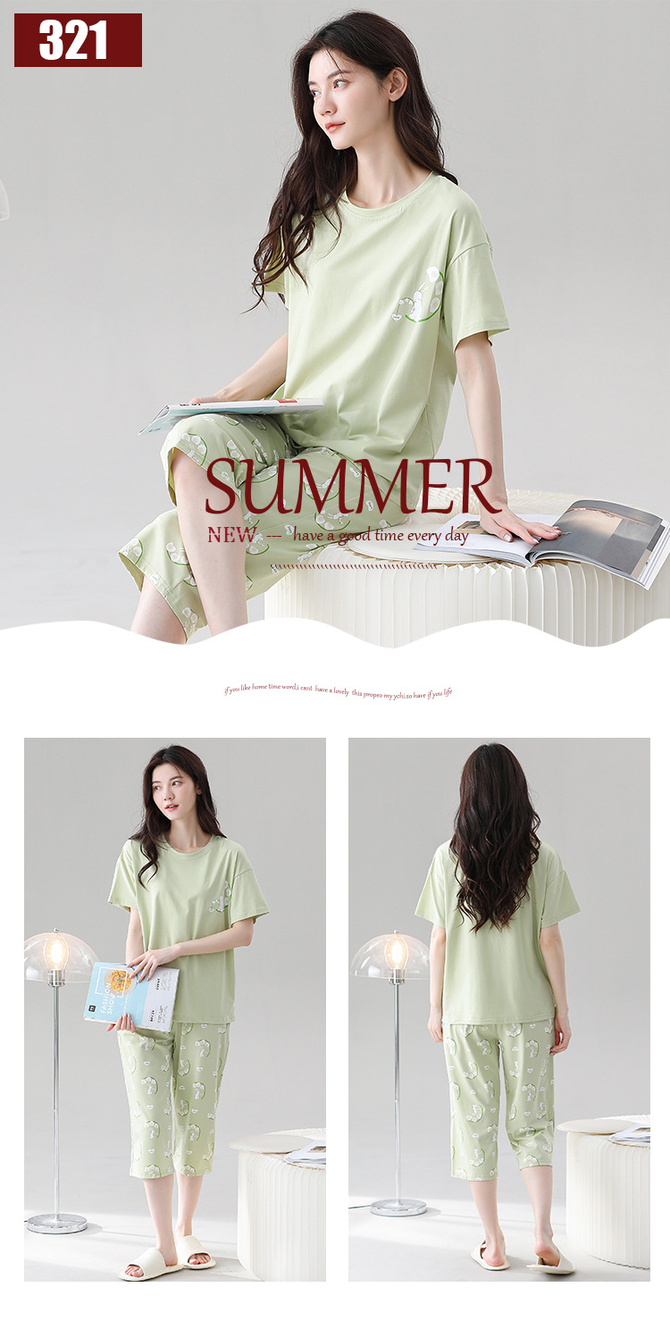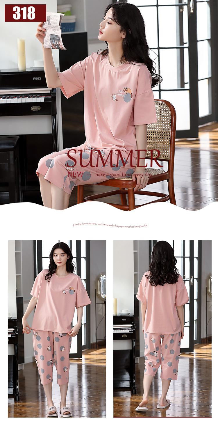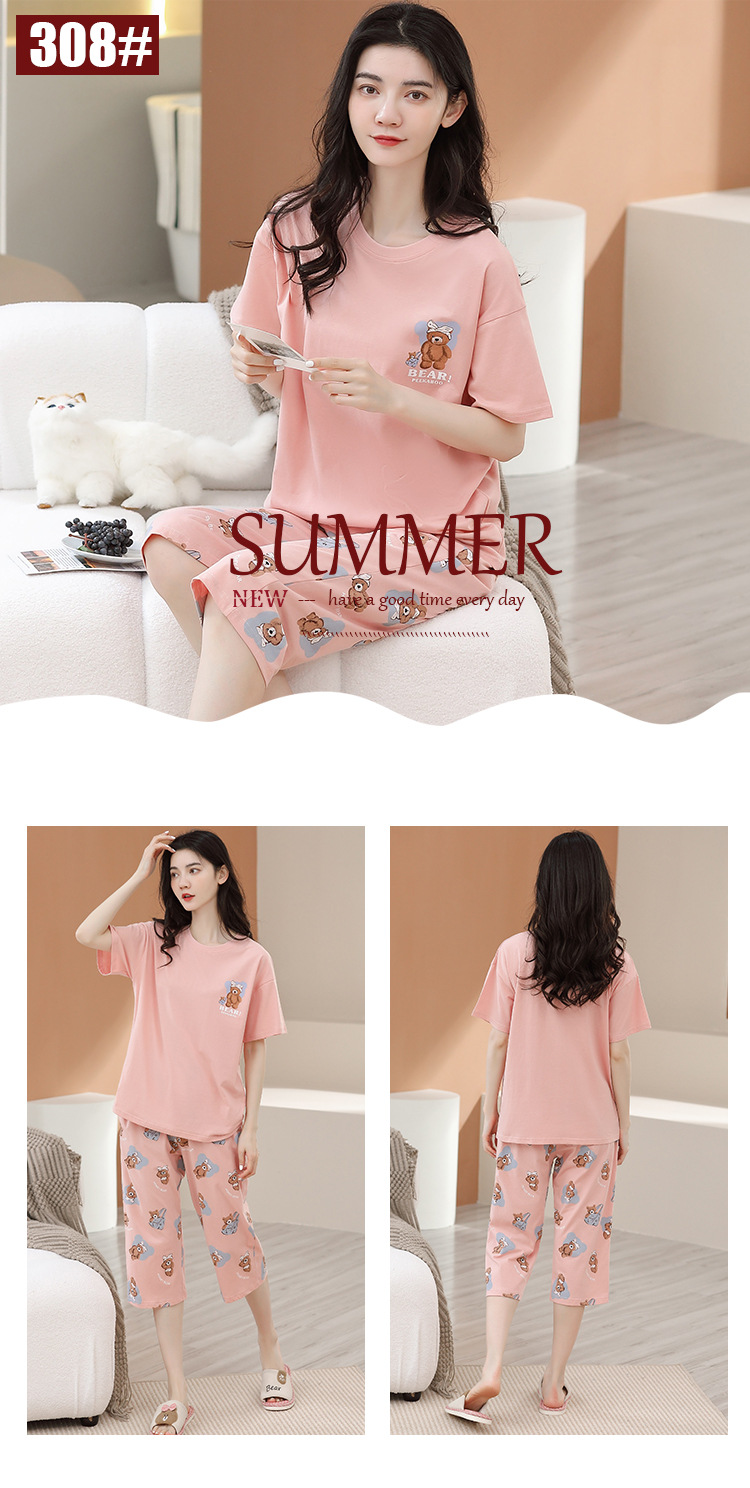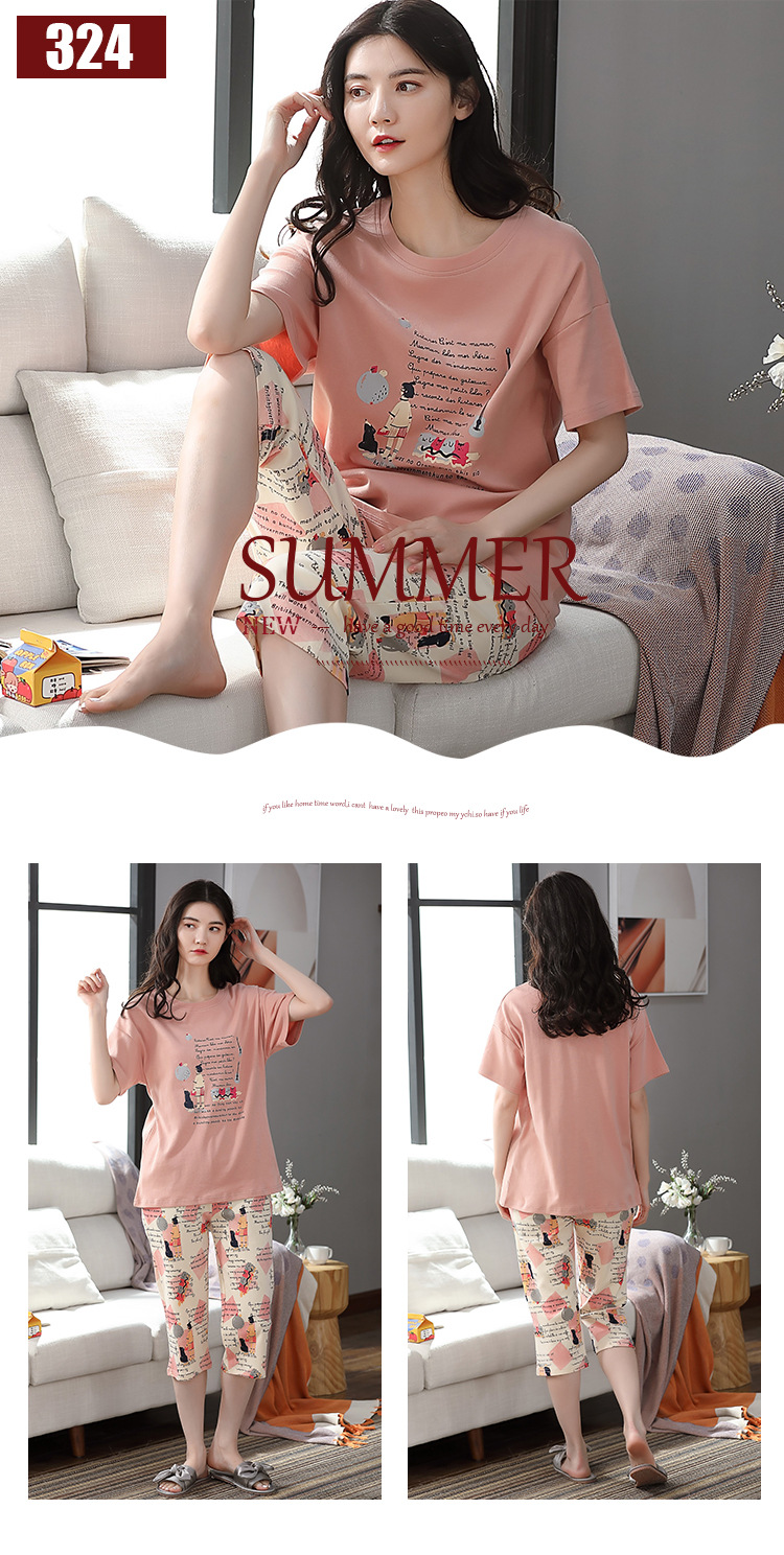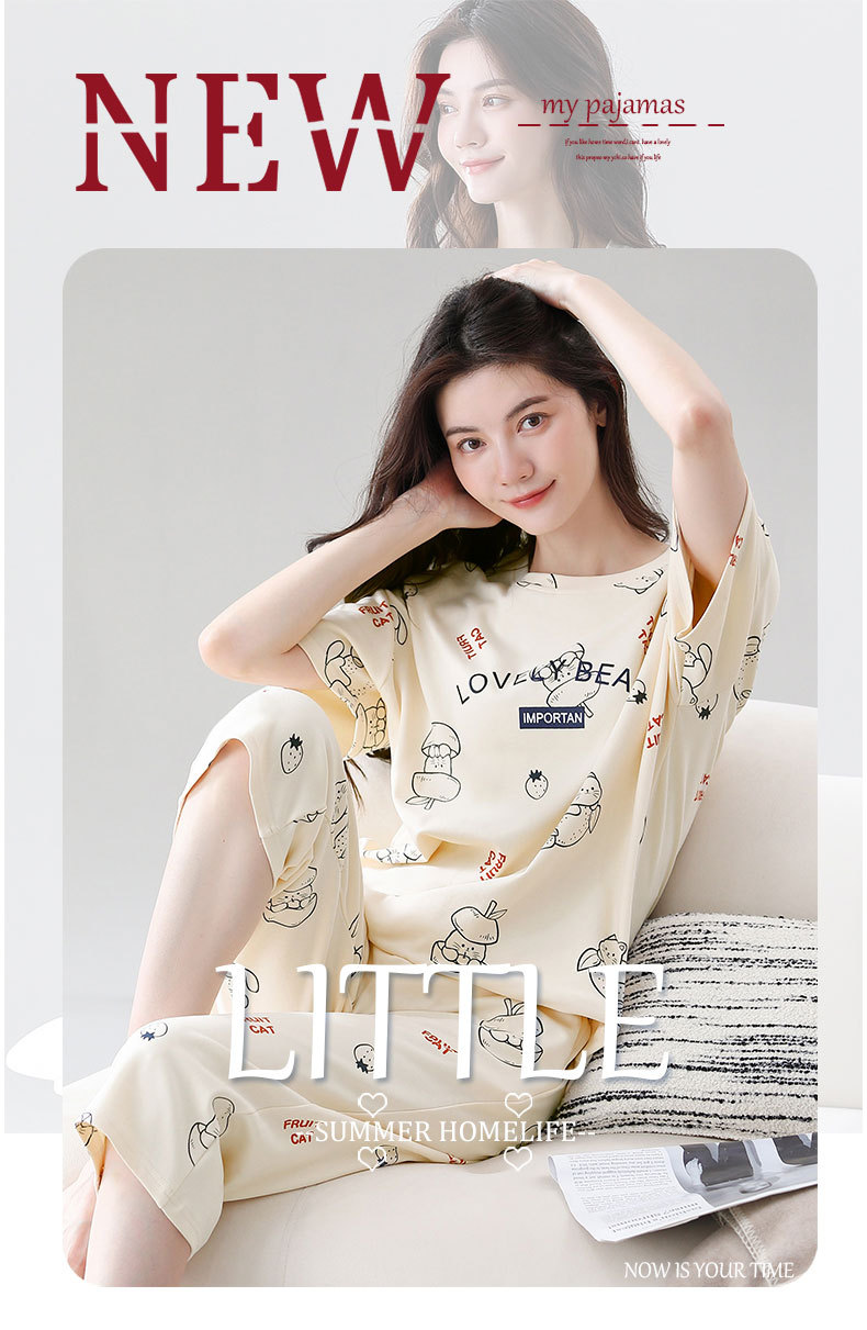 가슴 패드가 있는 여성용 100% 면 잠옷, 순면 여름용 얇은 라운드넥 반팔 7부 바지, 여름철 외출복으로도 착용 가능한 홈웨어스토어 가기