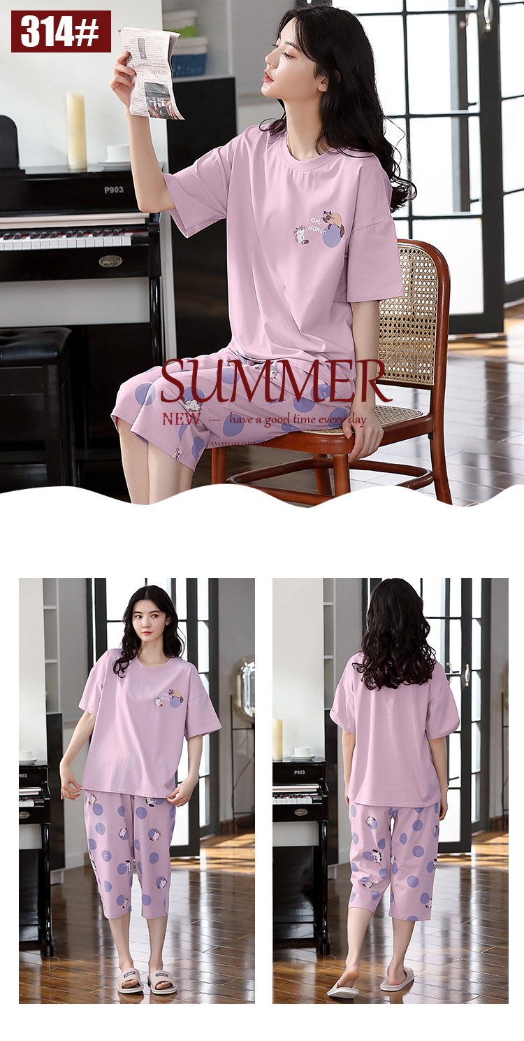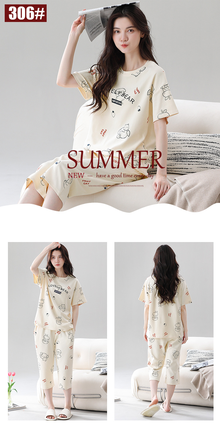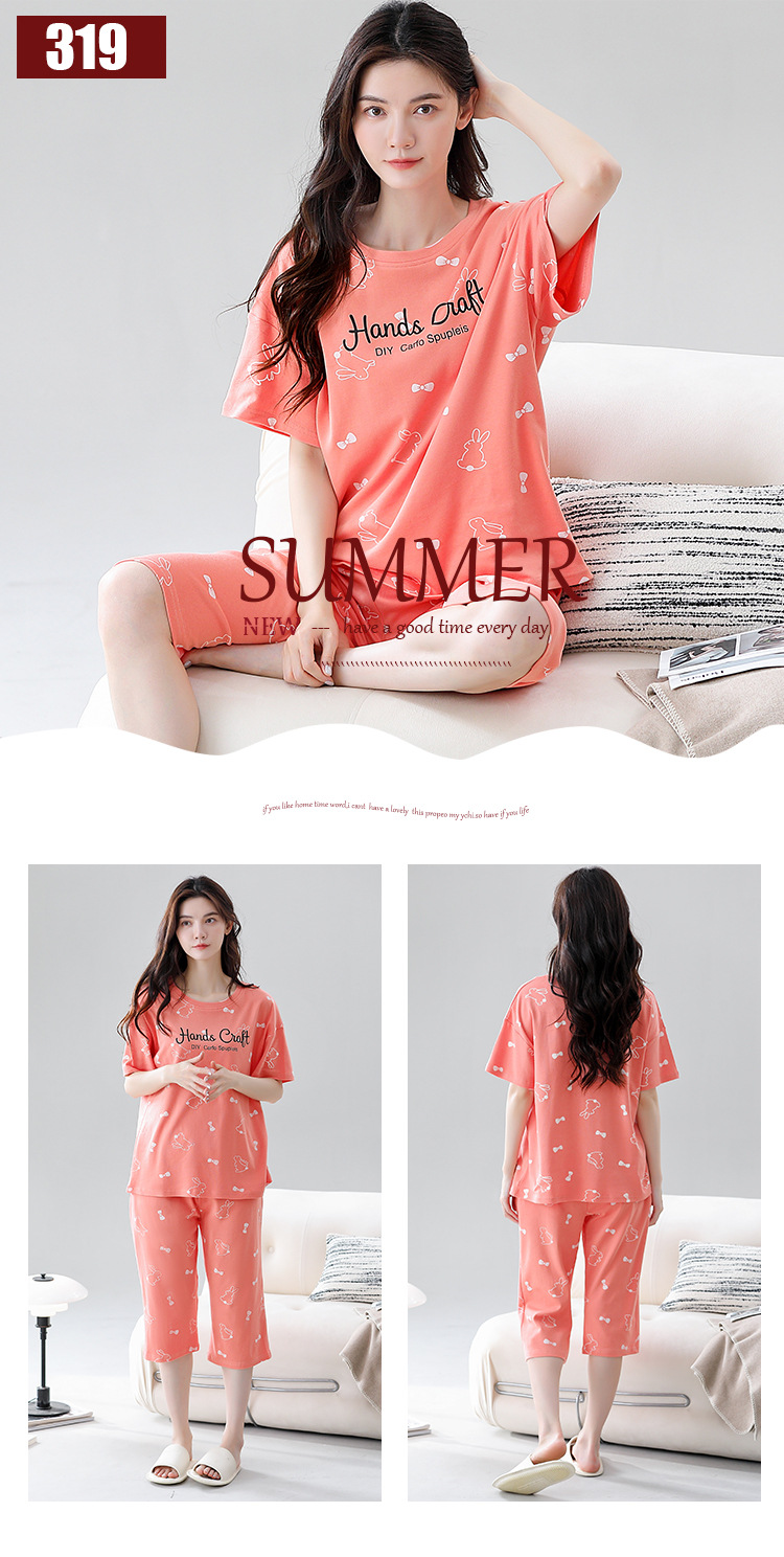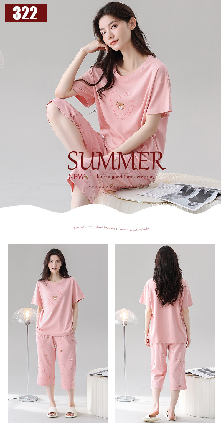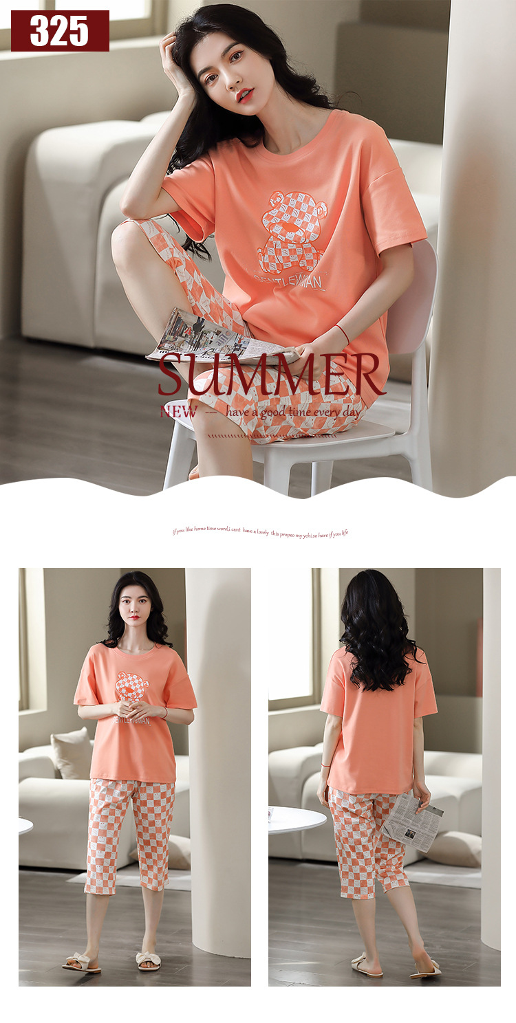 가슴 패드가 있는 여성용 100% 면 잠옷, 순면 여름용 얇은 라운드넥 반팔 7부 바지, 여름철 외출복으로도 착용 가능한 홈웨어스토어 가기