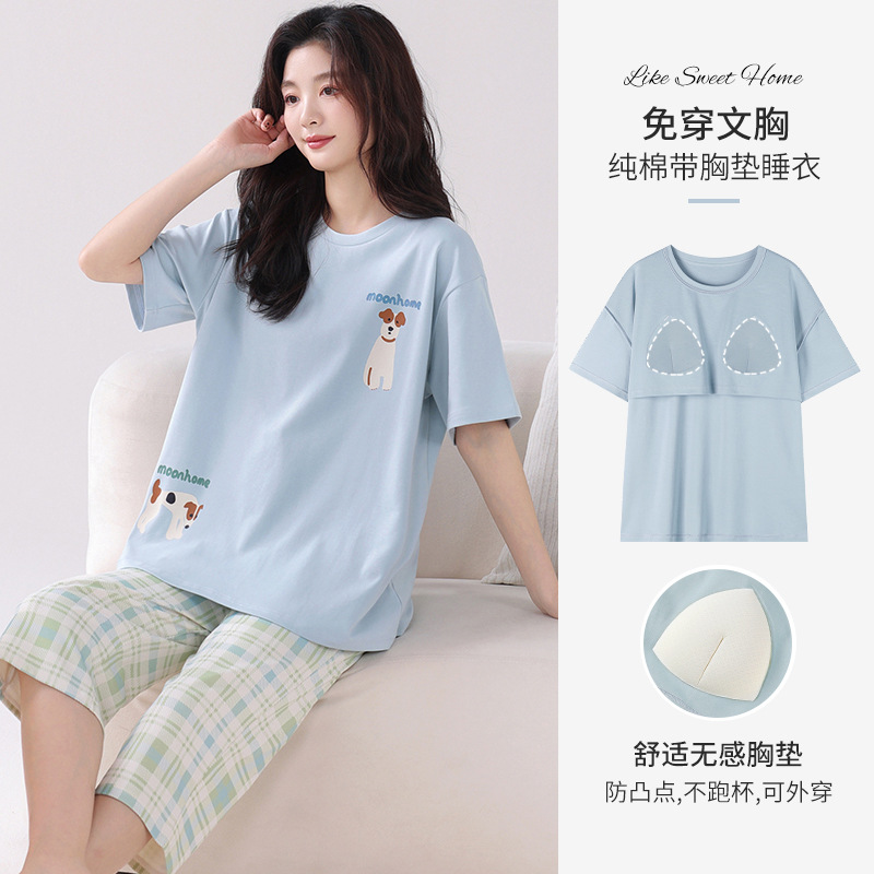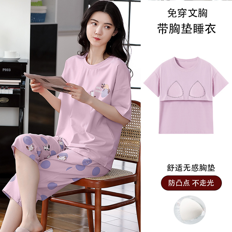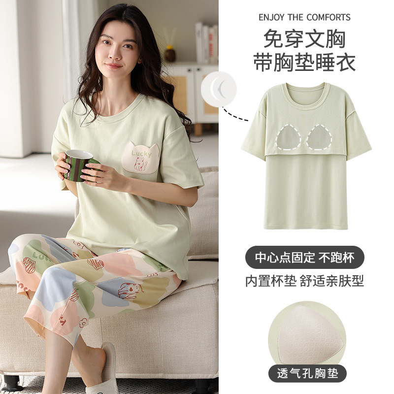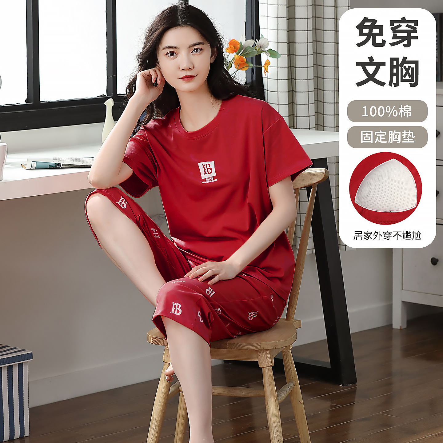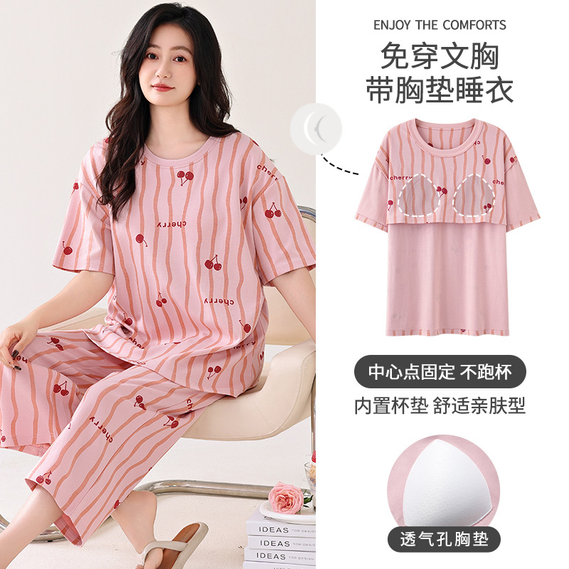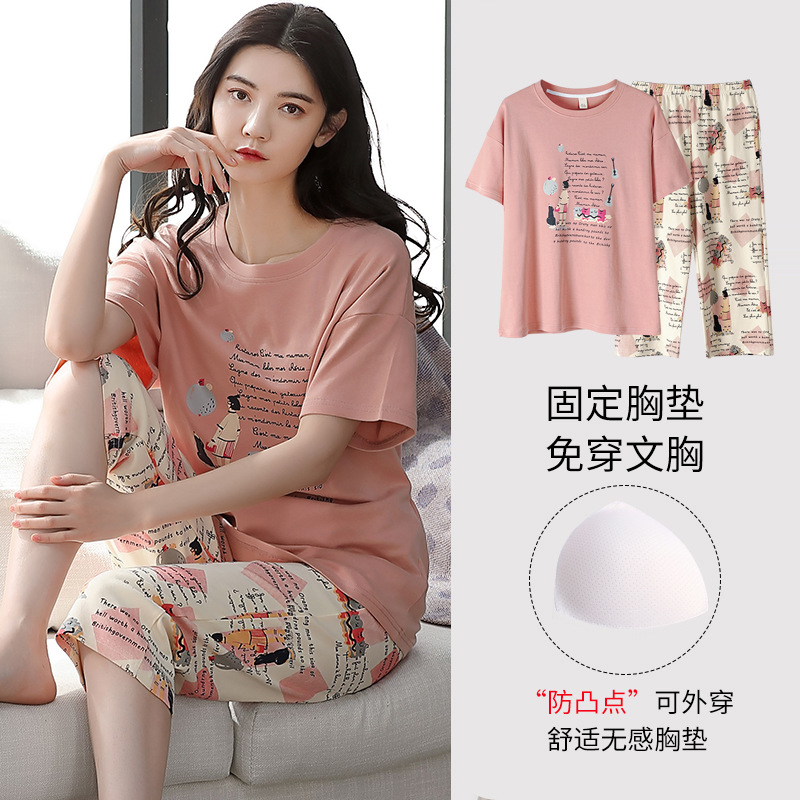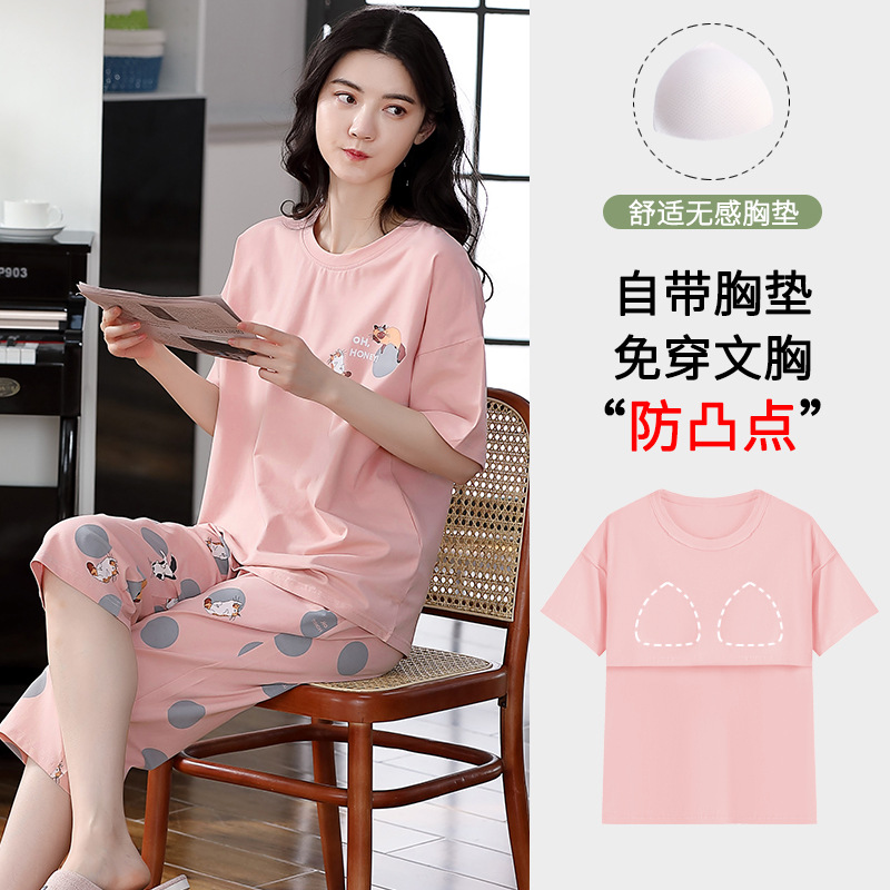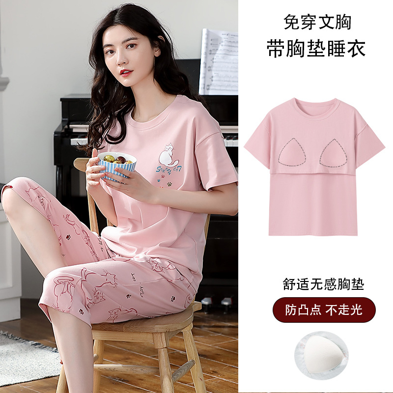 가슴 패드가 있는 여성용 100% 면 잠옷, 순면 여름용 얇은 라운드넥 반팔 7부 바지, 여름철 외출복으로도 착용 가능한 홈웨어