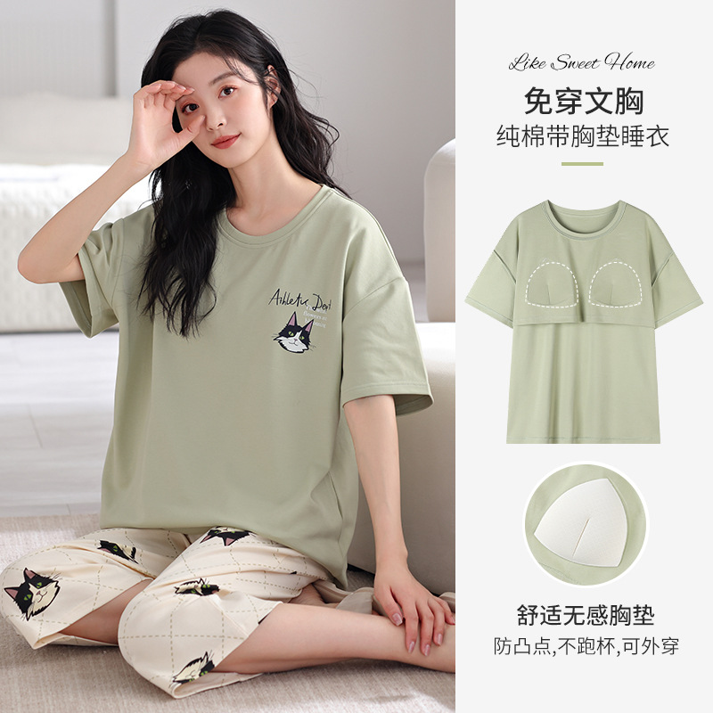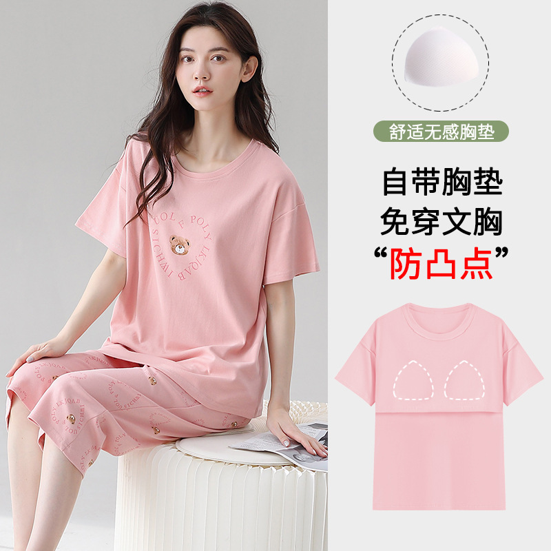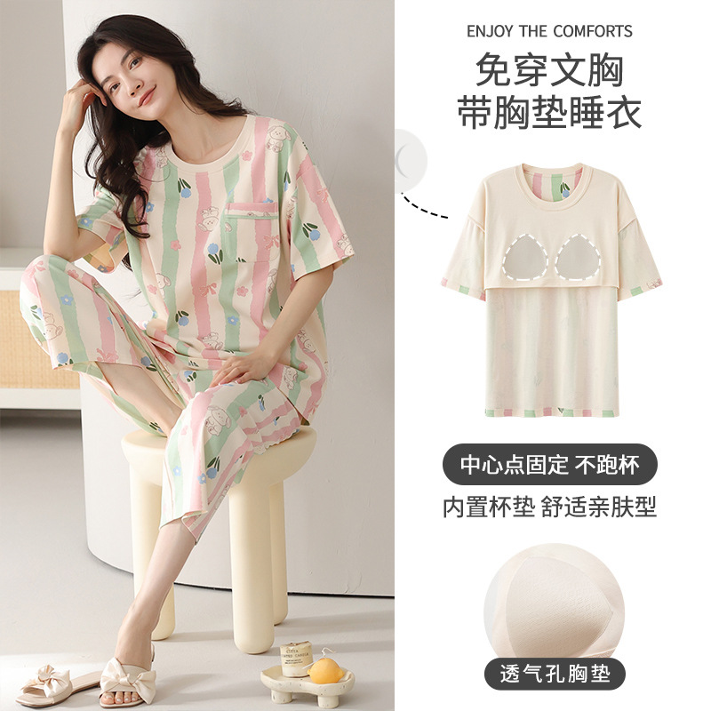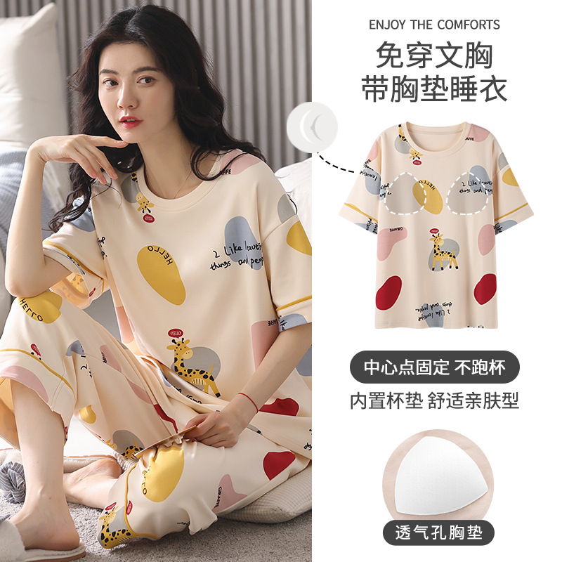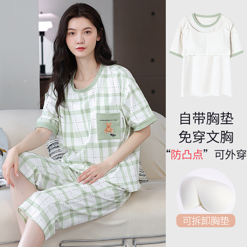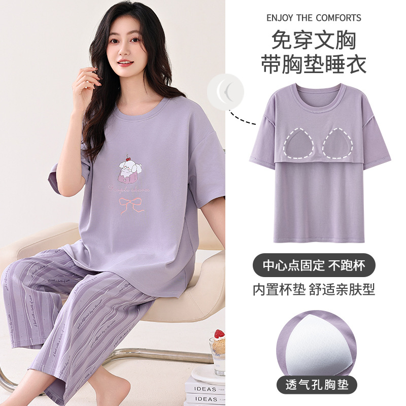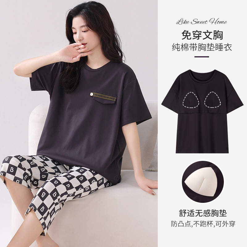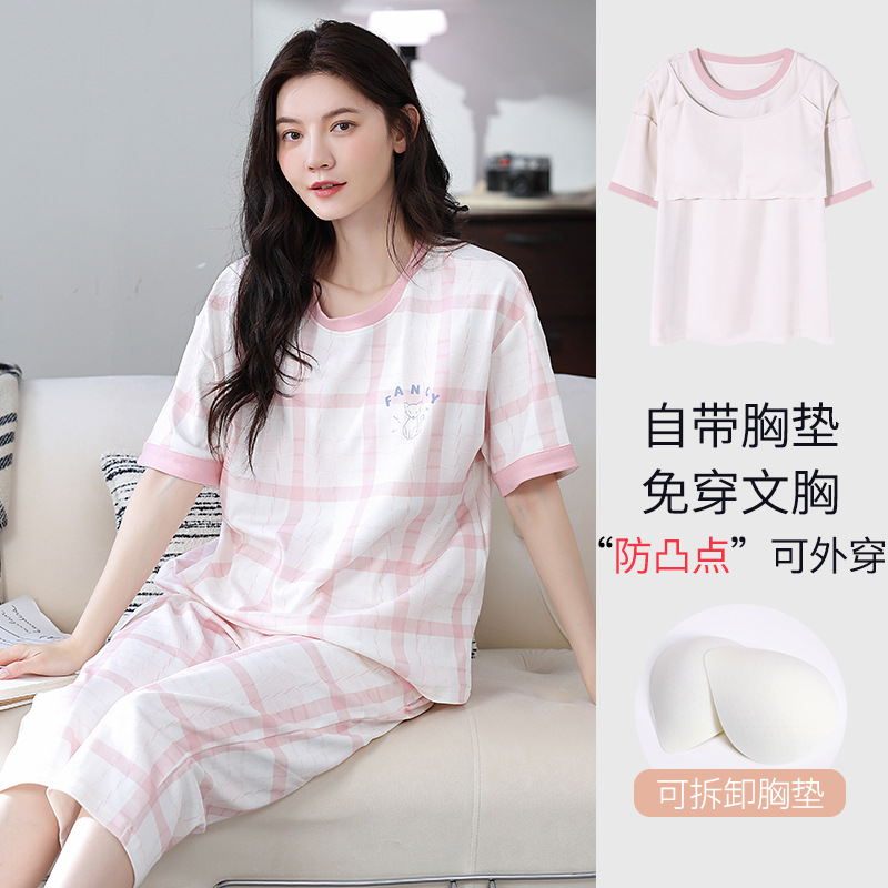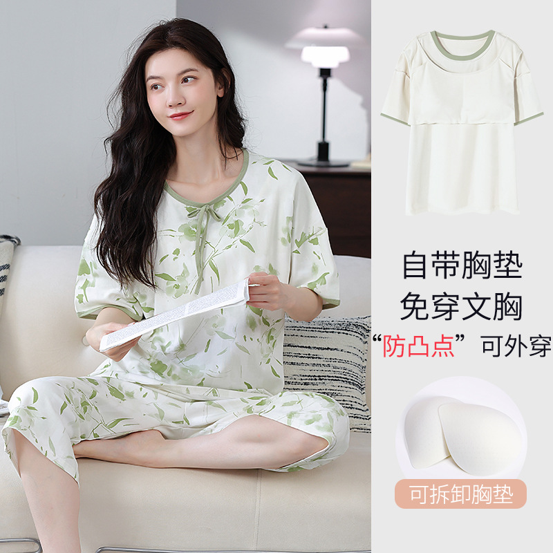 가슴 패드가 있는 여성용 100% 면 잠옷, 순면 여름용 얇은 라운드넥 반팔 7부 바지, 여름철 외출복으로도 착용 가능한 홈웨어