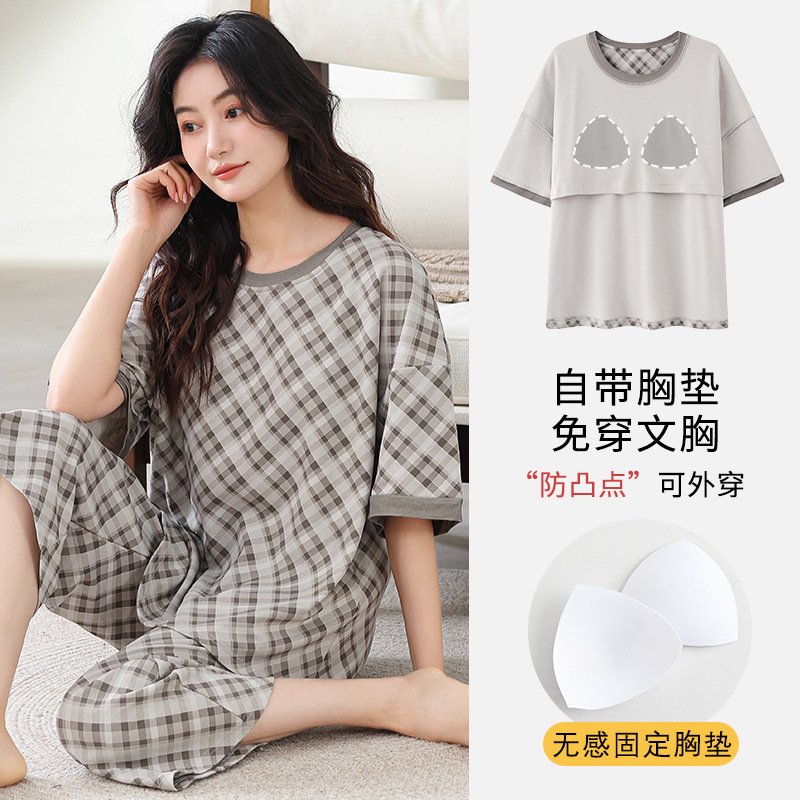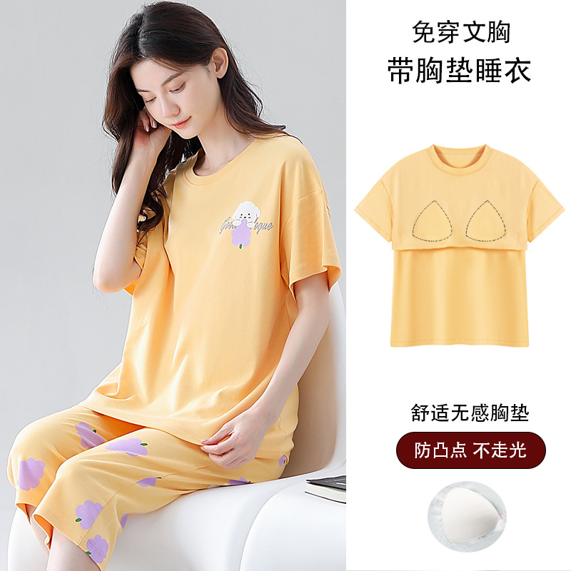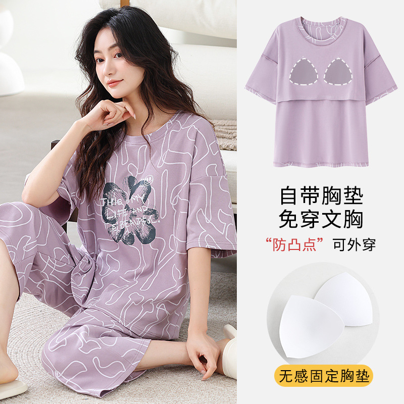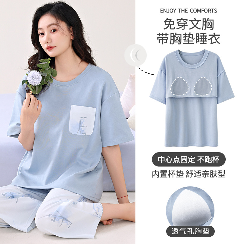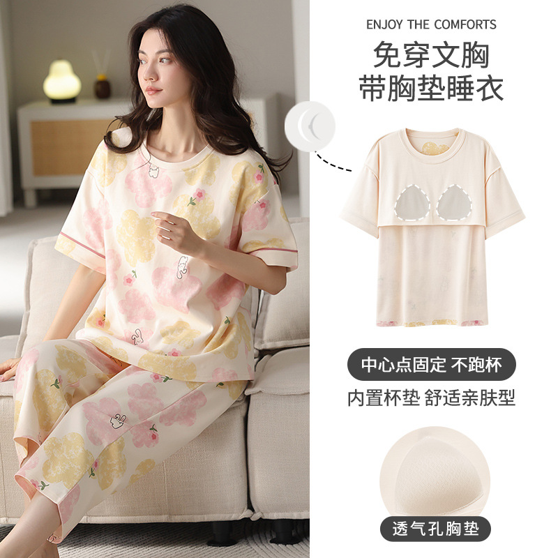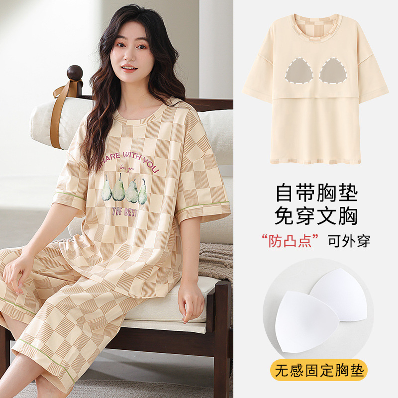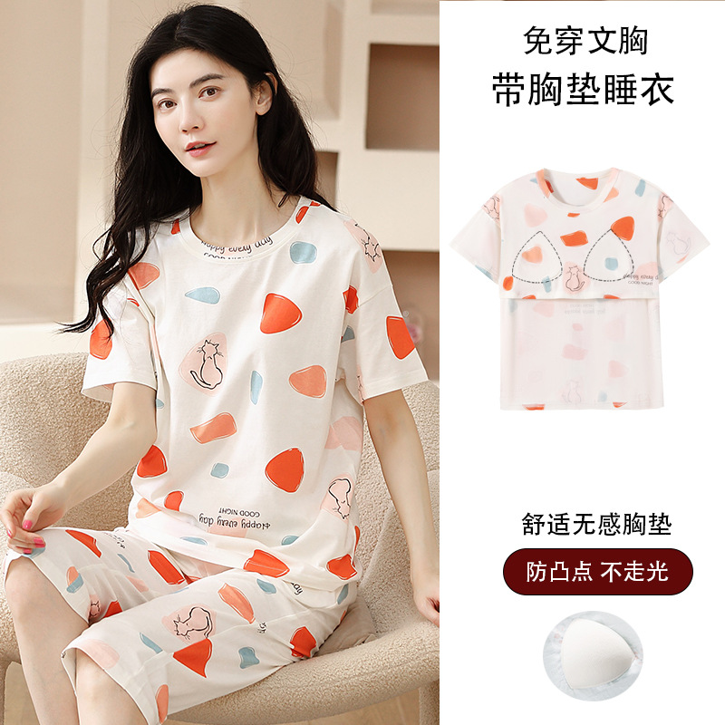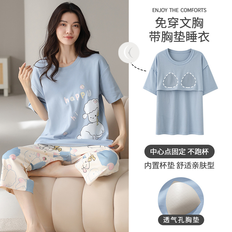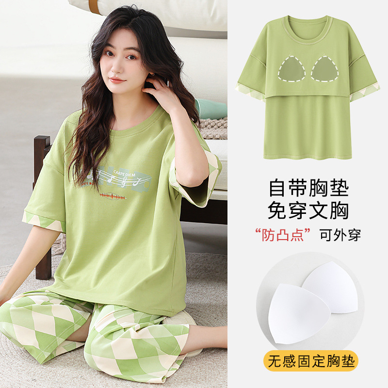 가슴 패드가 있는 여성용 100% 면 잠옷, 순면 여름용 얇은 라운드넥 반팔 7부 바지, 여름철 외출복으로도 착용 가능한 홈웨어