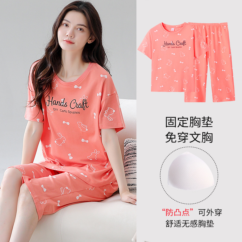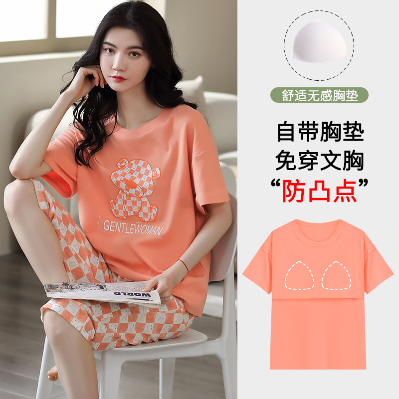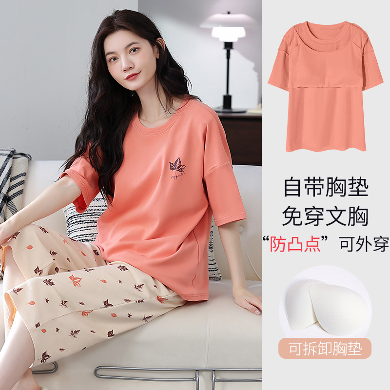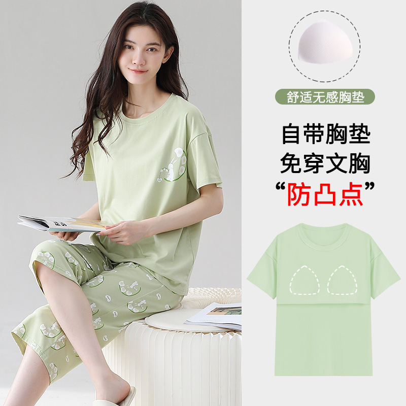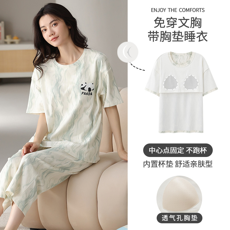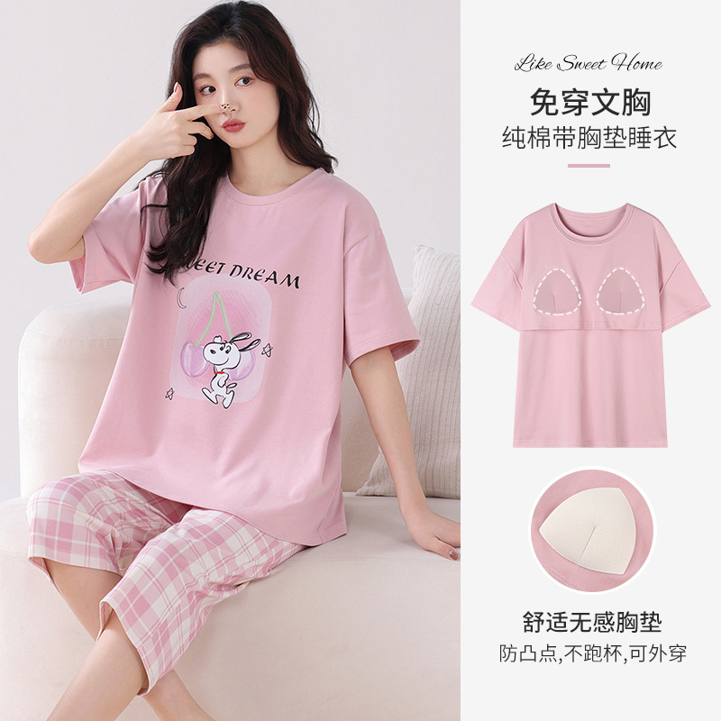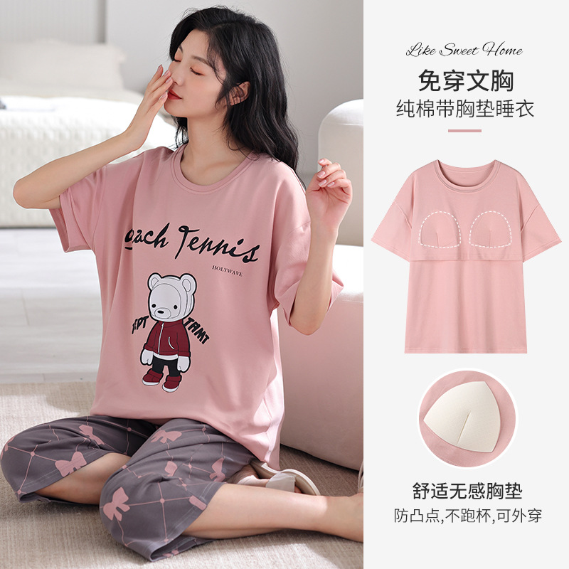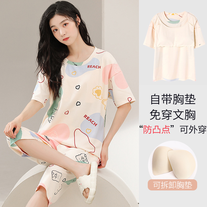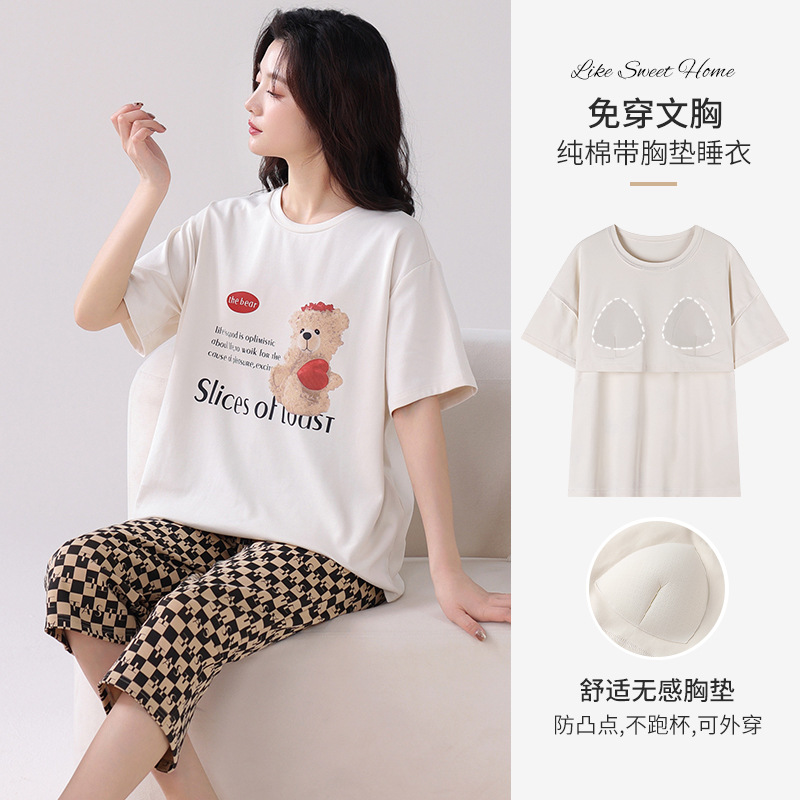 가슴 패드가 있는 여성용 100% 면 잠옷, 순면 여름용 얇은 라운드넥 반팔 7부 바지, 여름철 외출복으로도 착용 가능한 홈웨어