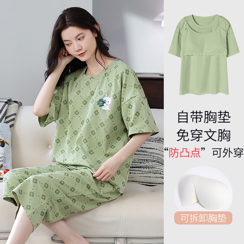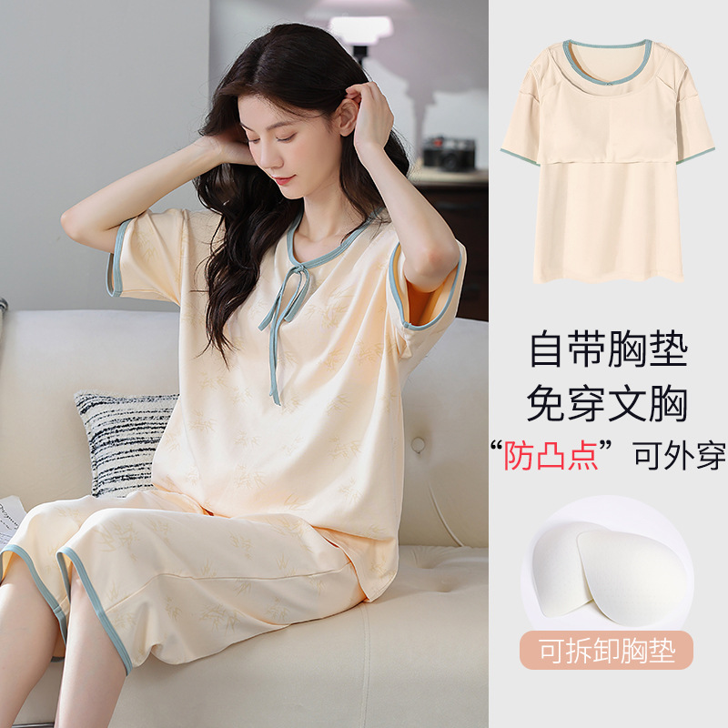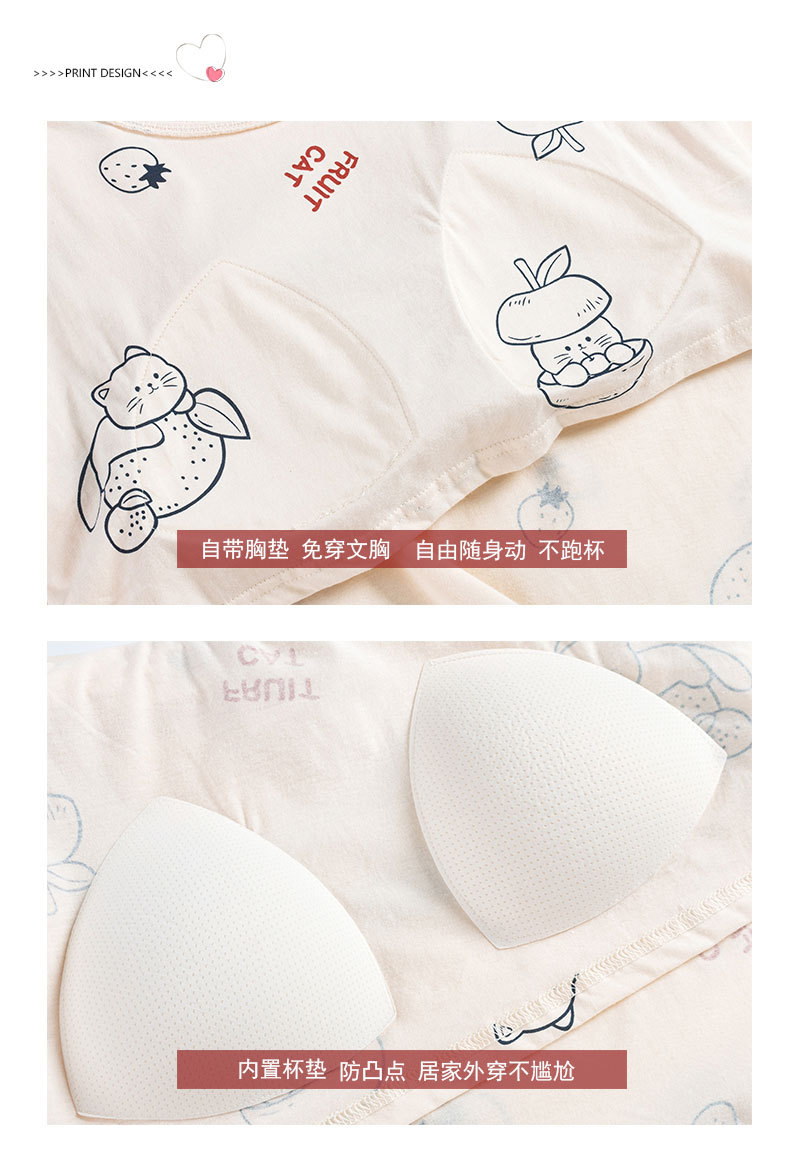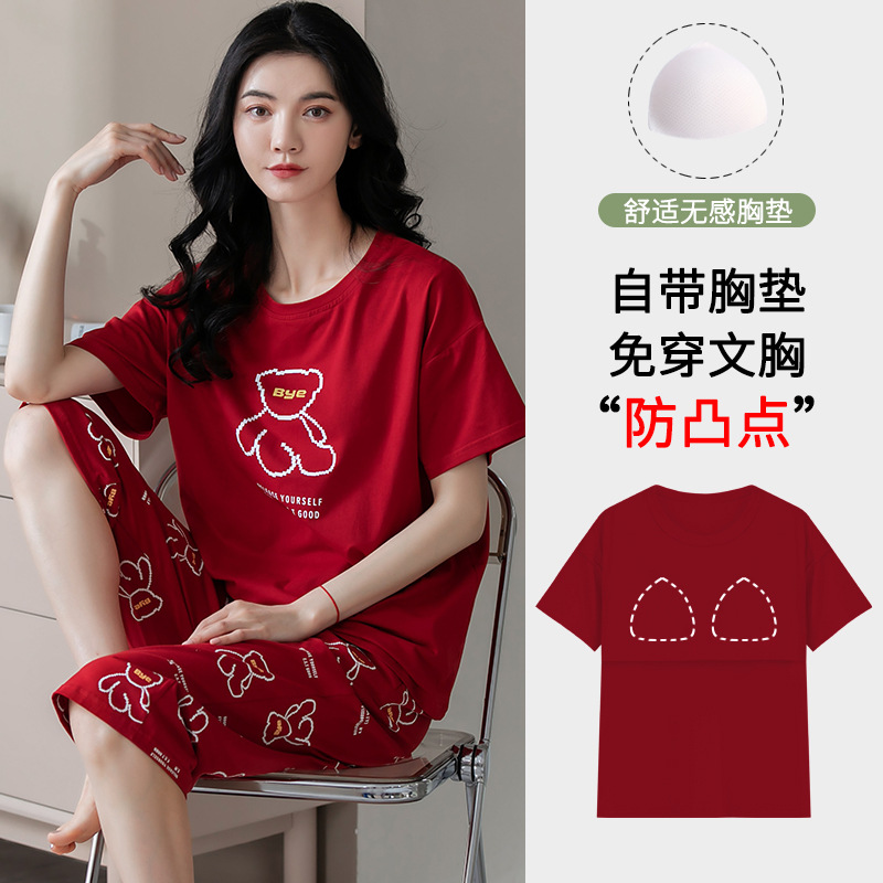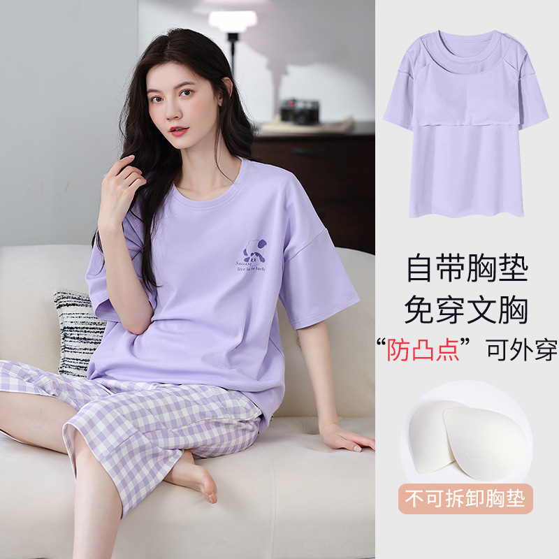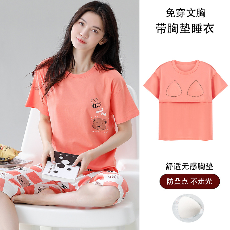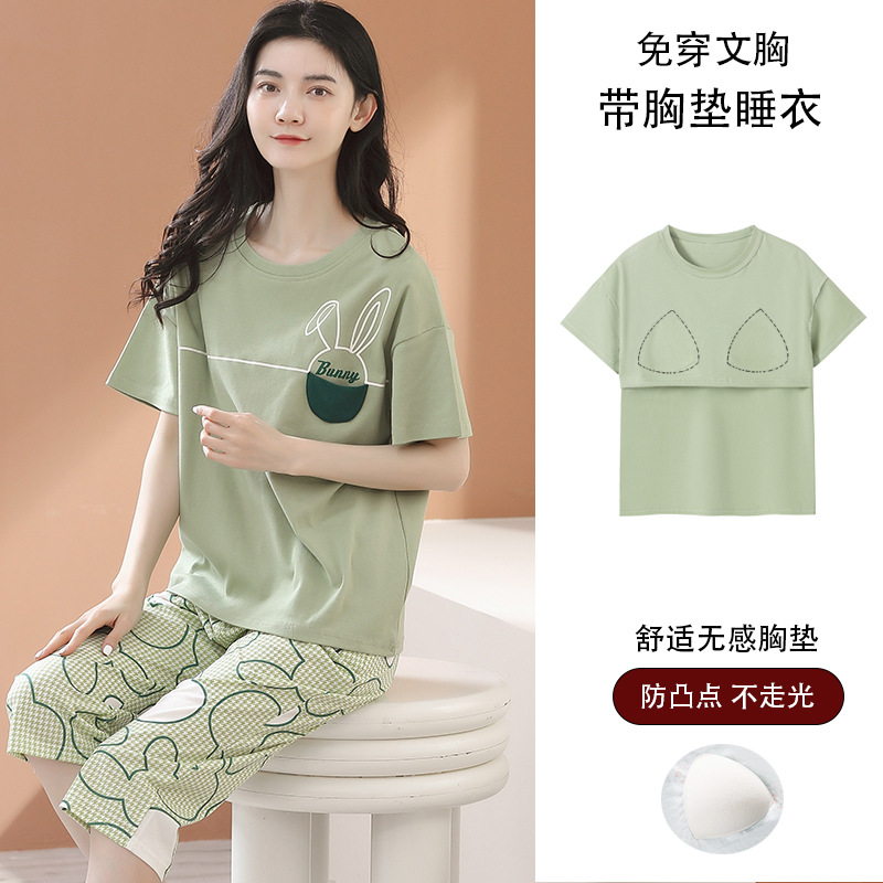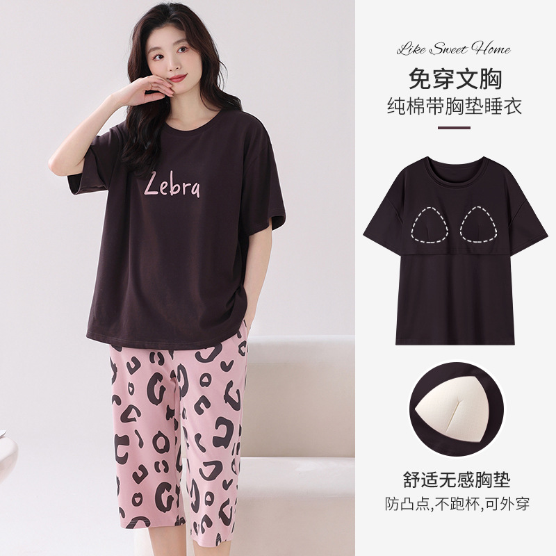 가슴 패드가 있는 여성용 100% 면 잠옷, 순면 여름용 얇은 라운드넥 반팔 7부 바지, 여름철 외출복으로도 착용 가능한 홈웨어