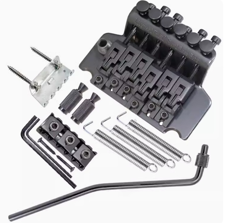 此套颤音系统包含:颤音摇把1根、弹簧拉钩1个、拉钩螺丝2个、弦锁1个、弦锁安装螺丝2个、拉钩弹簧3根、升降螺丝2个、3MM扳手1个、2.5MM扳手1个、拉弦板1块。共10样商品!