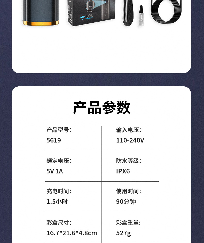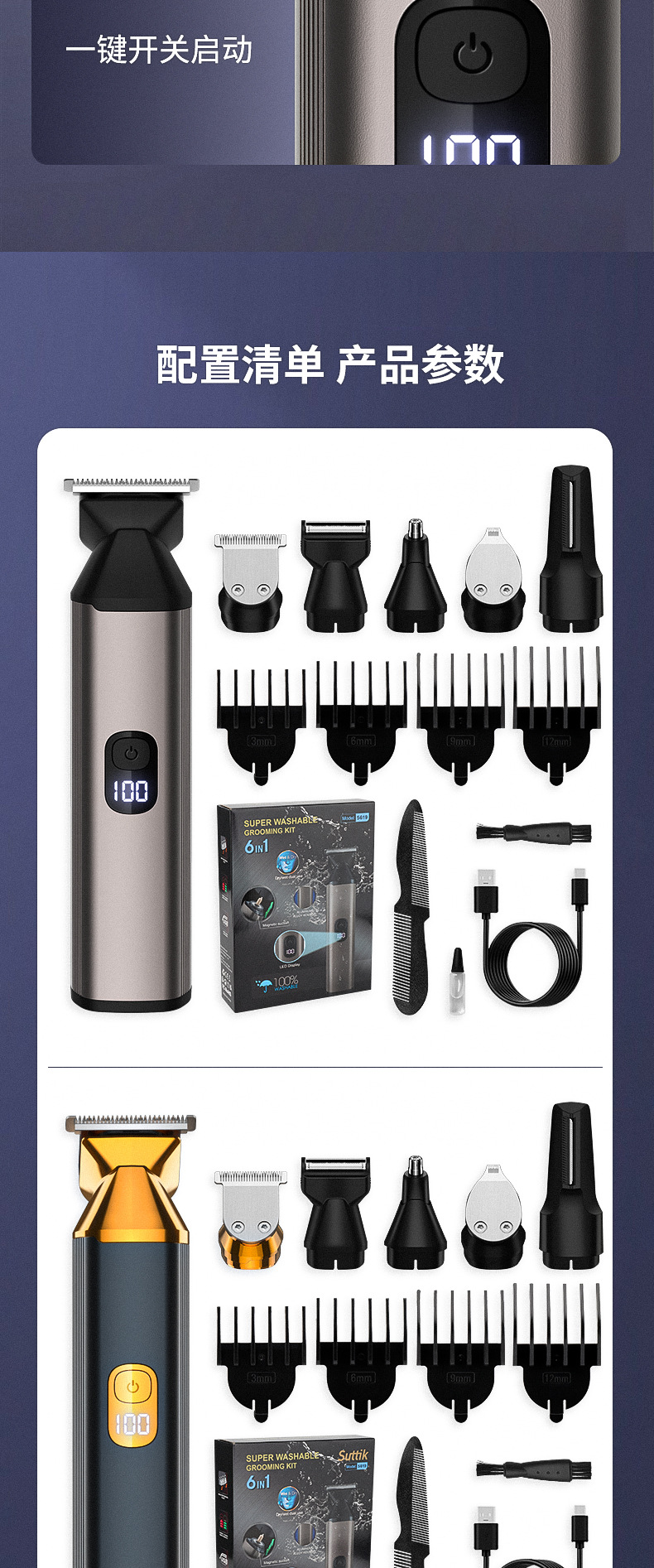 产品配件:主机+理发刀头+雕刻刀头+鼻毛修剪器+鬓角刀头+体毛刀头+英文说明书+type-c充电线+清洁刷+梳子+润滑油+限位梳*4(3.6.9.12)mm