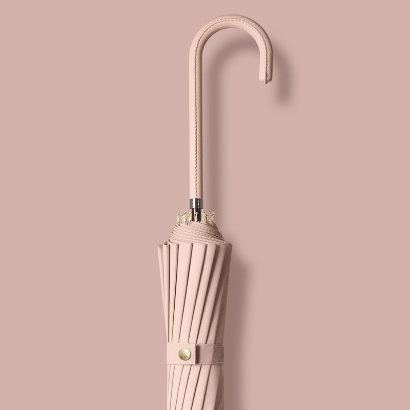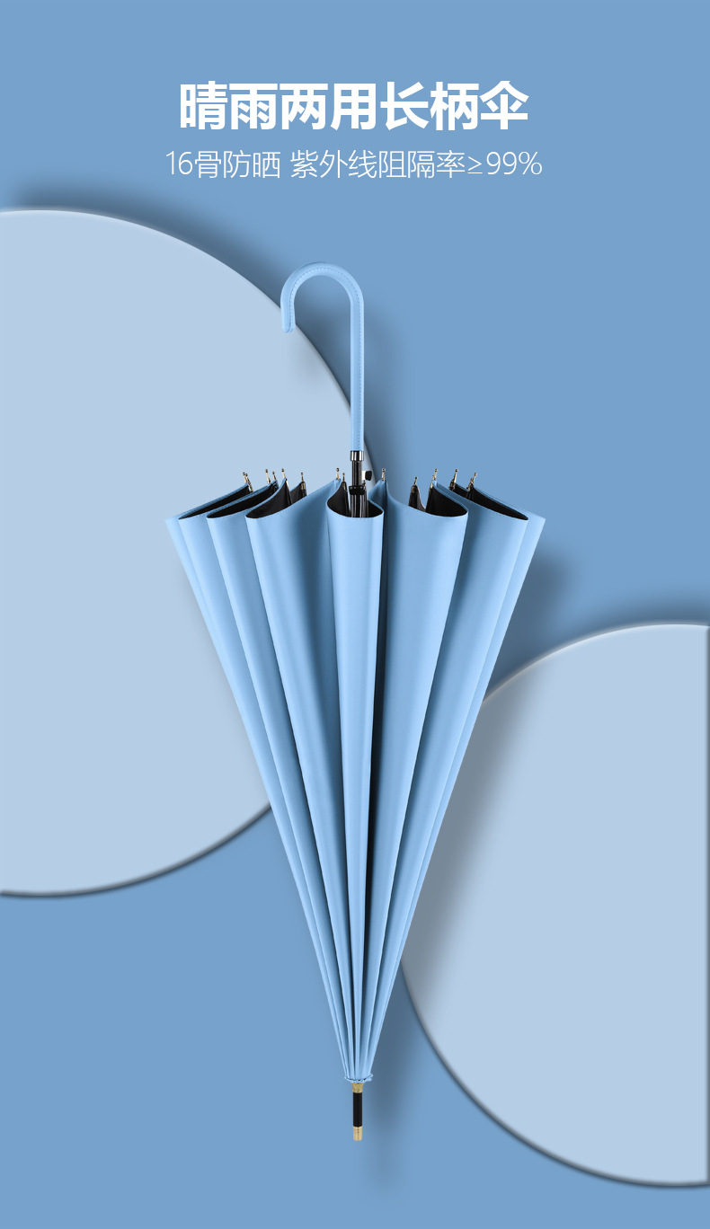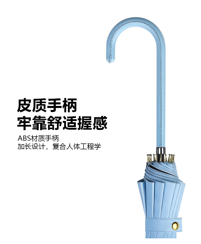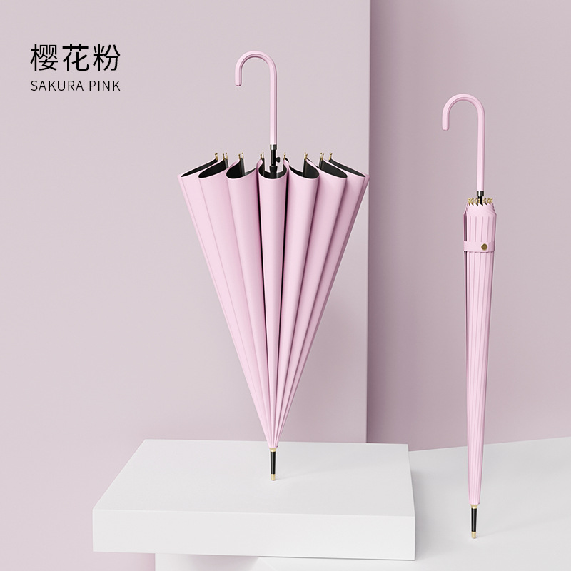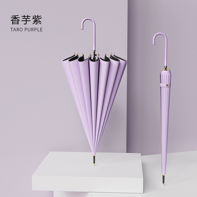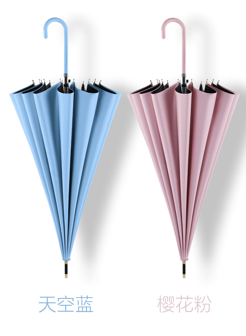 신선한 가죽 곡선 핸들 16 뼈 직선 우산 검은 접착제 태양 보호 자외선 차양 우산 비 및 비 이중 사용 긴 핸들 광고