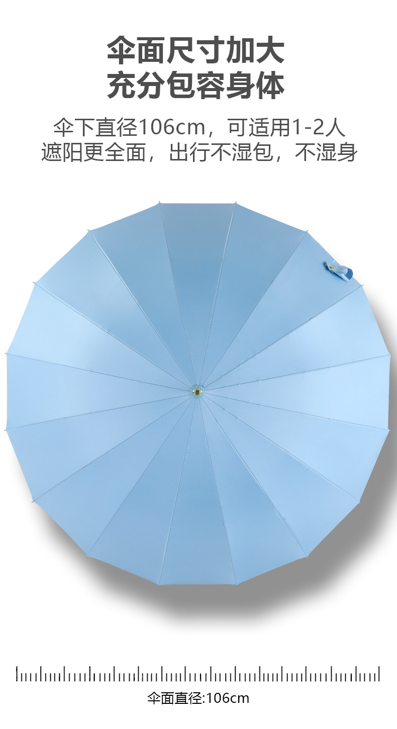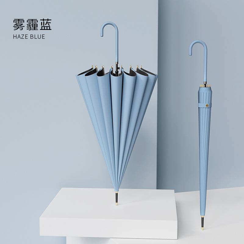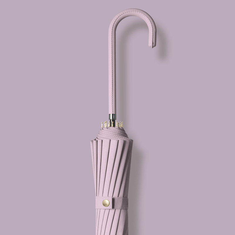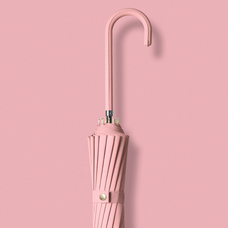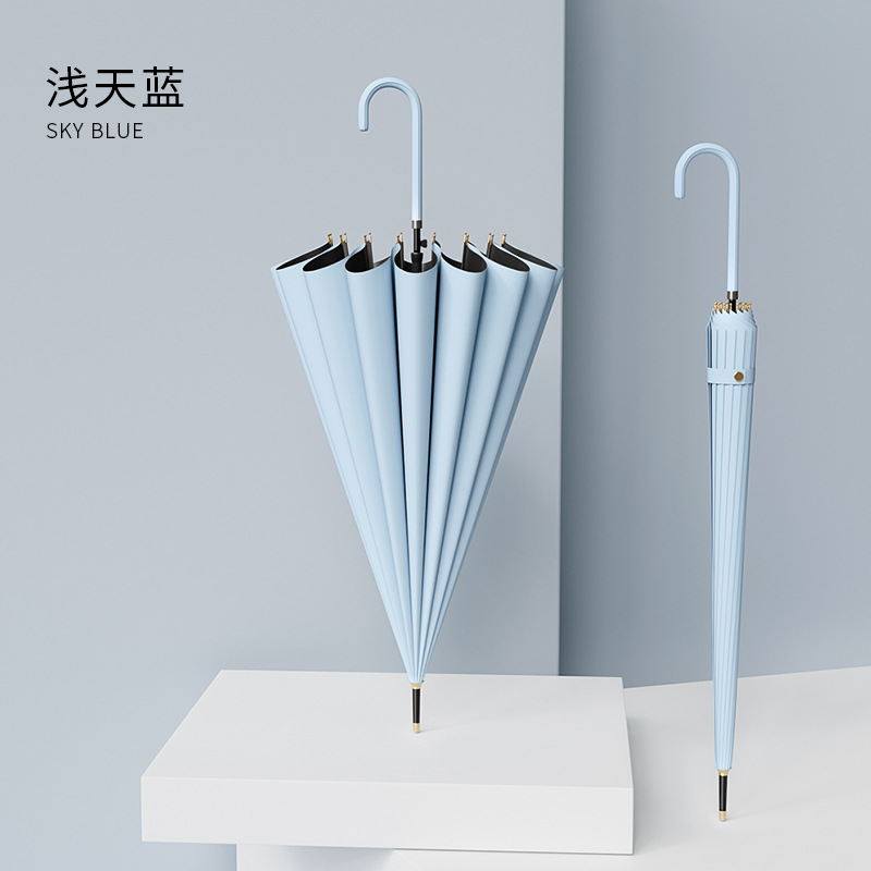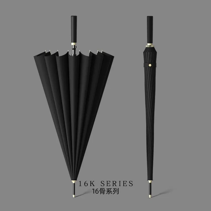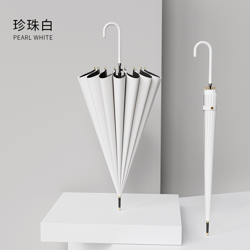 신선한 가죽 곡선 핸들 16 뼈 직선 우산 검은 접착제 태양 보호 자외선 차양 우산 비 및 비 이중 사용 긴 핸들 광고