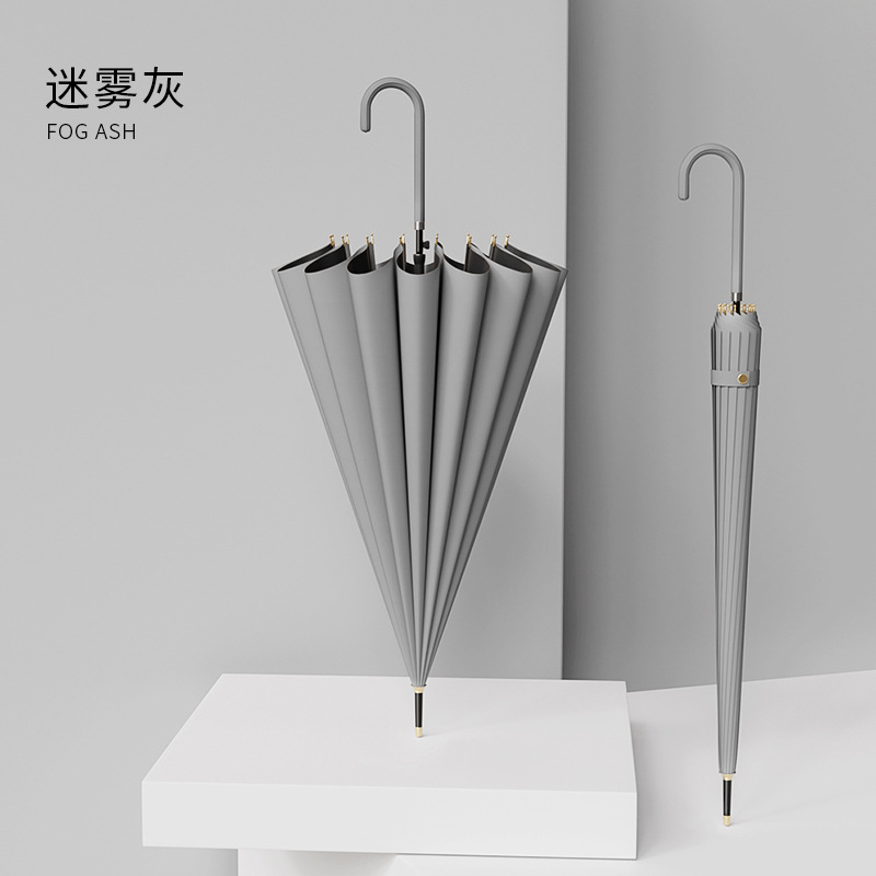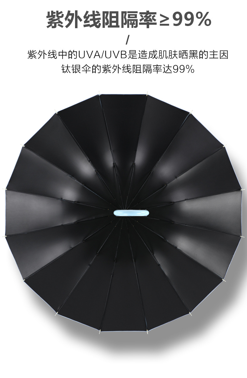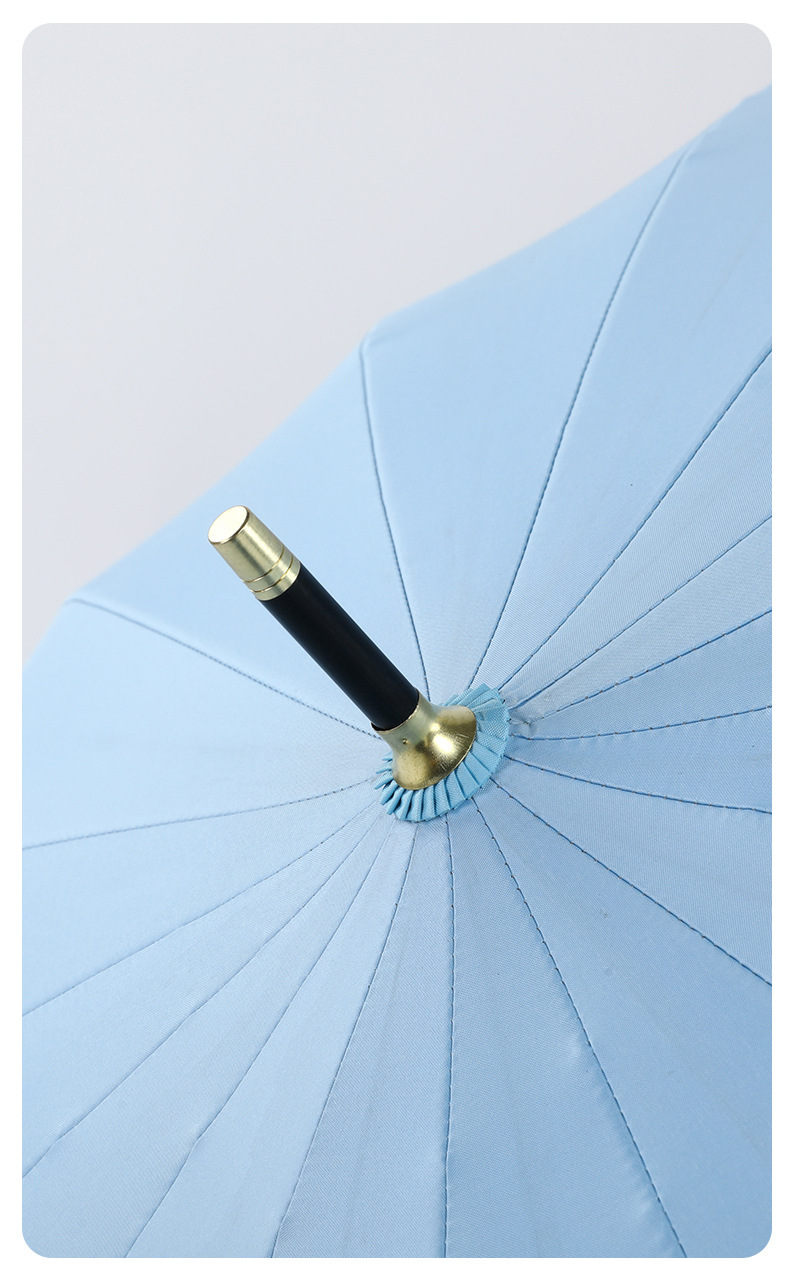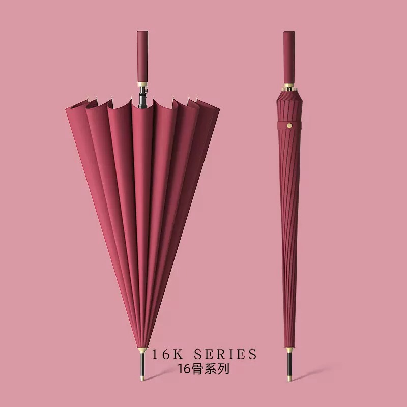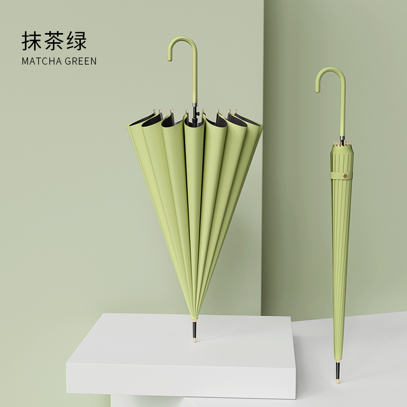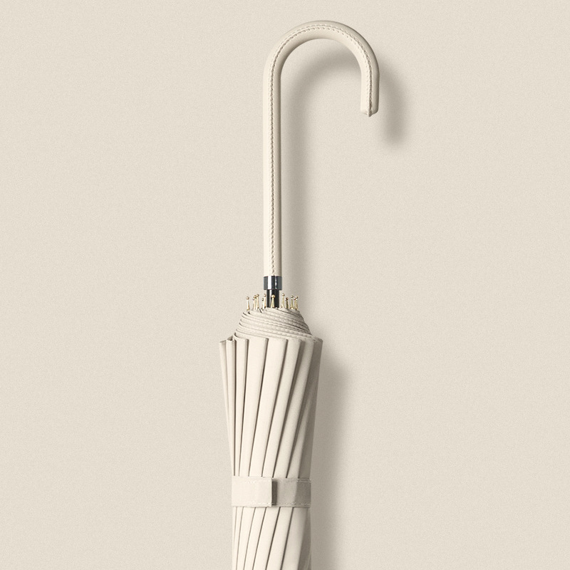 신선한 가죽 곡선 핸들 16 뼈 직선 우산 검은 접착제 태양 보호 자외선 차양 우산 비 및 비 이중 사용 긴 핸들 광고