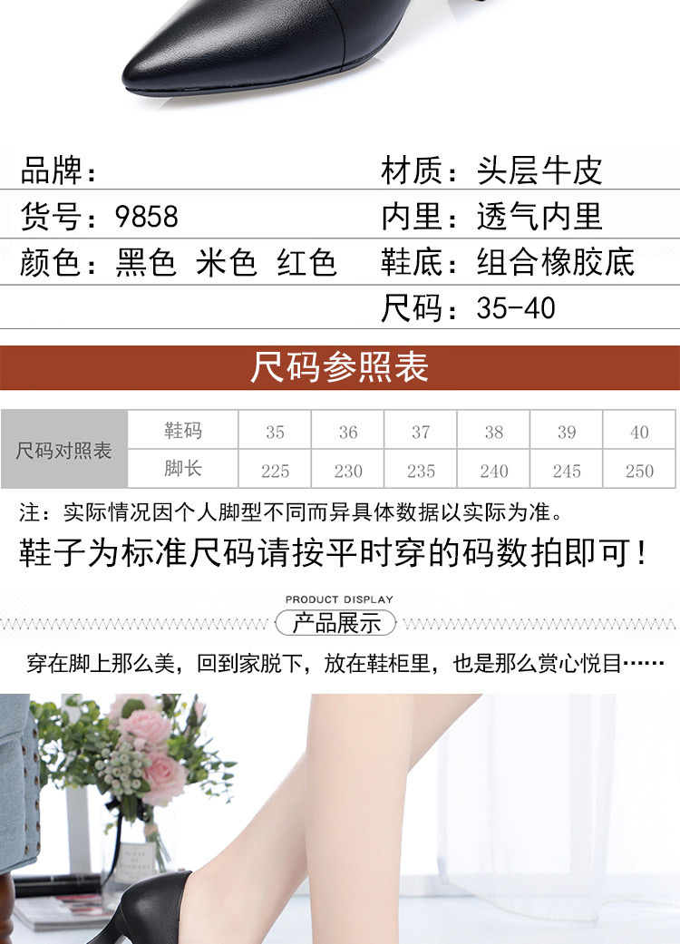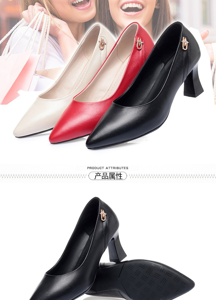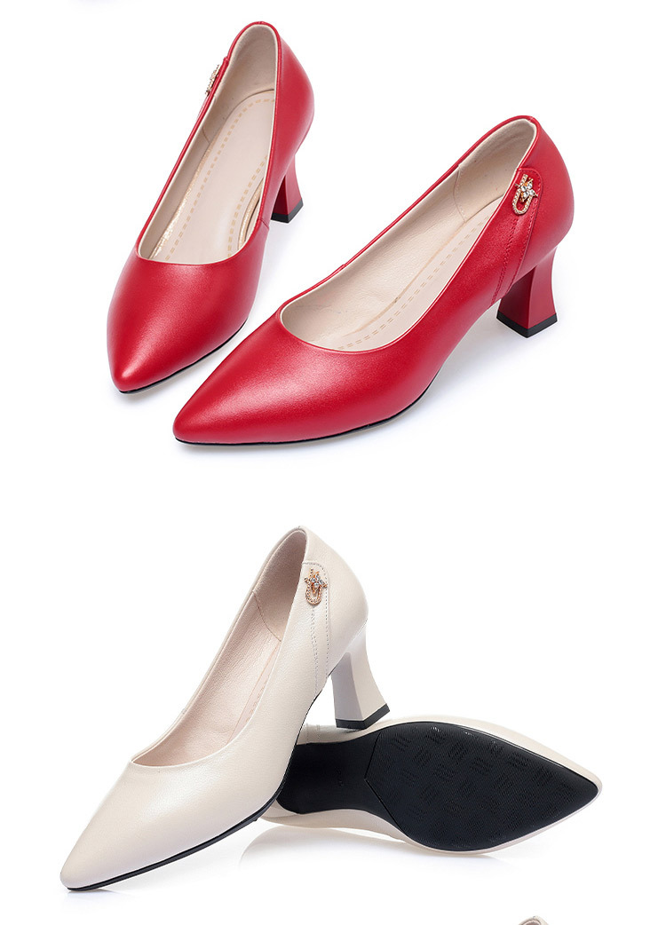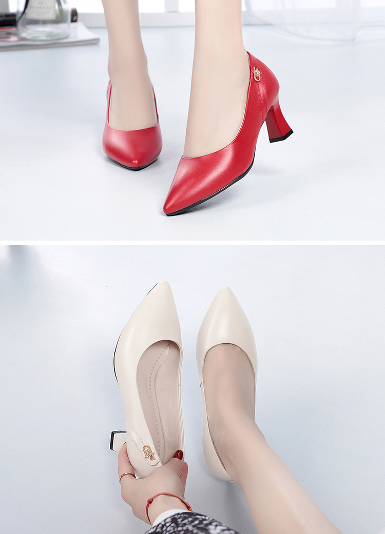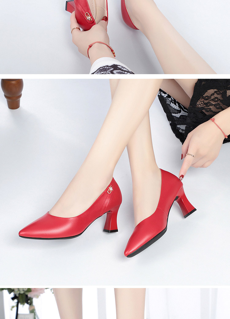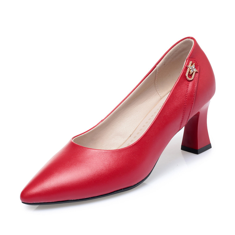 레드 싱글 레이어 신발 여성의 부드러운 가죽 청키 힐 미드 힐 가죽 로우 입 미끄럼 방지 가죽 신발 봄과 여름 하이힐 부드러운 바닥 뾰족한 여성 신발