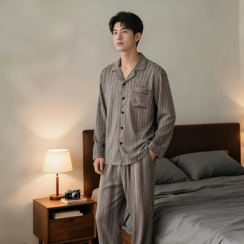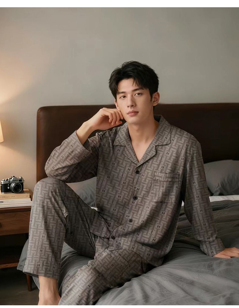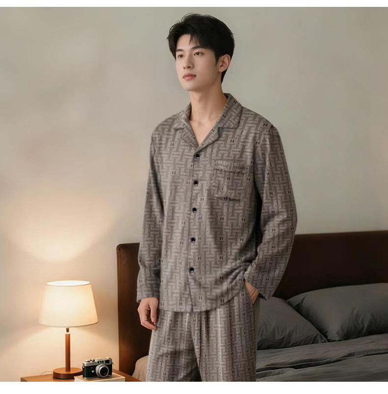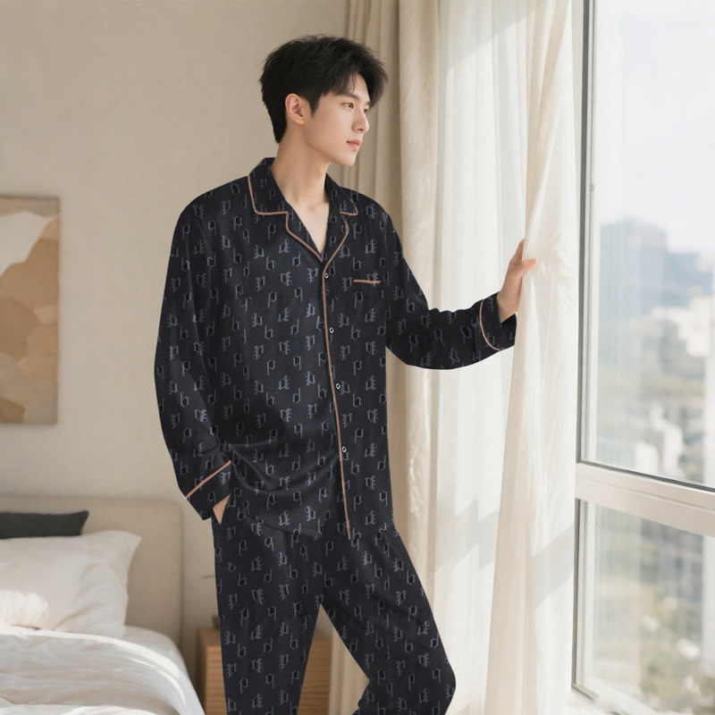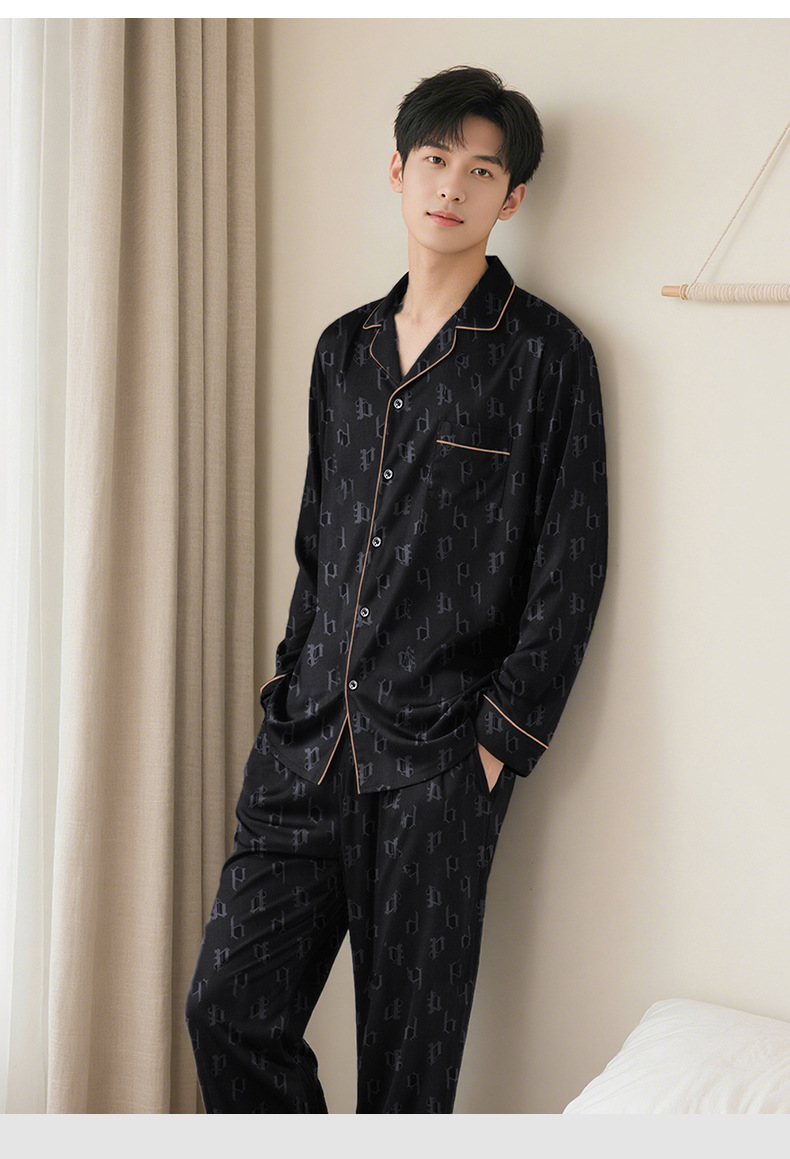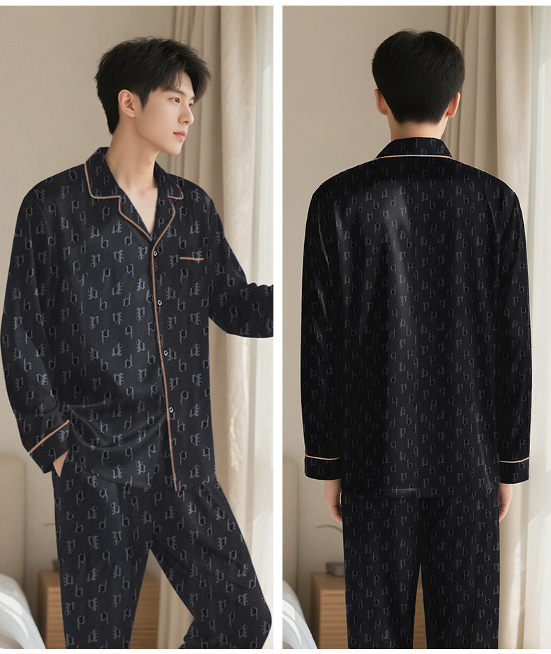 24 새로운 커플 아이스 실크 파자마 더블 바지 포켓 패션 간단한 기하학적 남성 긴팔 여성용 세트 홈웨어