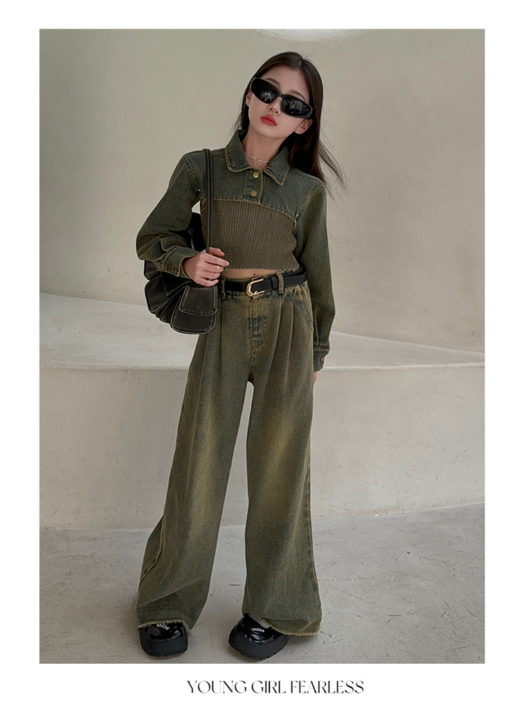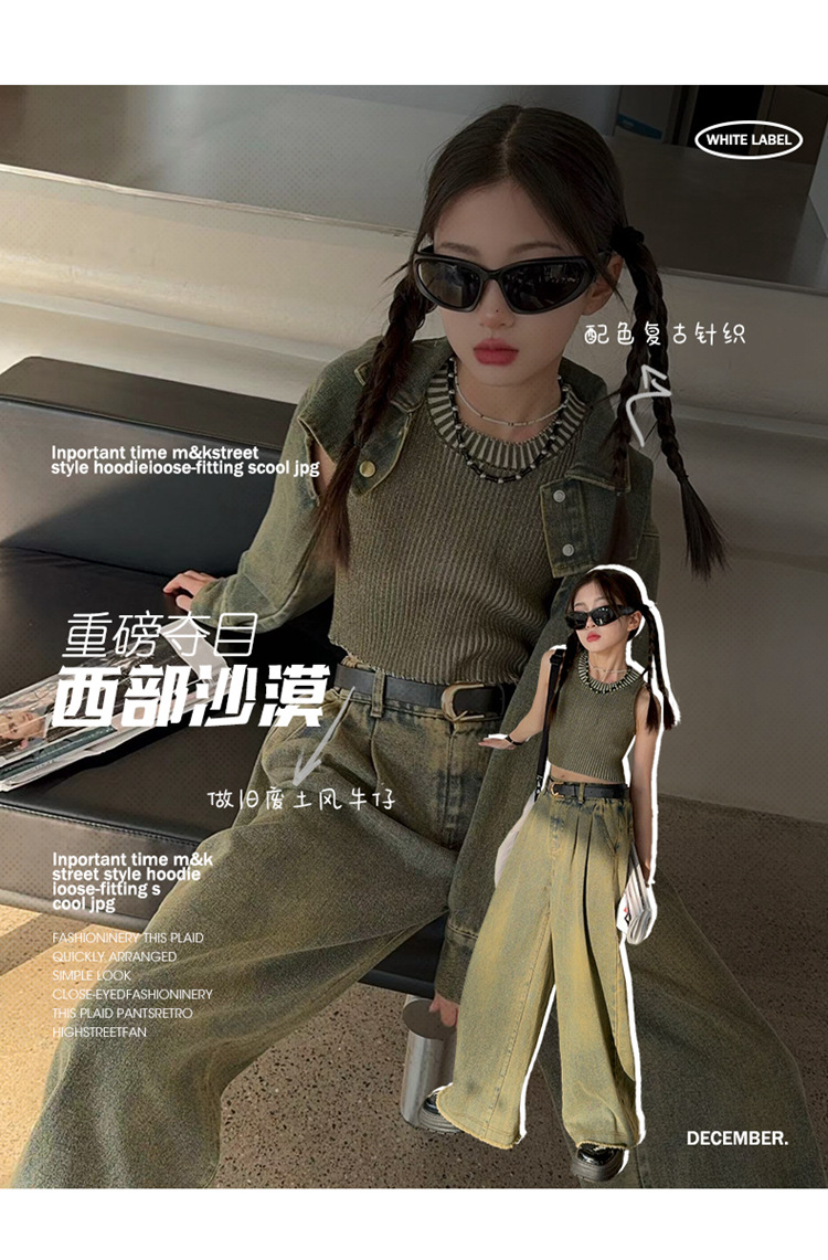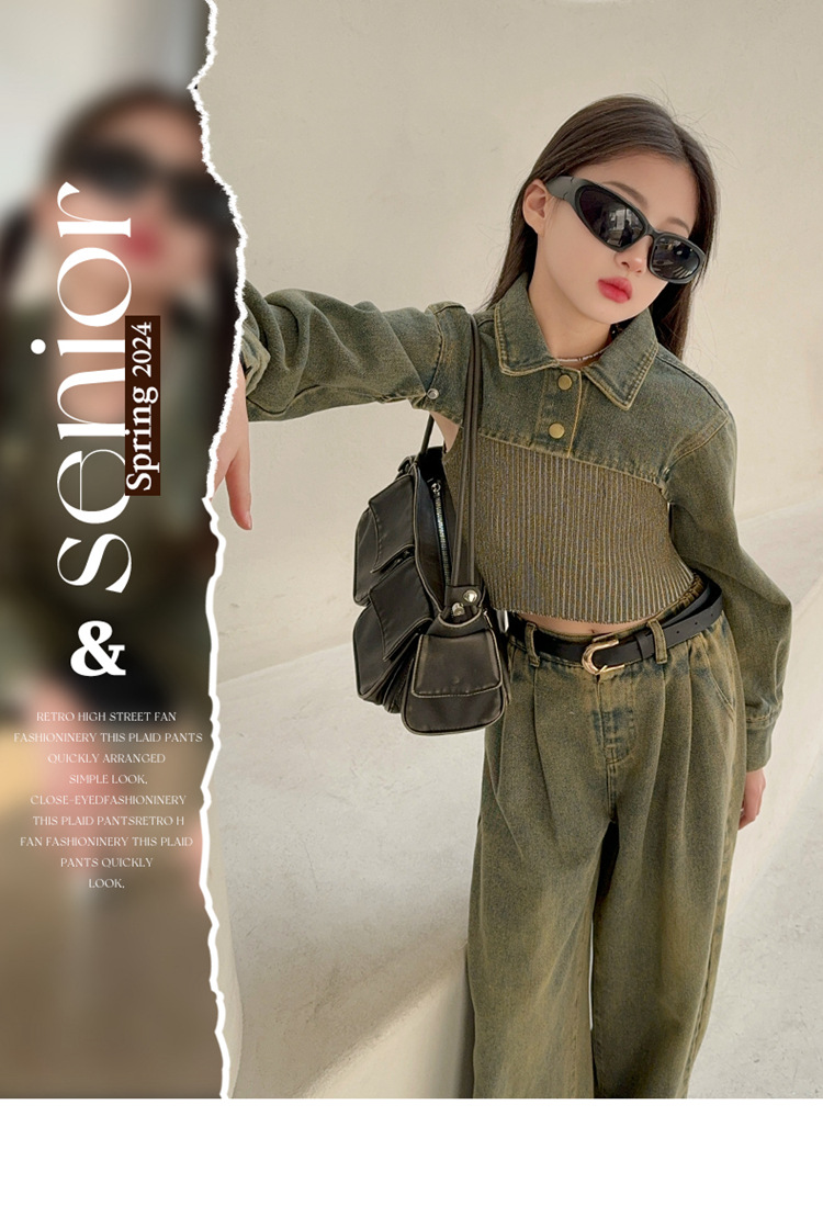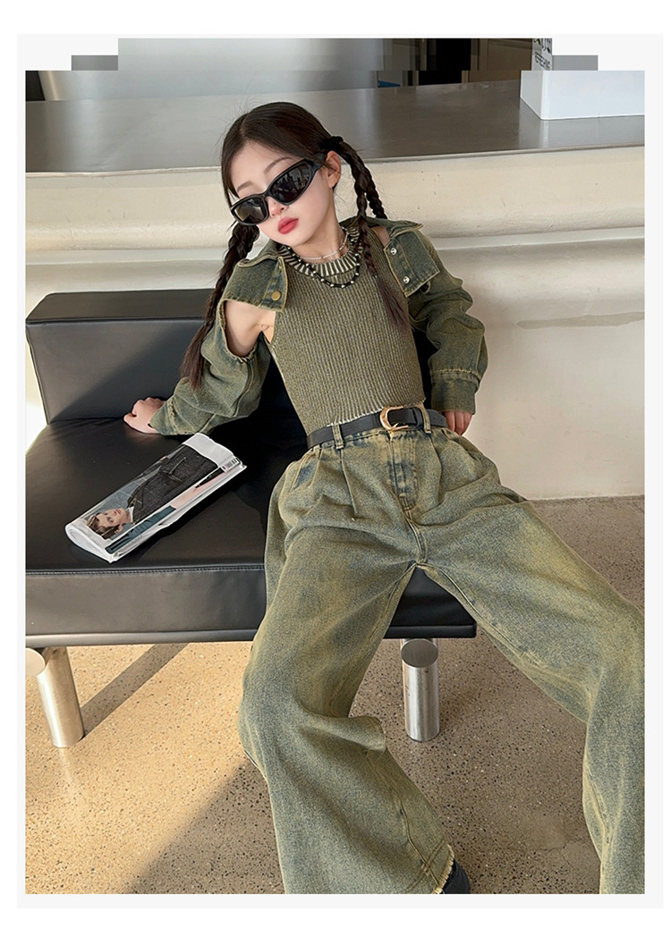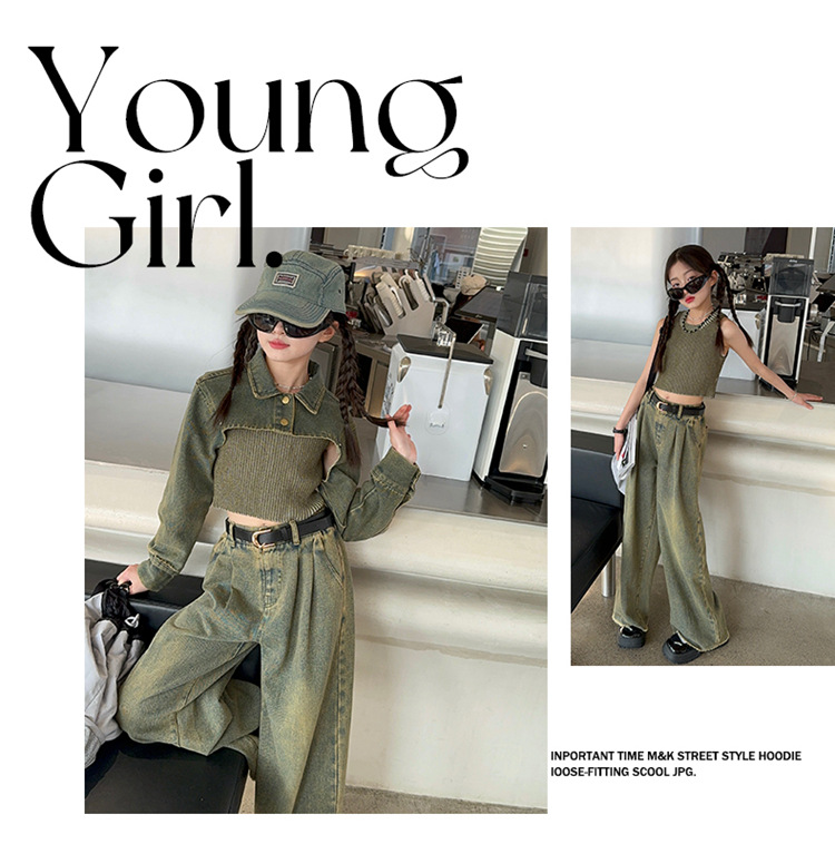 여아 봄옷 세트, 아동 봄가을 레트로 웨이스트랜드 데님 재킷, 와이드 팬츠, 세련된 3종 세트, 멋지고 시크한 스타일스토어 가기