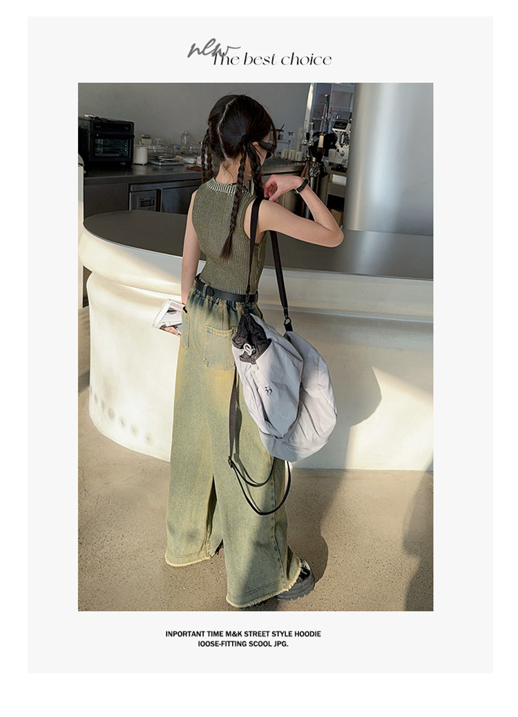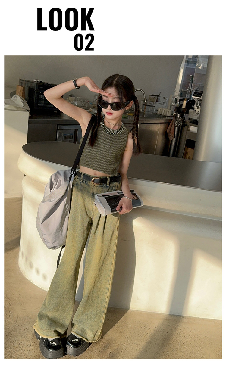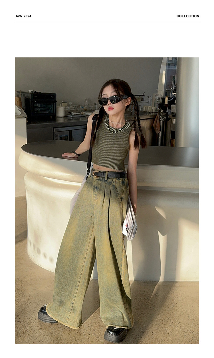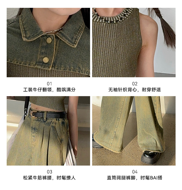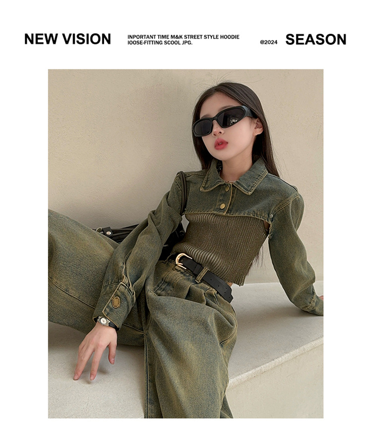 여아 봄옷 세트, 아동 봄가을 레트로 웨이스트랜드 데님 재킷, 와이드 팬츠, 세련된 3종 세트, 멋지고 시크한 스타일스토어 가기
