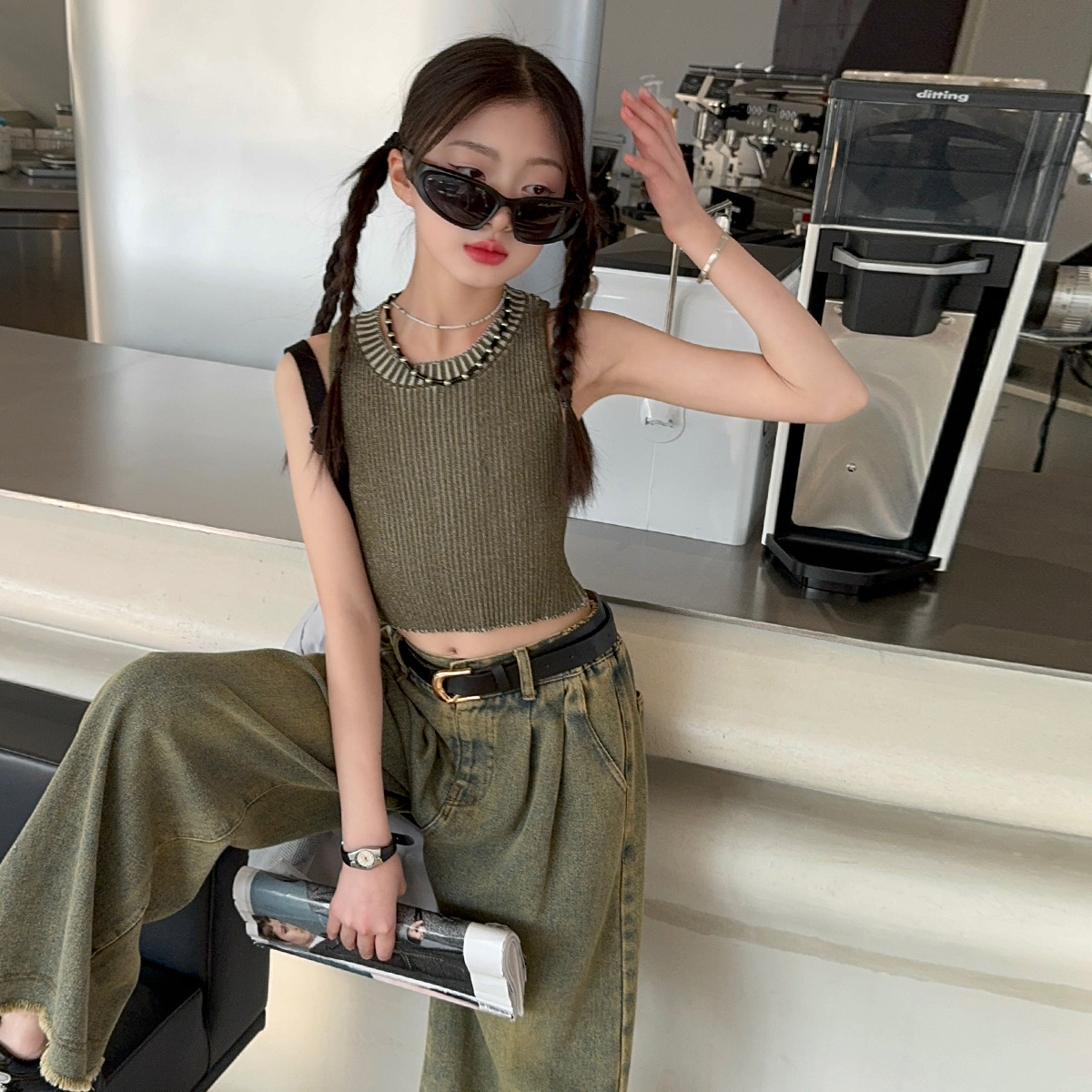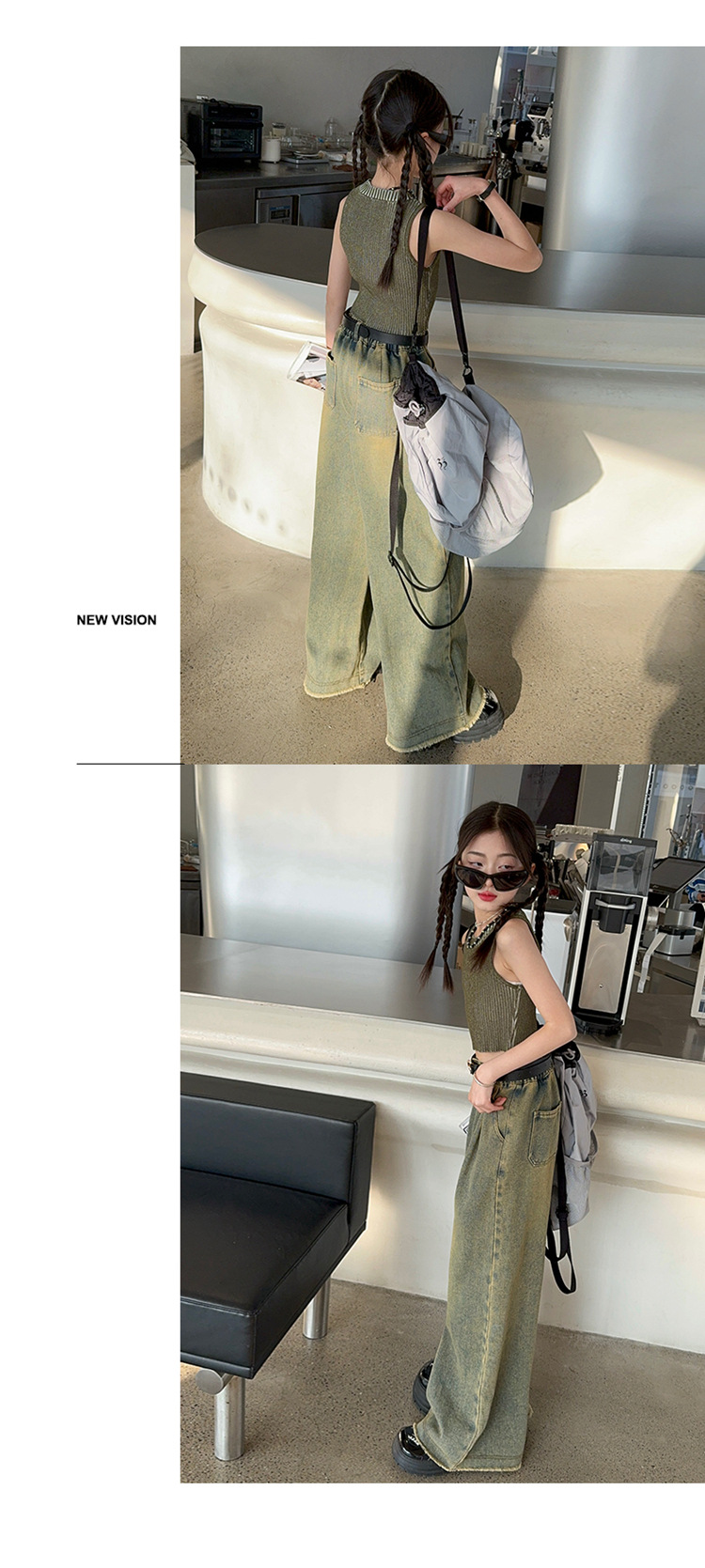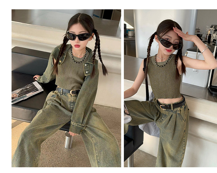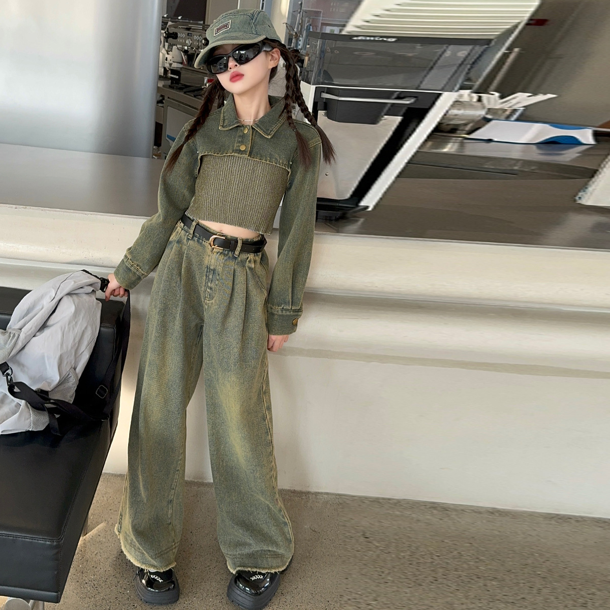 여아 봄옷 세트, 아동 봄가을 레트로 웨이스트랜드 데님 재킷, 와이드 팬츠, 세련된 3종 세트, 멋지고 시크한 스타일