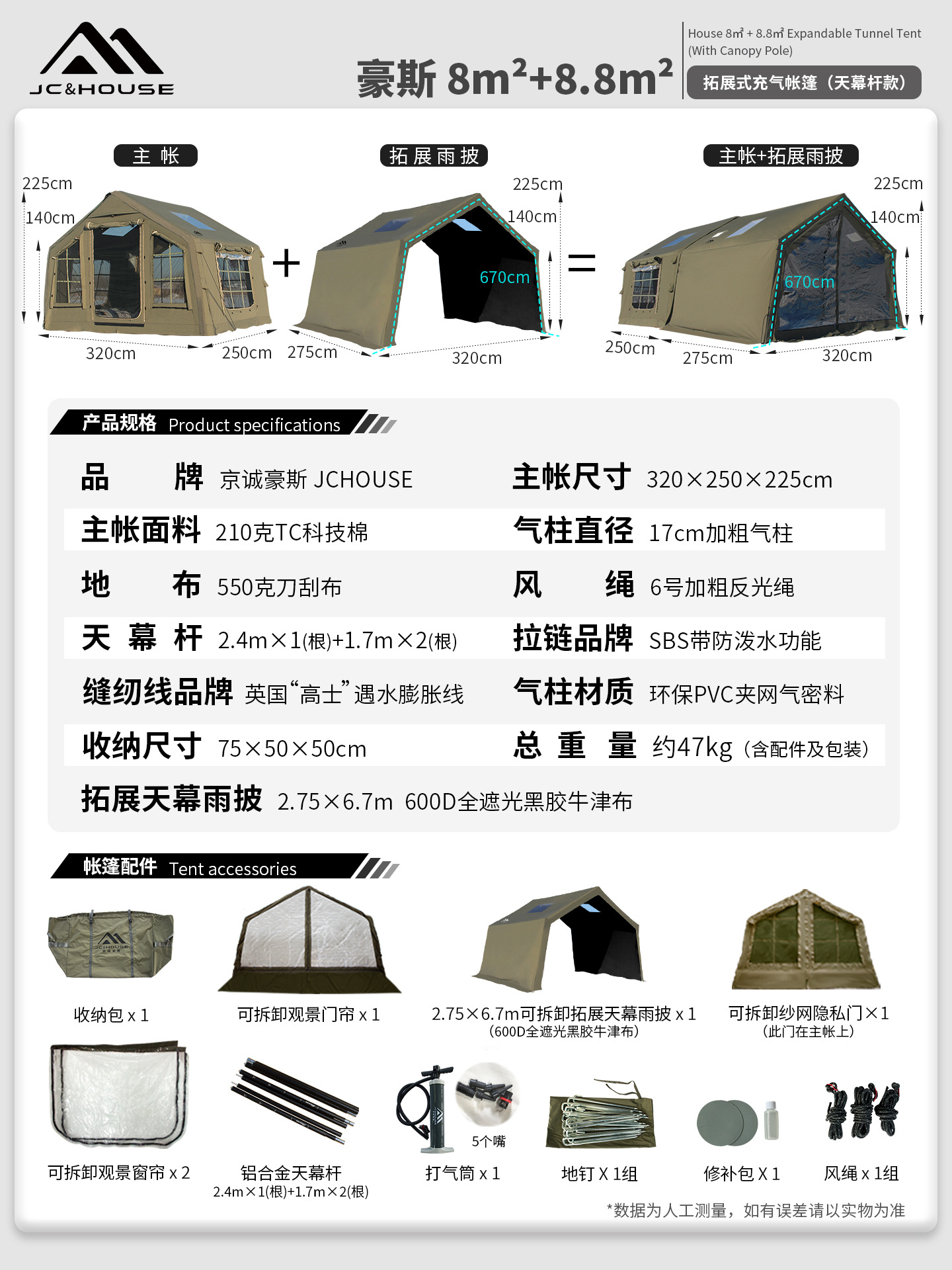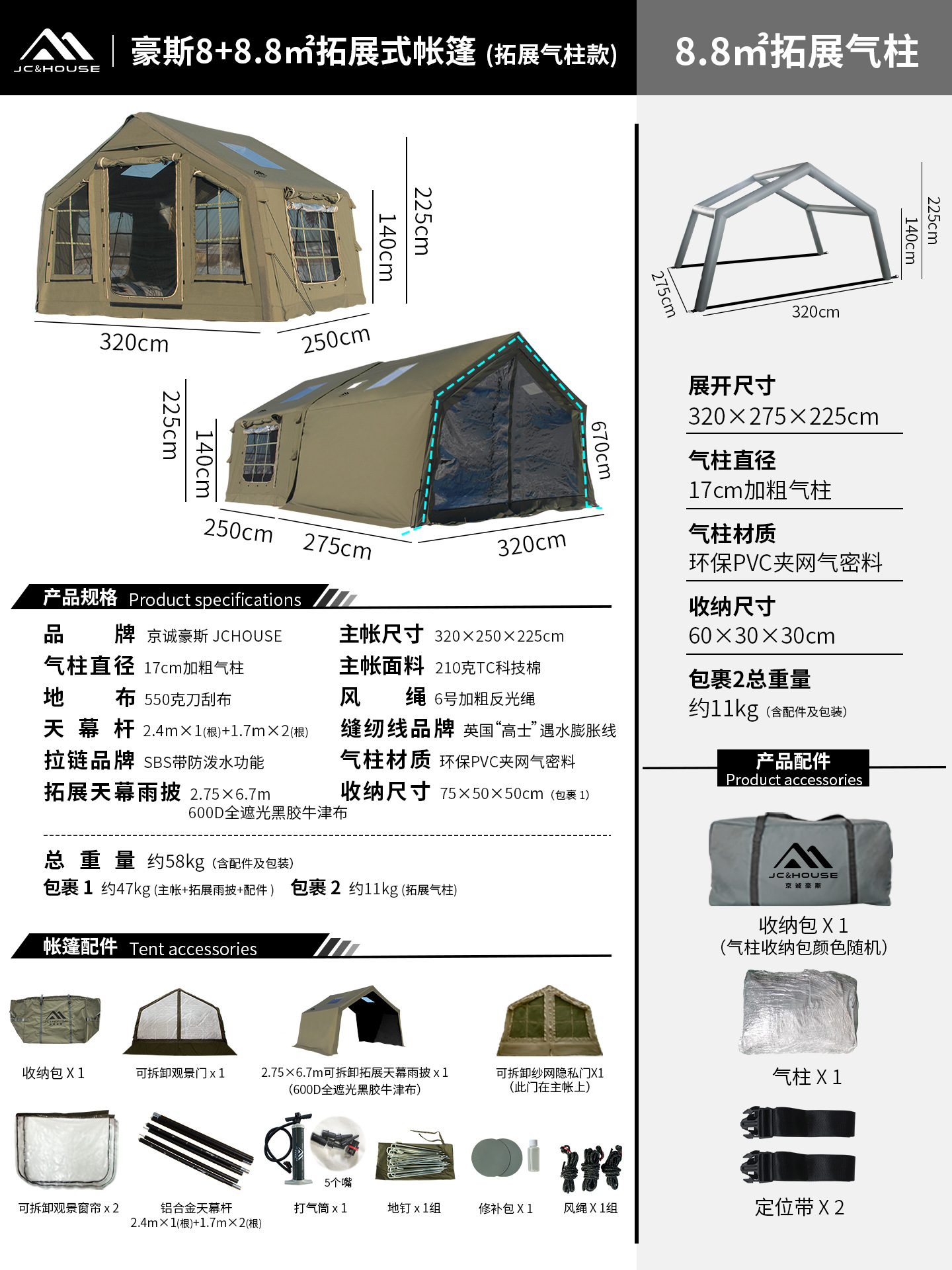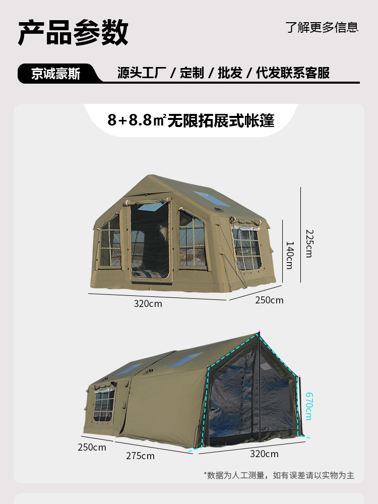 징청하우스JcHouse8+8.8 ㎡ 에어텐트 캠핑 캠핑지 확장형 루프텐트