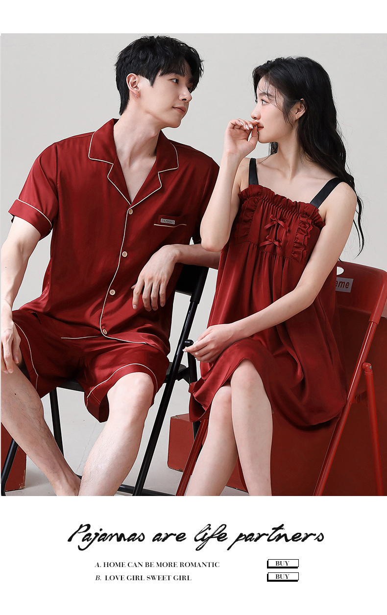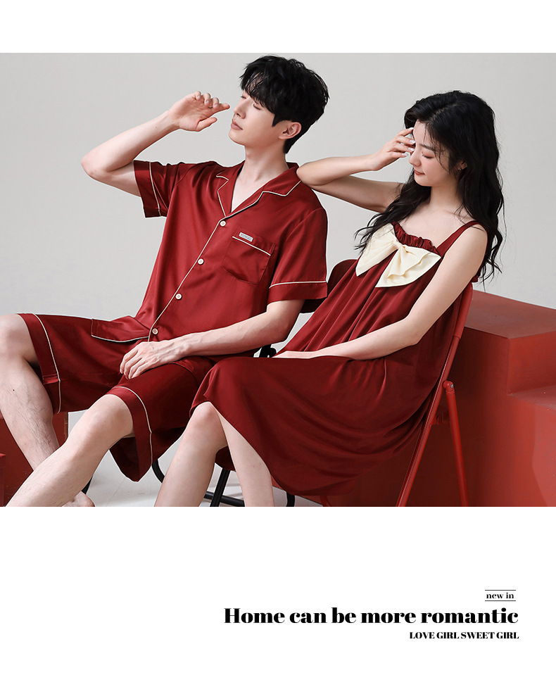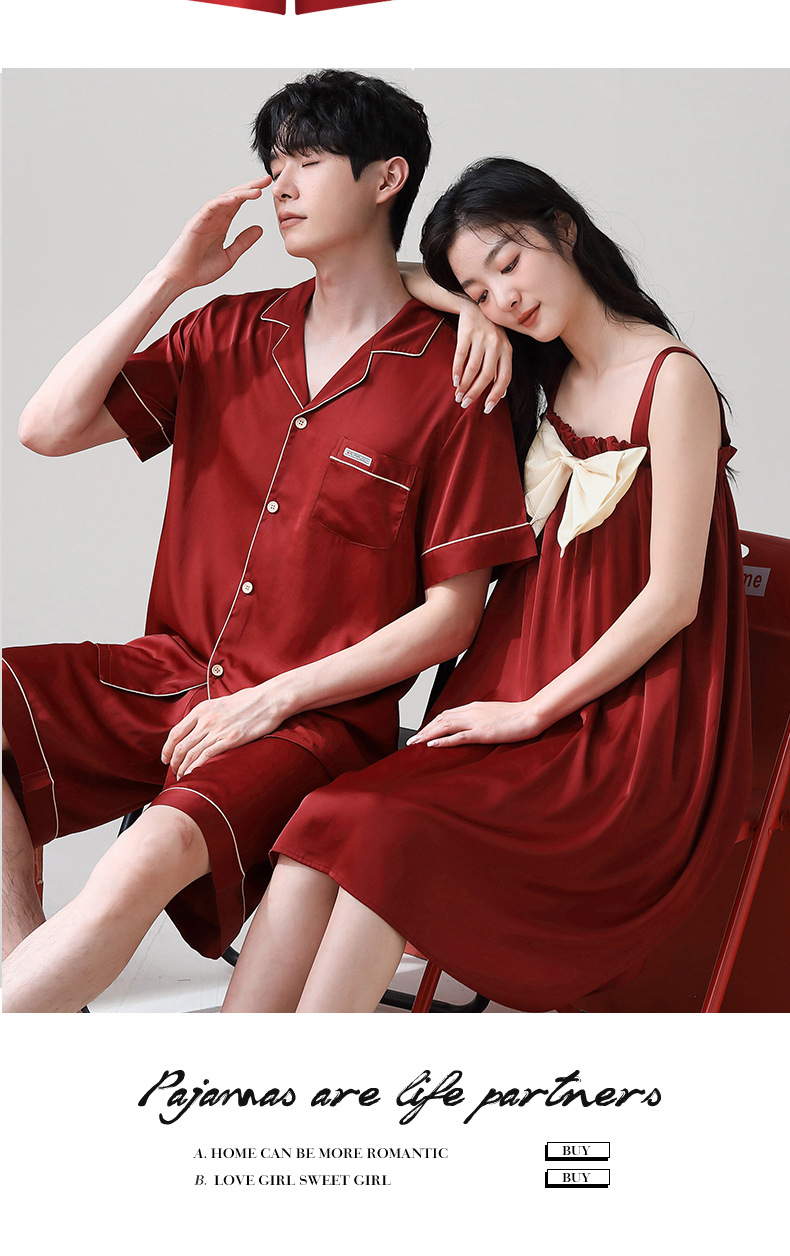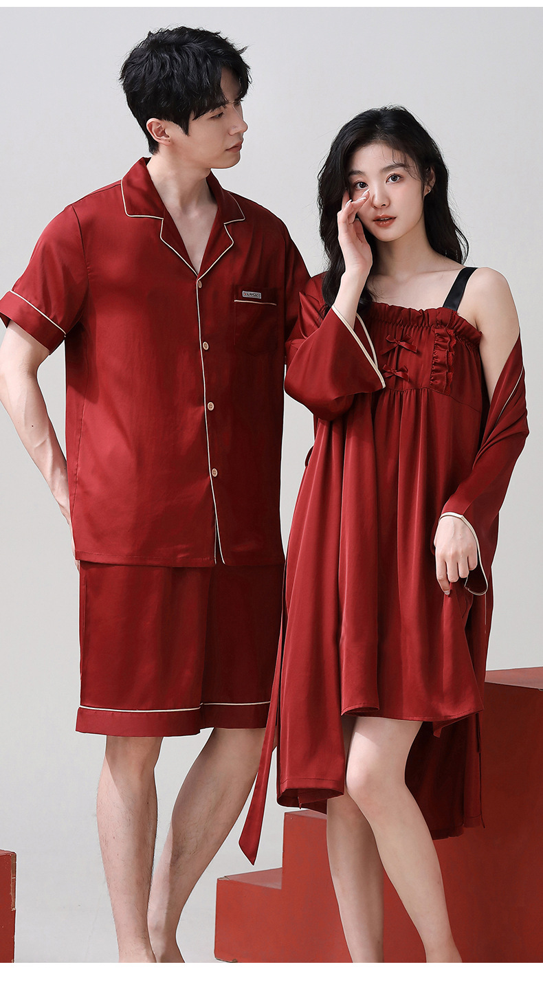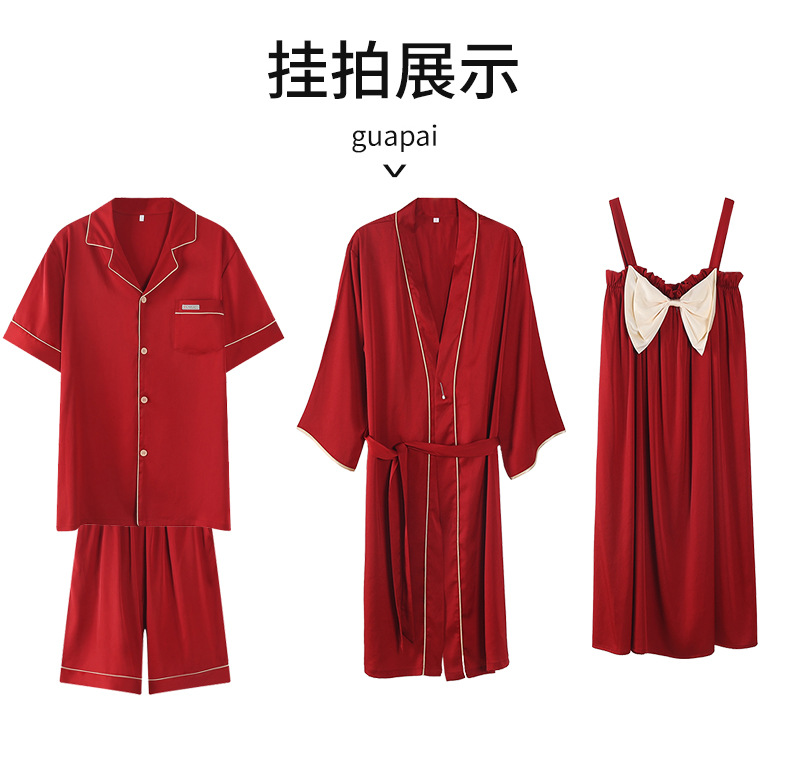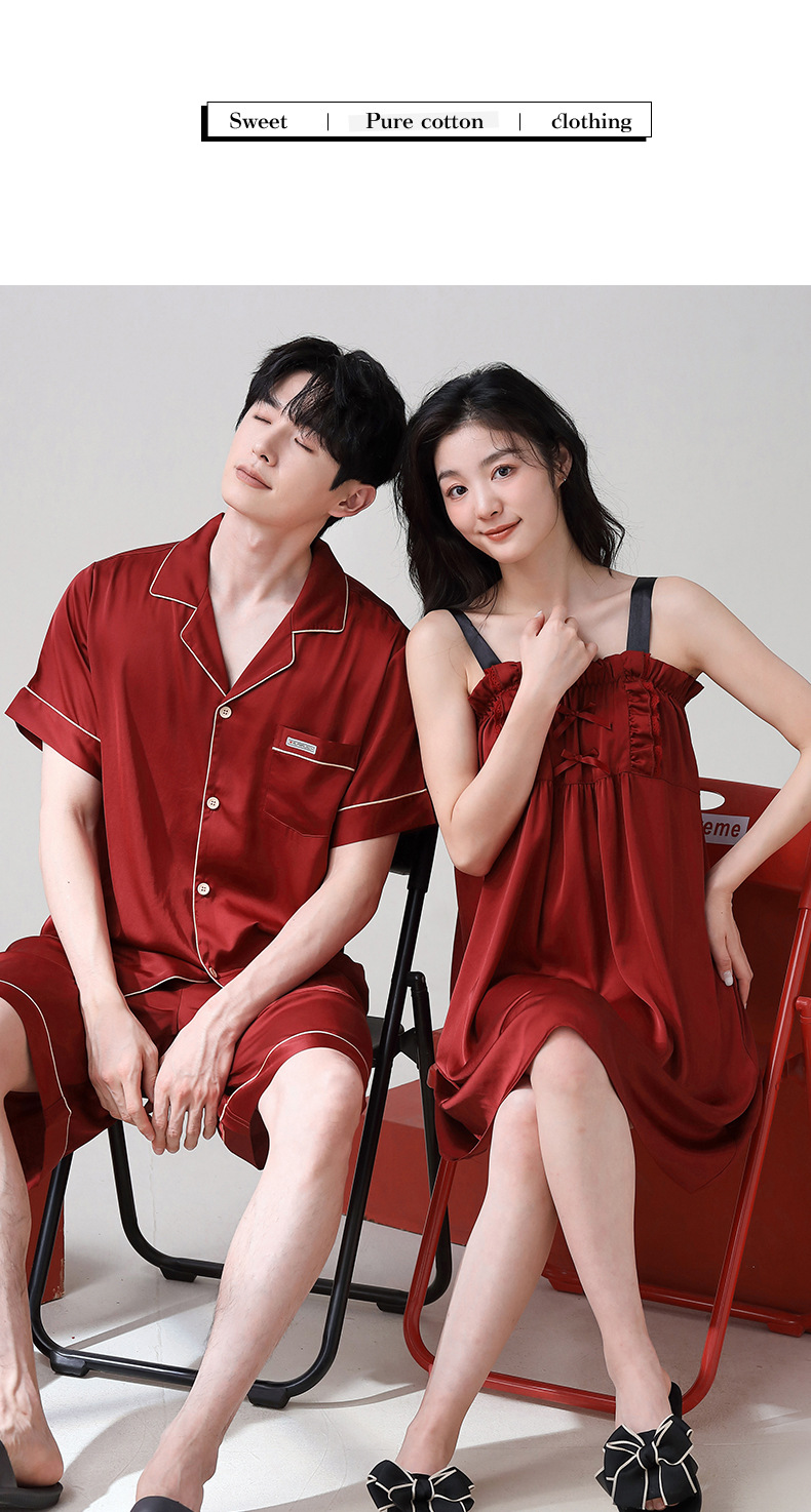 커플의 얼음 실크 잠옷 여름 빨간 결혼식 년 슬링 원피스 잠옷 투피스 홈웨어