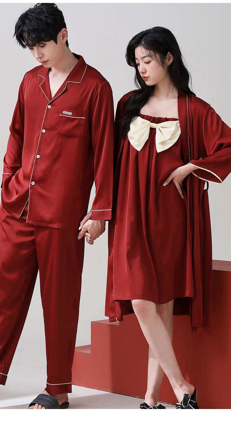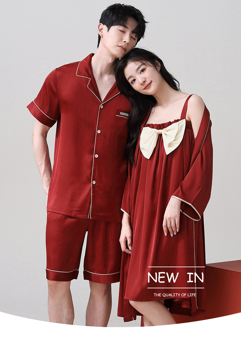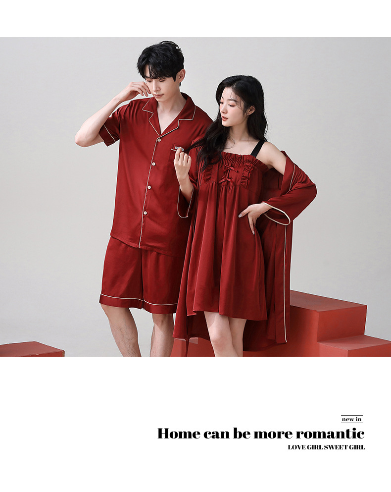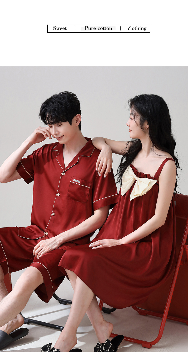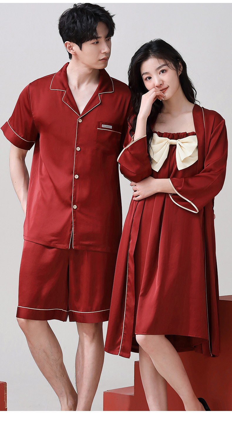 커플의 얼음 실크 잠옷 여름 빨간 결혼식 년 슬링 원피스 잠옷 투피스 홈웨어
