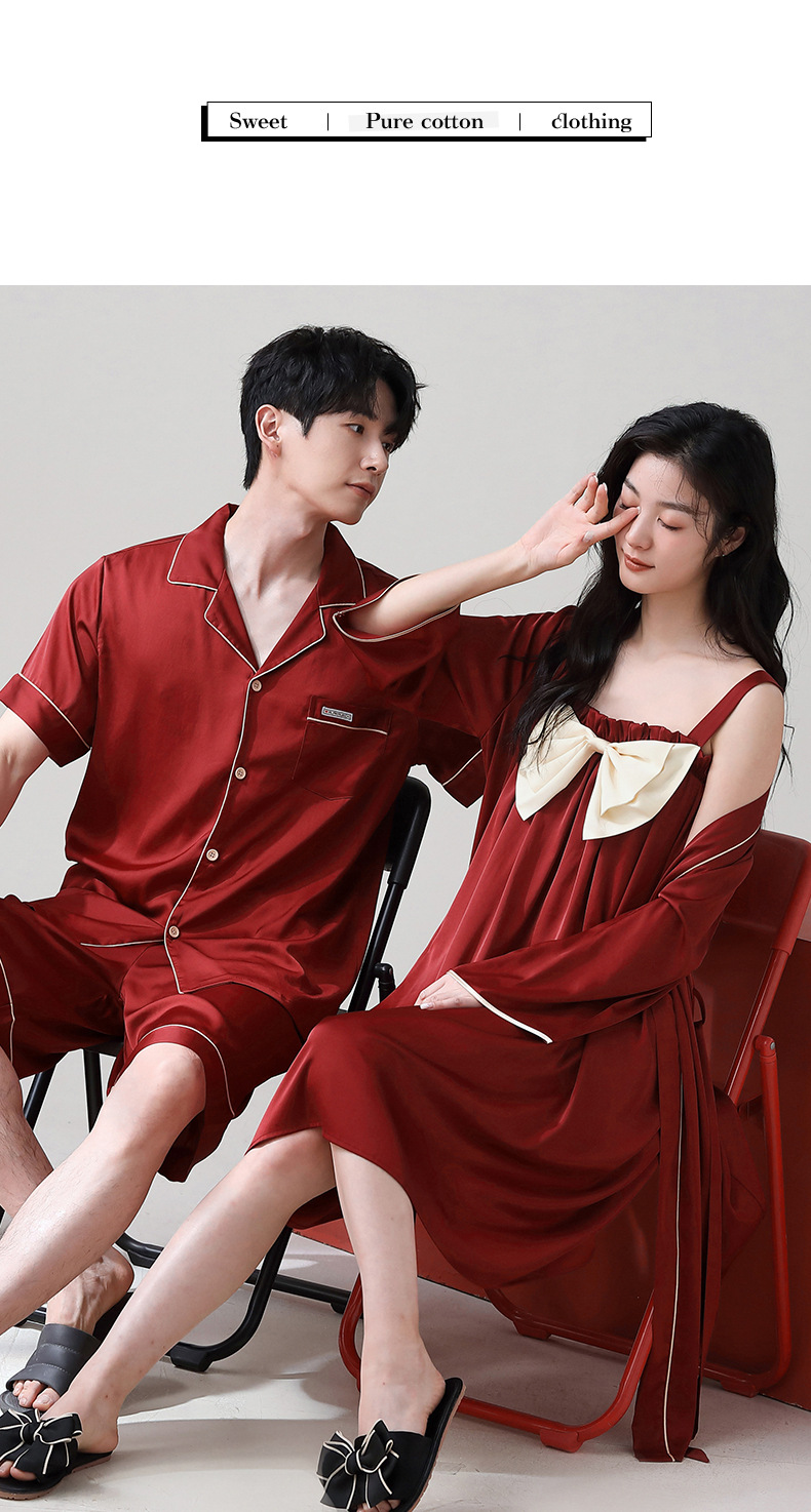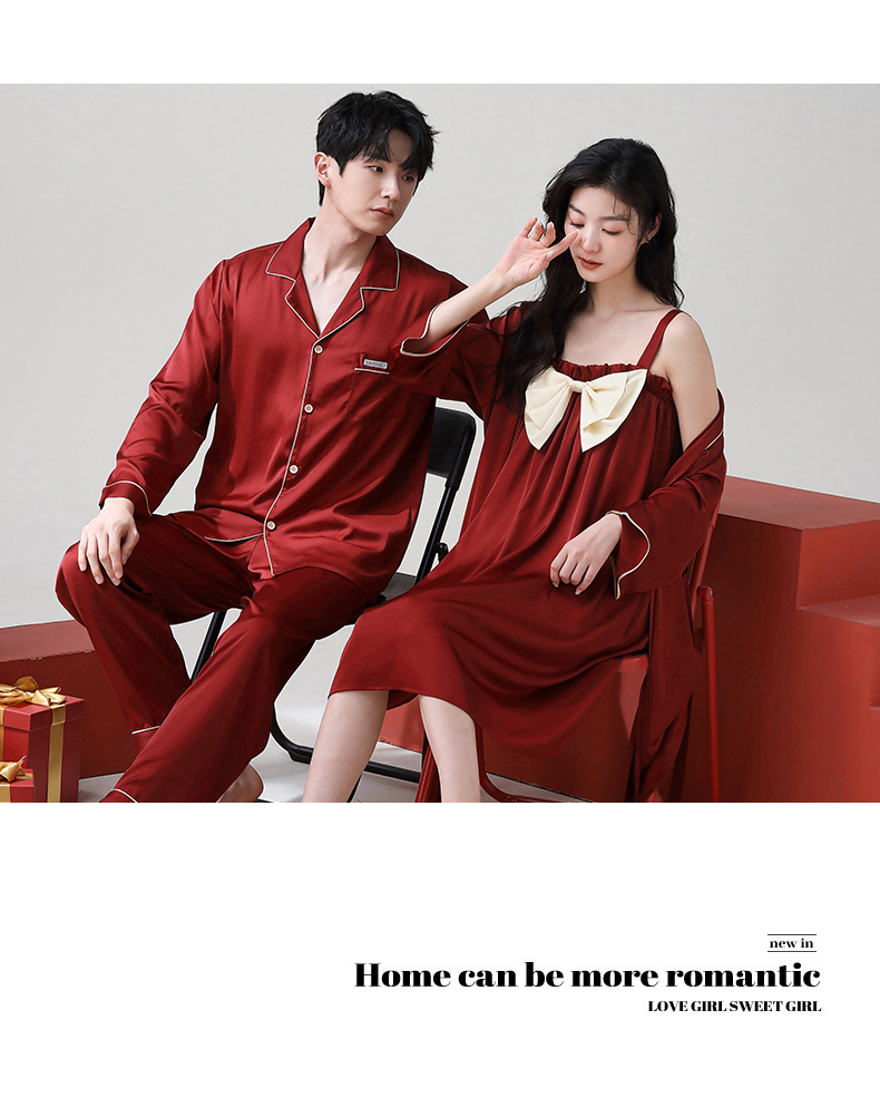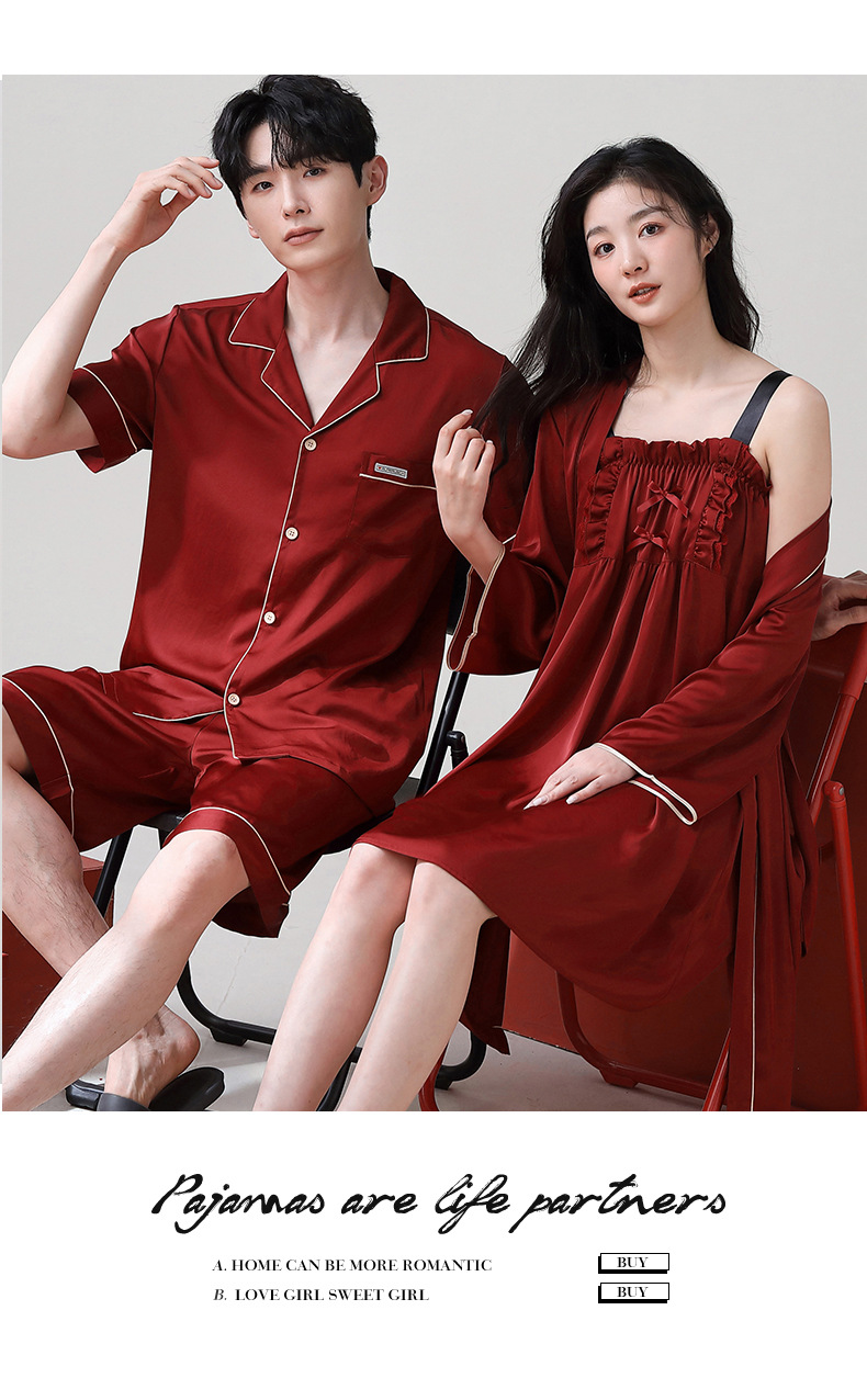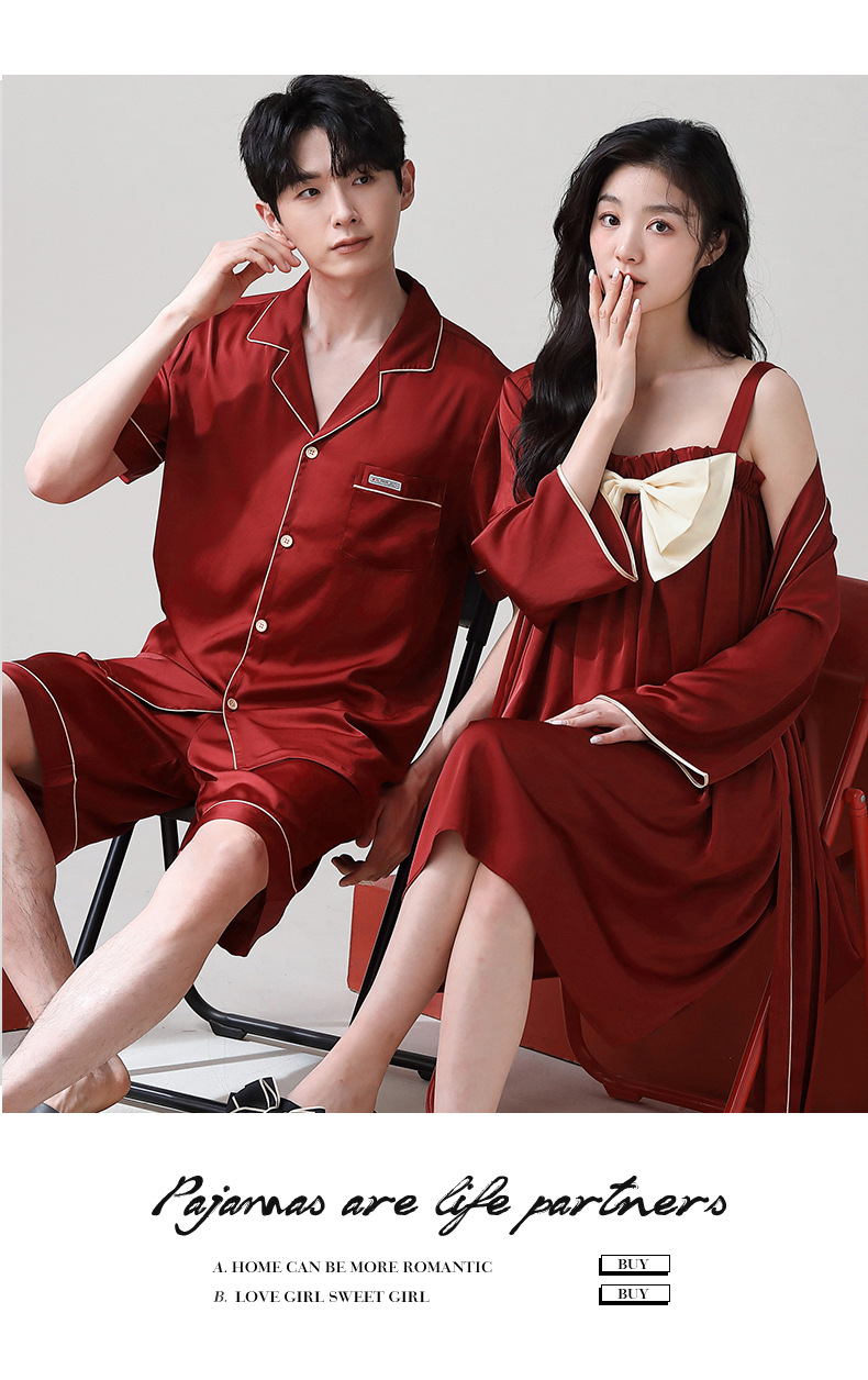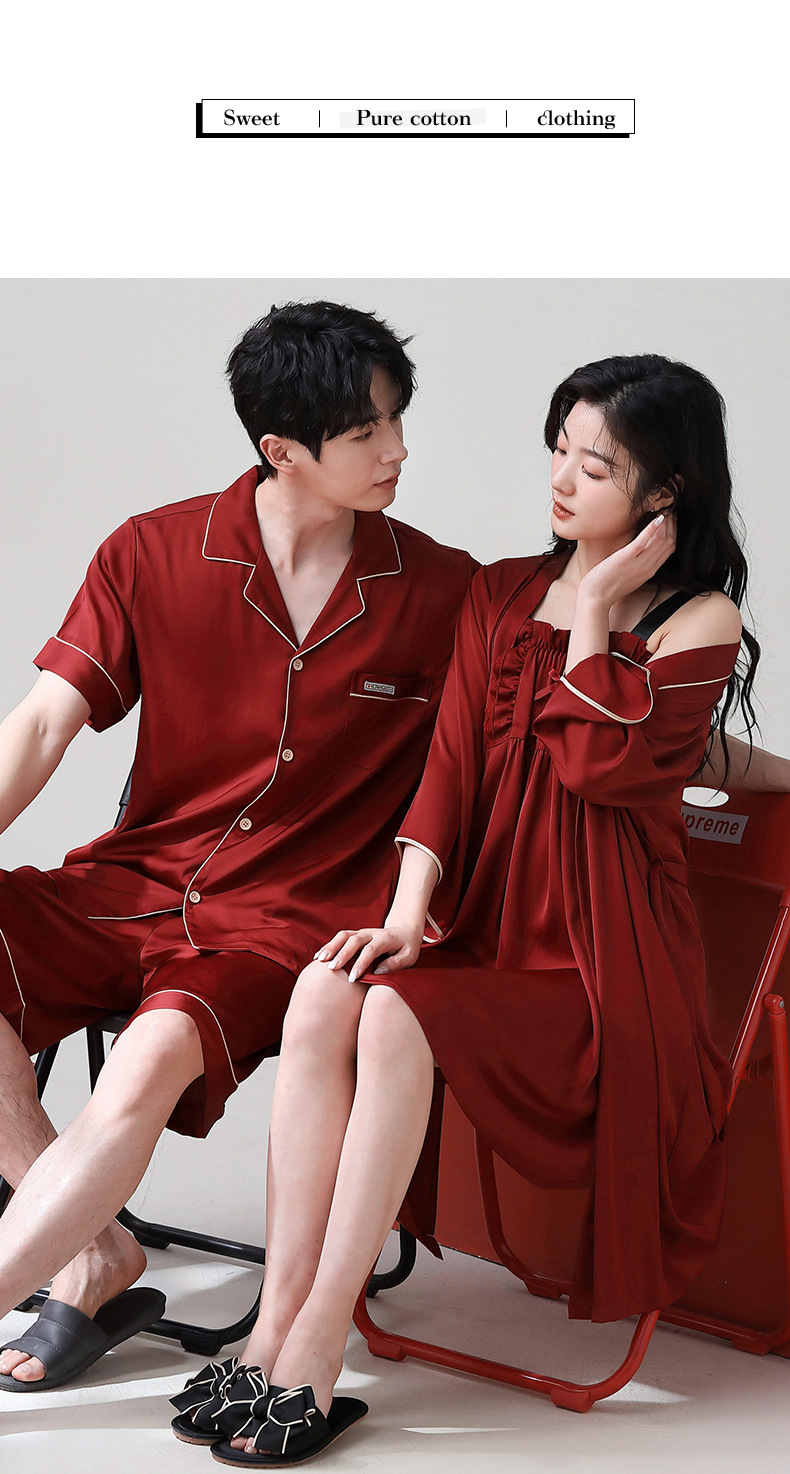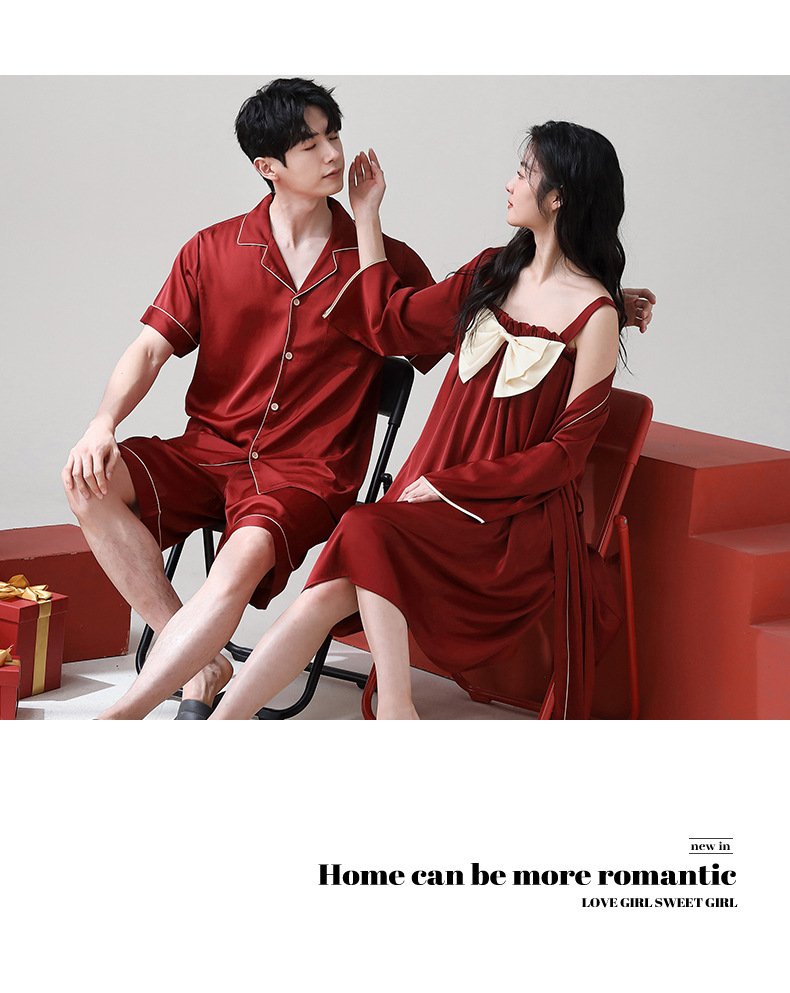커플의 얼음 실크 잠옷 여름 빨간 결혼식 년 슬링 원피스 잠옷 투피스 홈웨어