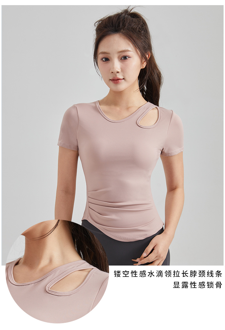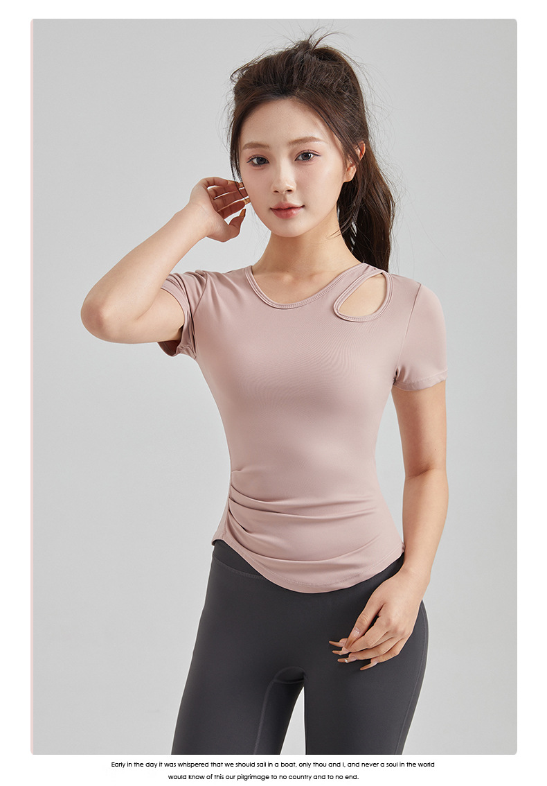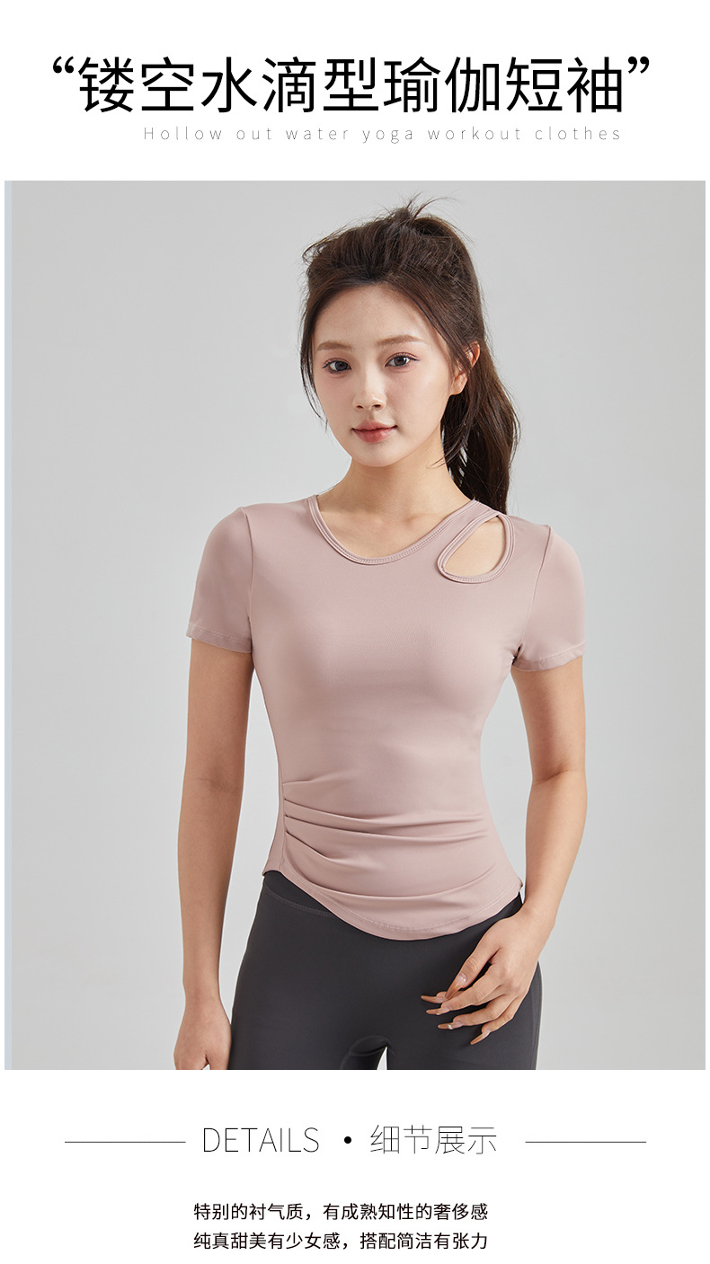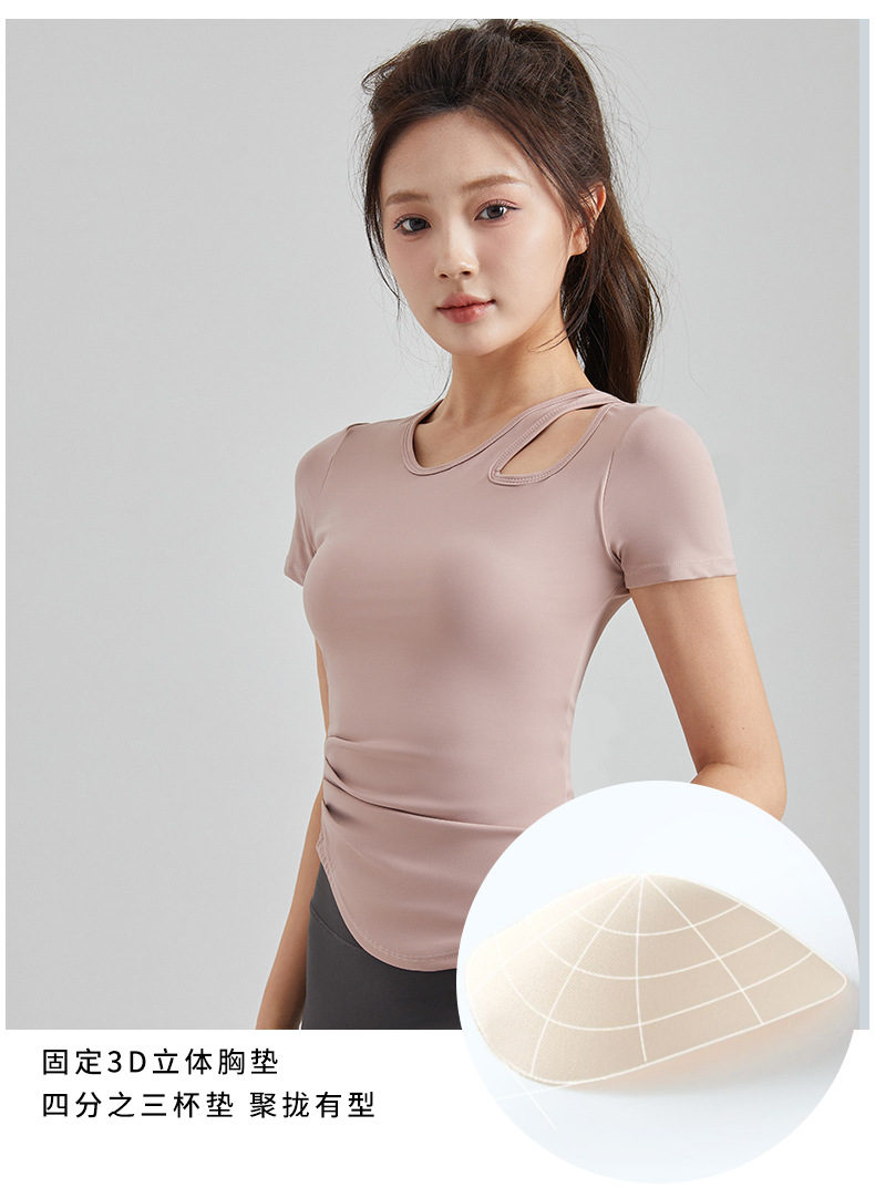 봄과 여름 새로운 원피스 컵 요가 옷 짧은 소매 슬림 핏 슬리밍 스포츠 티셔츠 빠른 건조 통기성 피트니스 탑