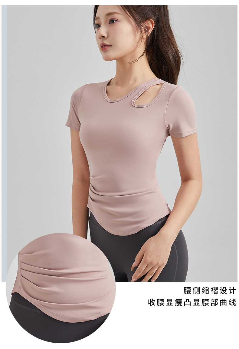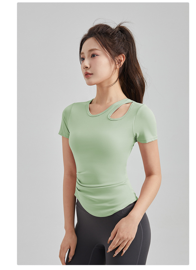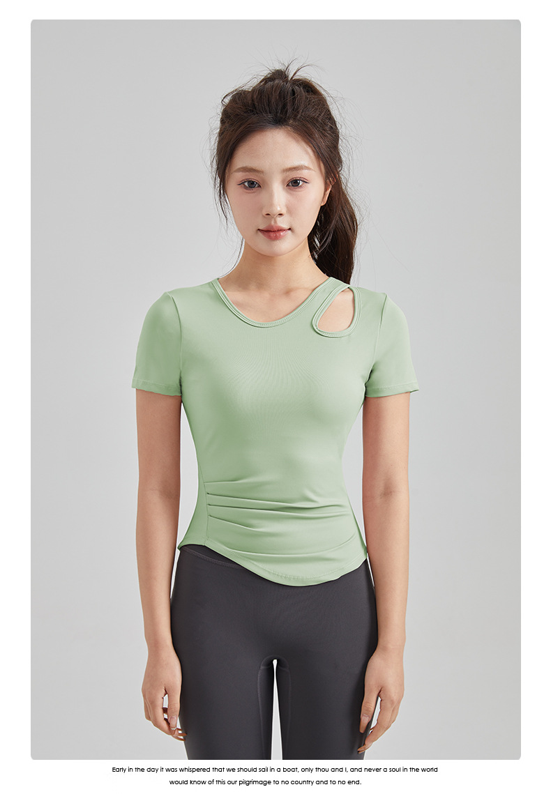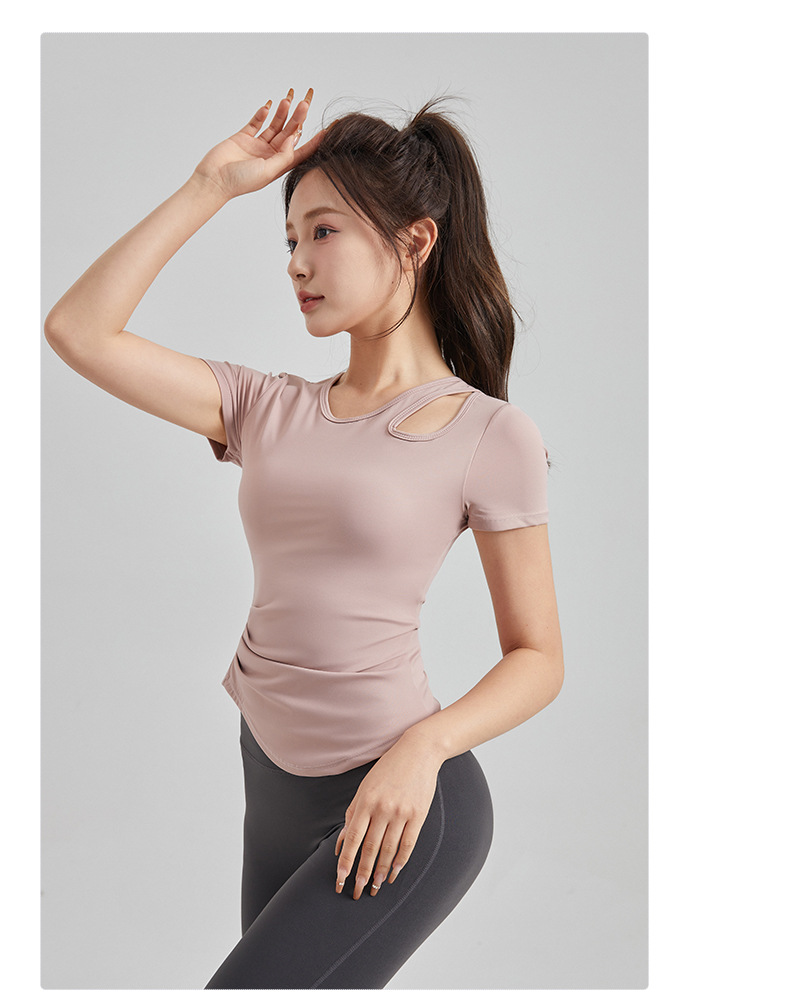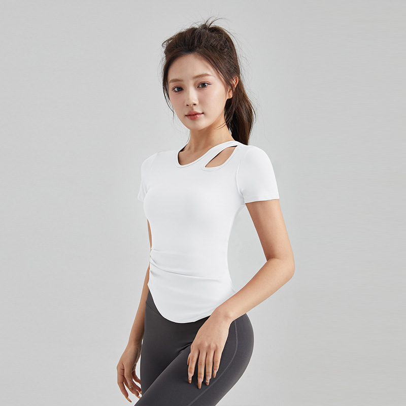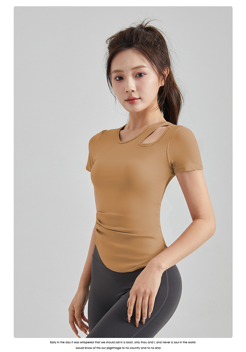 봄과 여름 새로운 원피스 컵 요가 옷 짧은 소매 슬림 핏 슬리밍 스포츠 티셔츠 빠른 건조 통기성 피트니스 탑