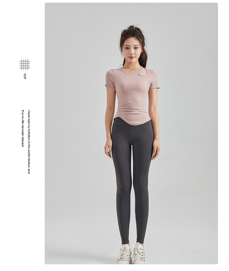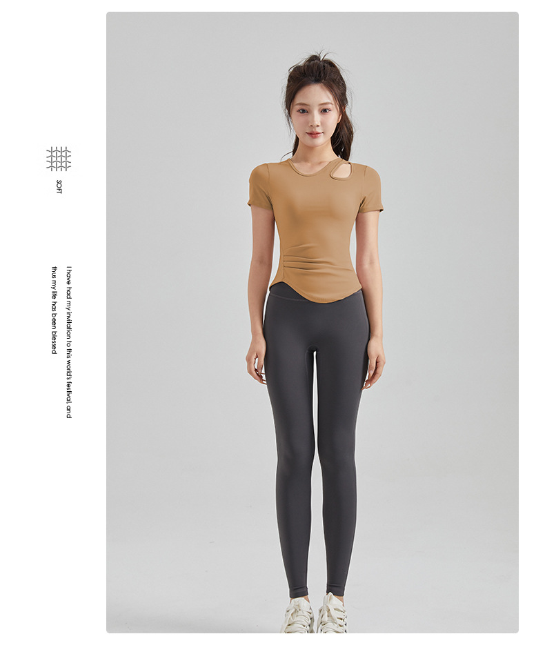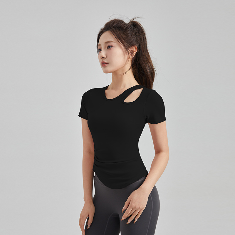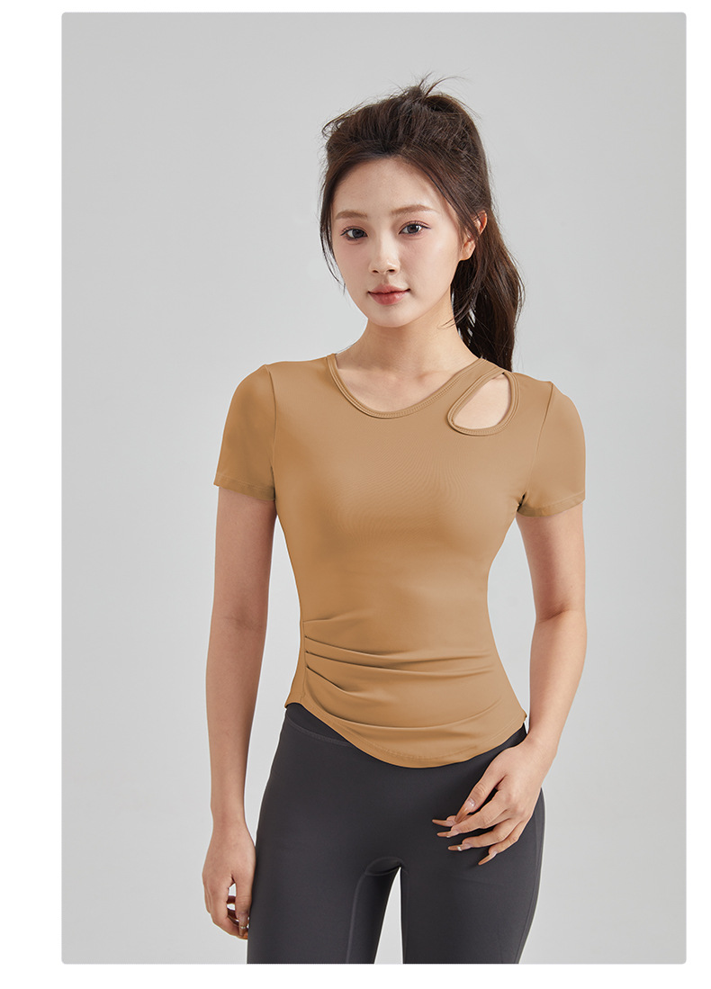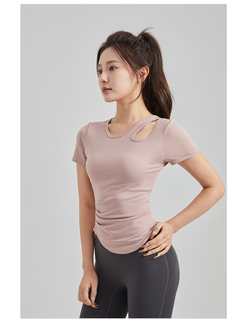 봄과 여름 새로운 원피스 컵 요가 옷 짧은 소매 슬림 핏 슬리밍 스포츠 티셔츠 빠른 건조 통기성 피트니스 탑