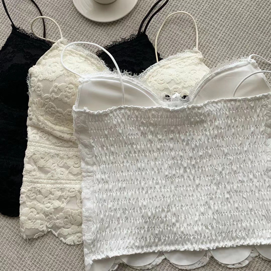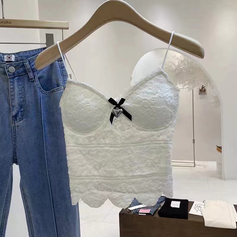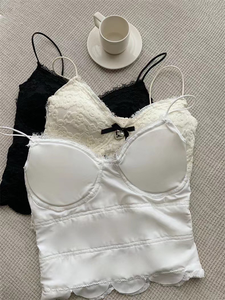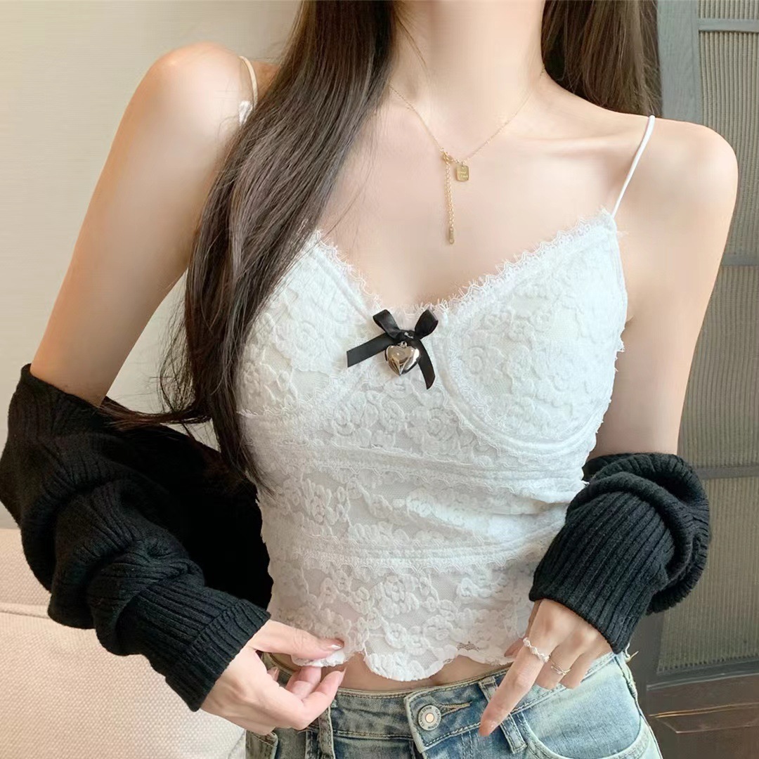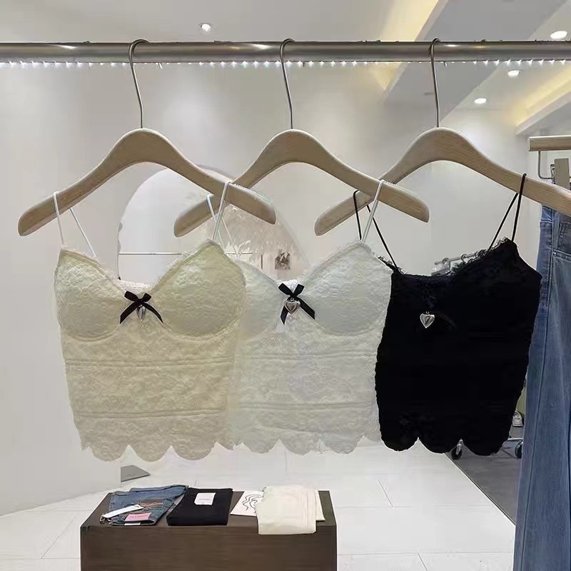 섹시한 레이스 리본 끈나시 여성용 이너웨어 숏탑, 아름다운 등 디자인, 가슴 패드 내장, 백리스 탑스토어 가기