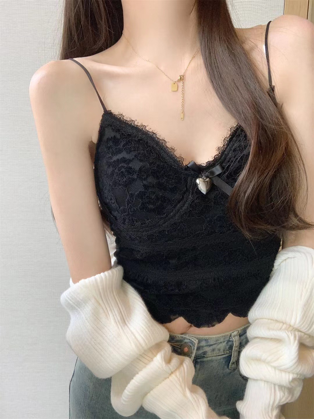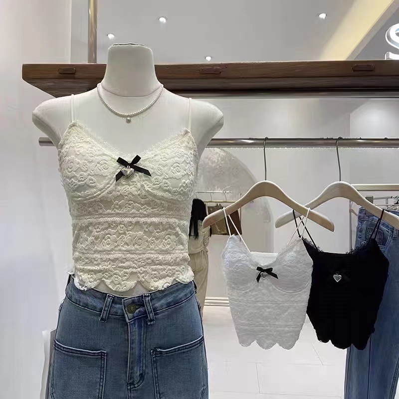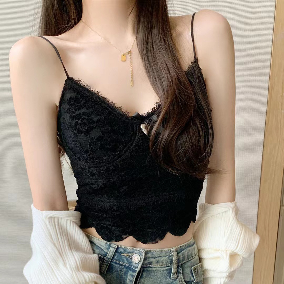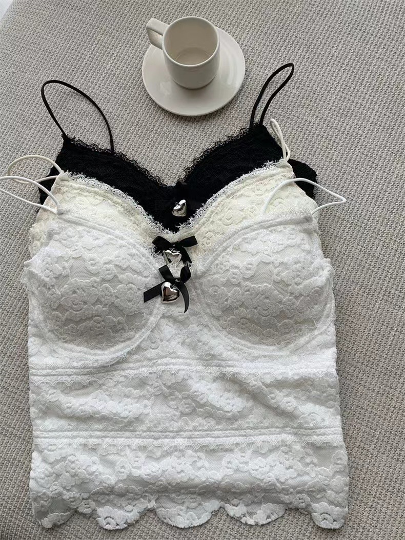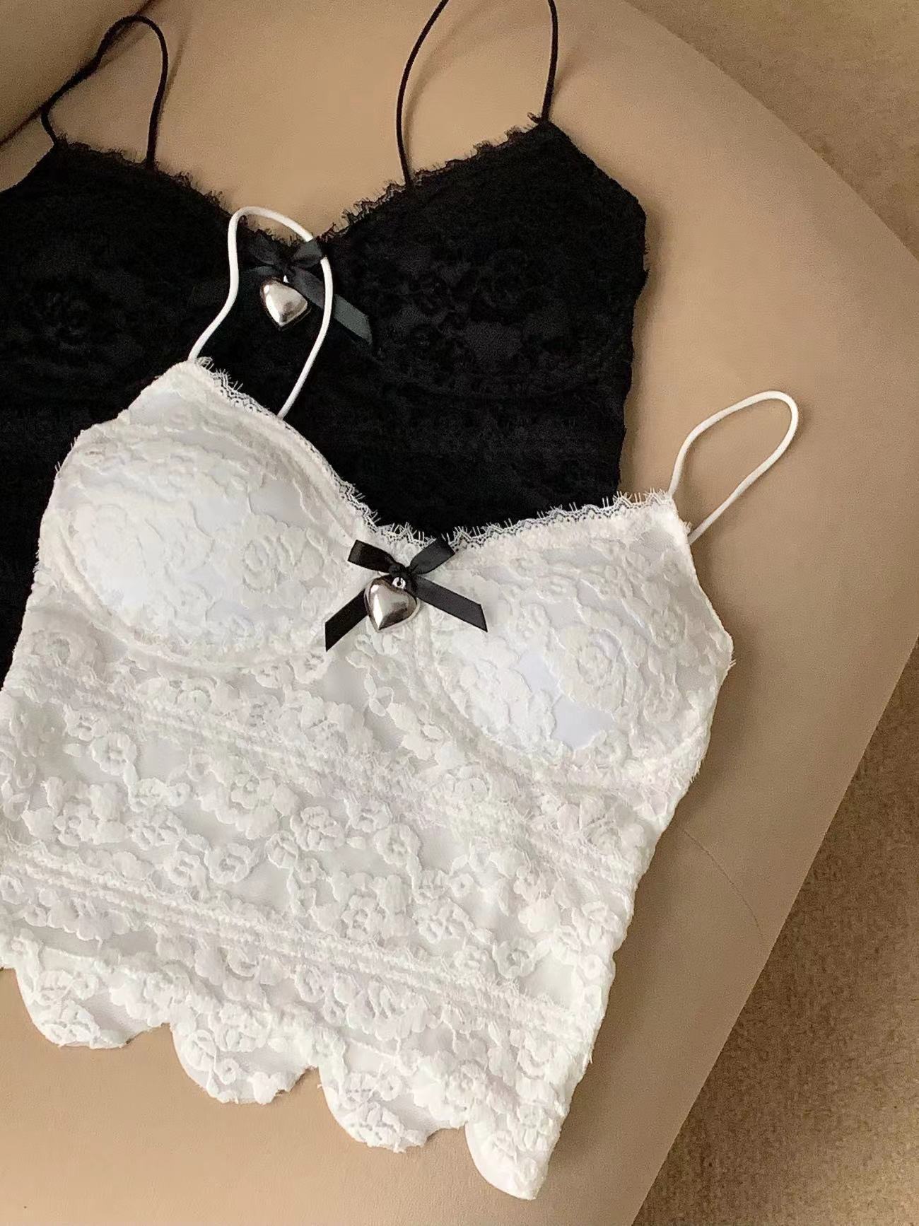 섹시한 레이스 리본 끈나시 여성용 이너웨어 숏탑, 아름다운 등 디자인, 가슴 패드 내장, 백리스 탑스토어 가기