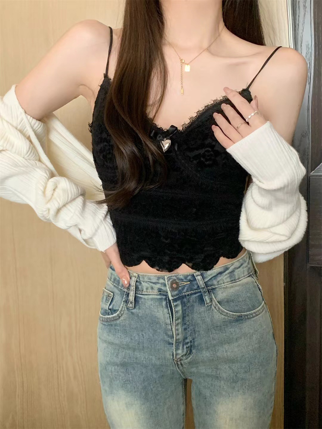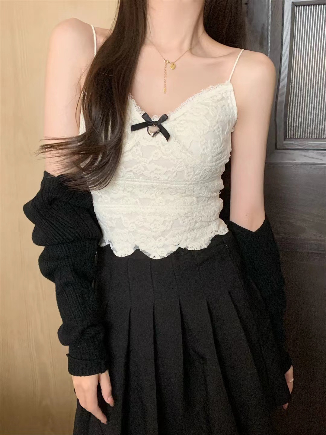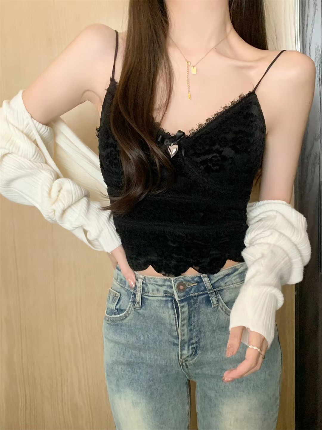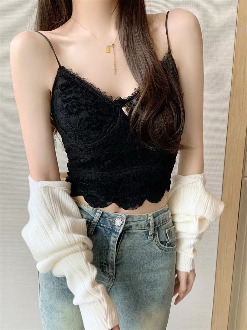 섹시한 레이스 리본 끈나시 여성용 이너웨어 숏탑, 아름다운 등 디자인, 가슴 패드 내장, 백리스 탑스토어 가기