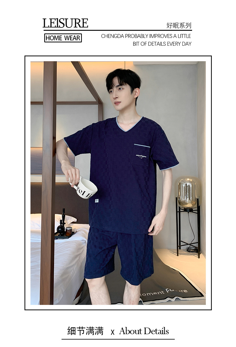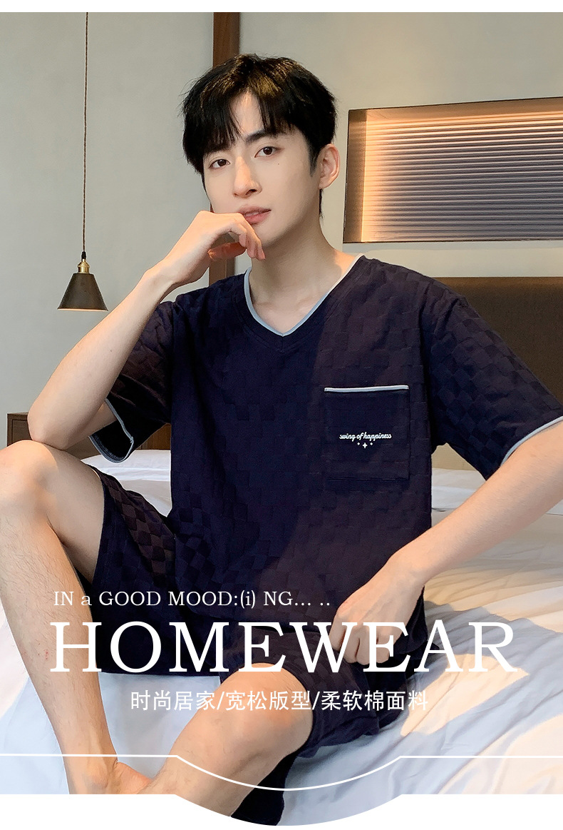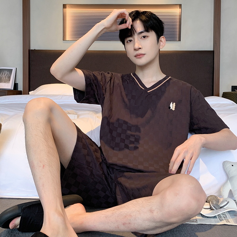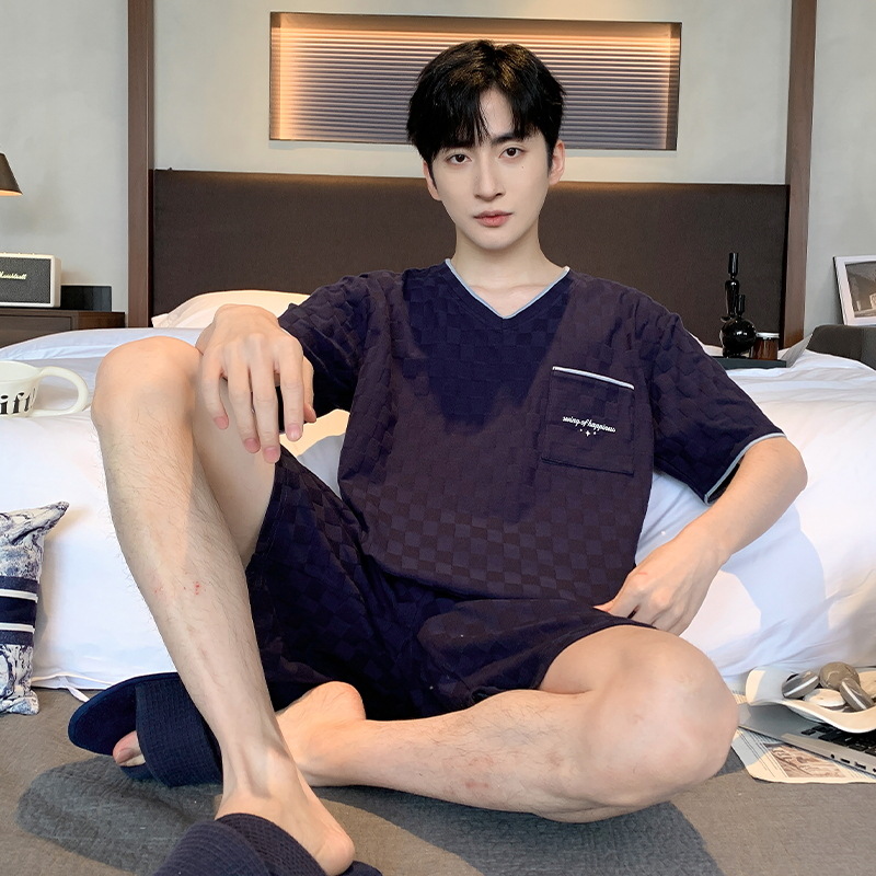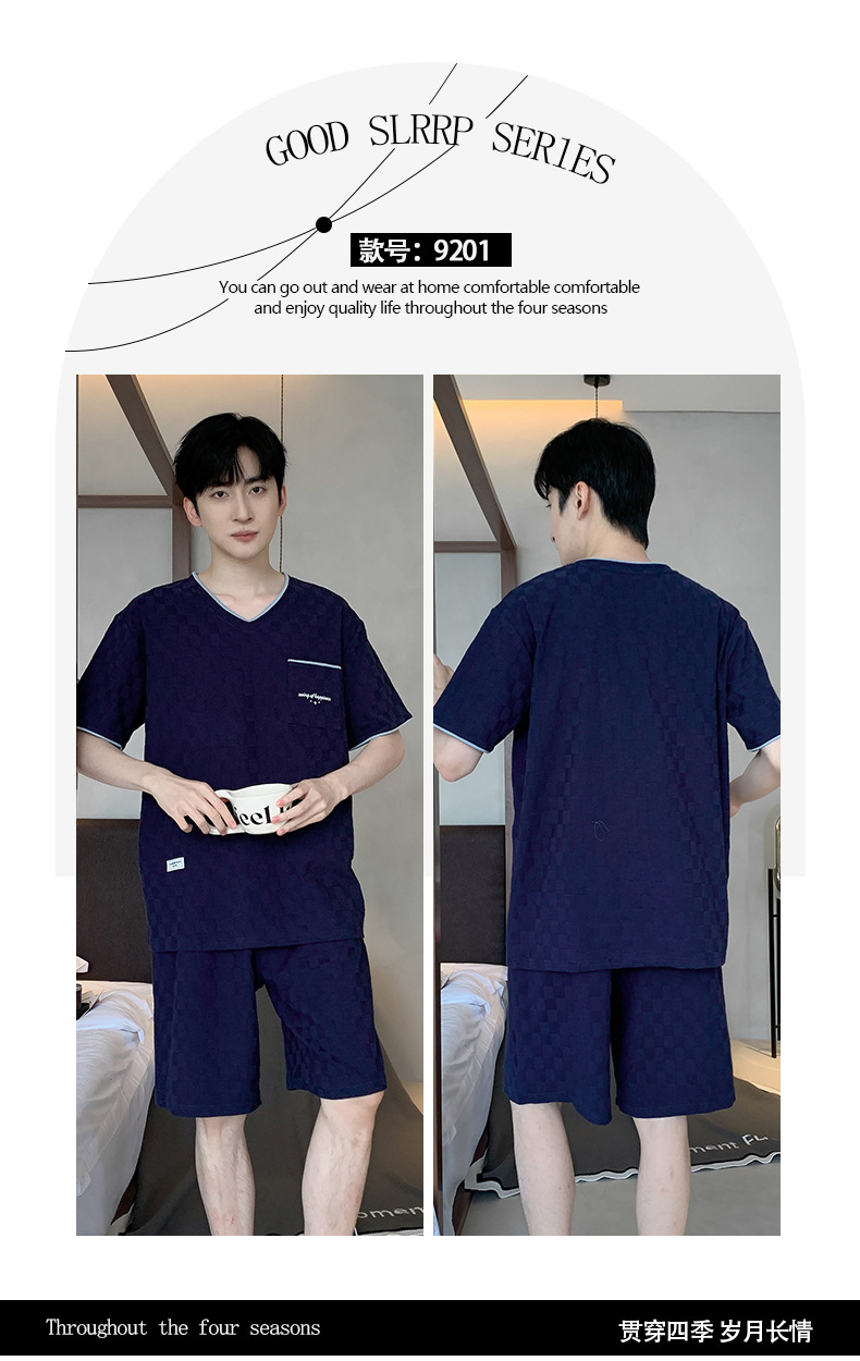 단색면 잠옷 남자 여름 둥근 목 반바지 얇은 자카드 겉옷 소년 홈웨어 세트스토어 가기