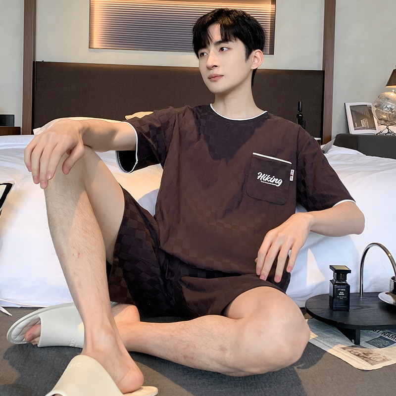 단색면 잠옷 남자 여름 둥근 목 반바지 얇은 자카드 겉옷 소년 홈웨어 세트