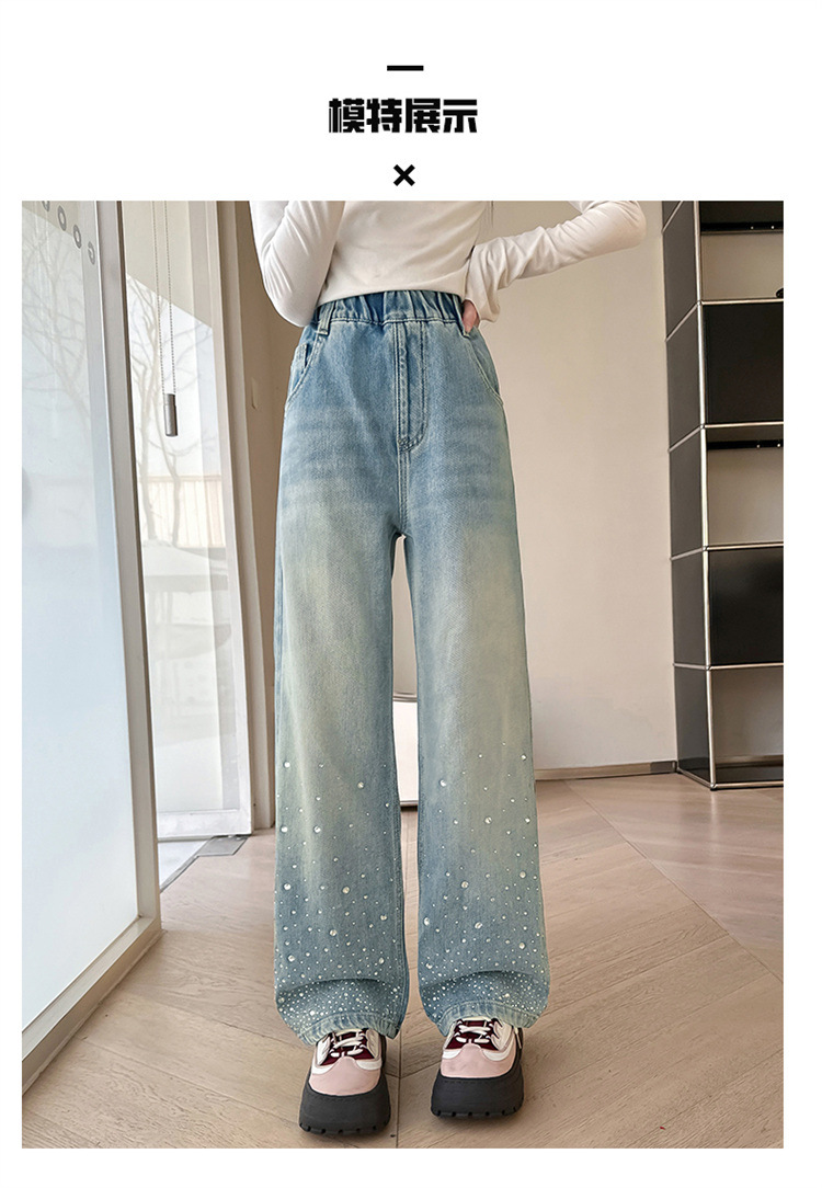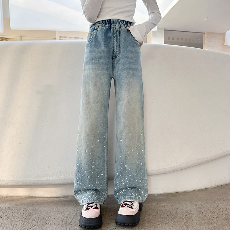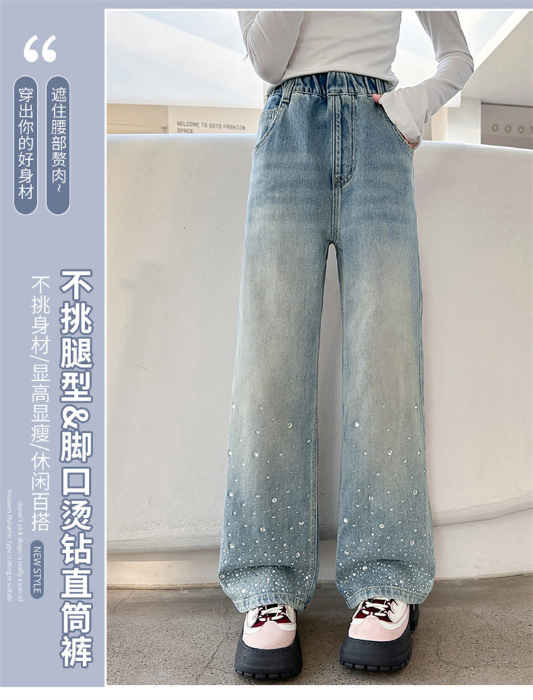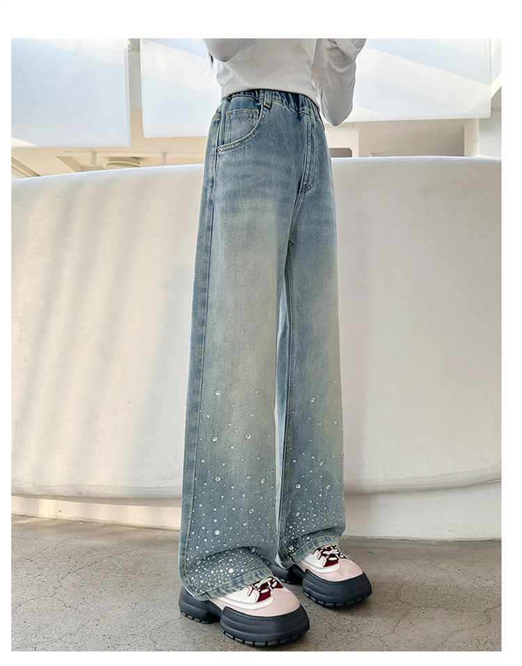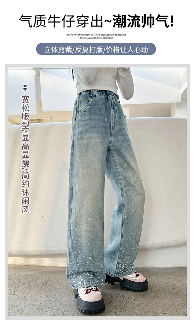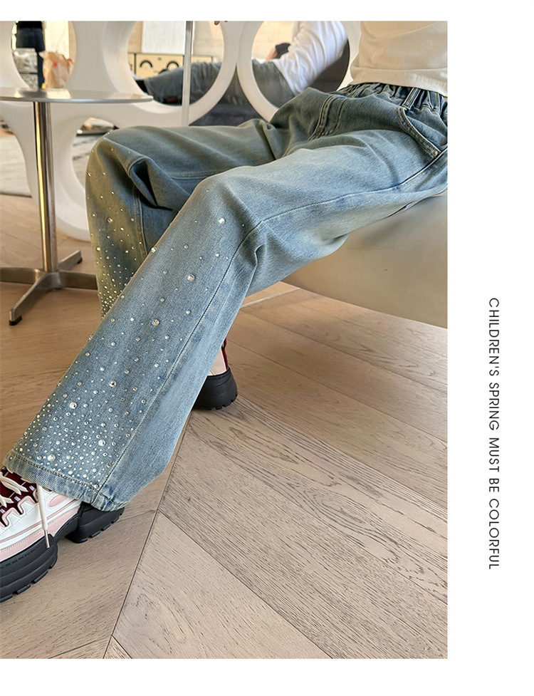 여아용 다이아몬드 장식 데님 팬츠 2025 봄 신상 아동용 봄 가을 루즈핏 와이드 팬츠 캐주얼 만능 스트레이트 팬츠스토어 가기