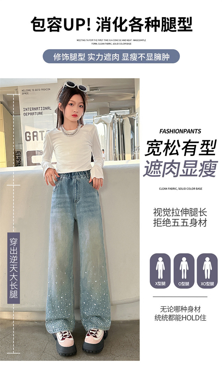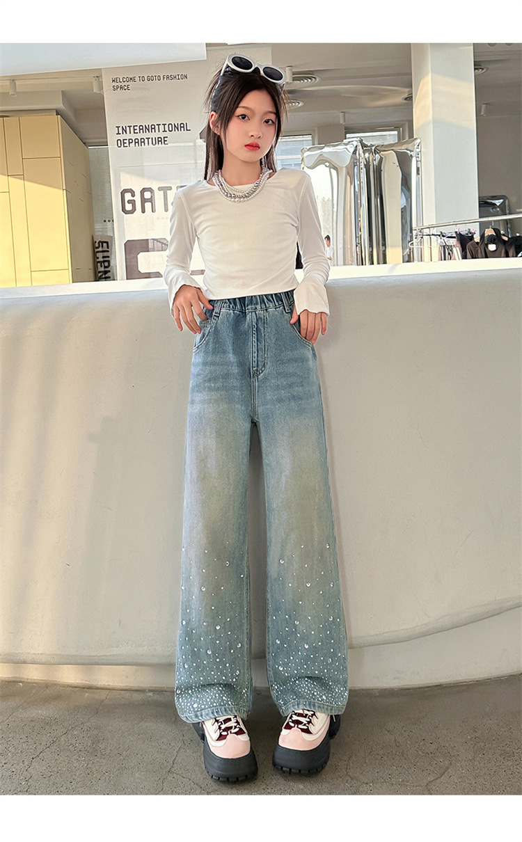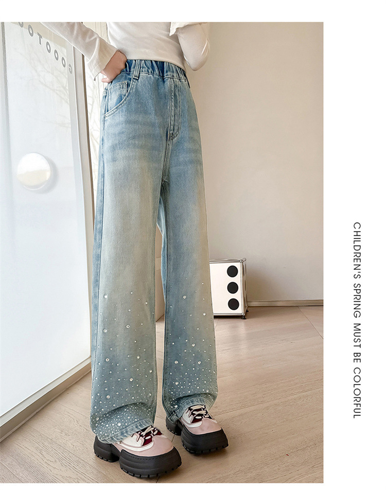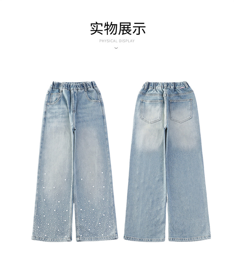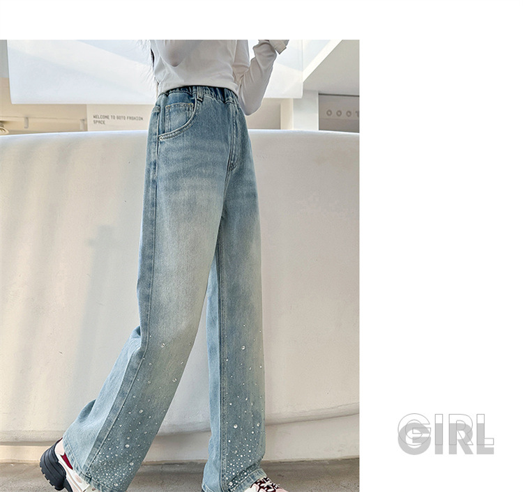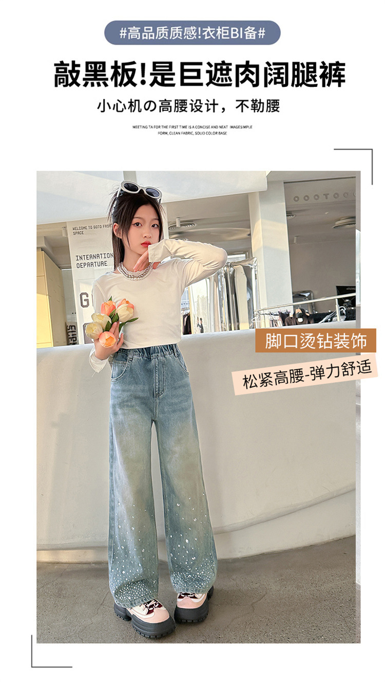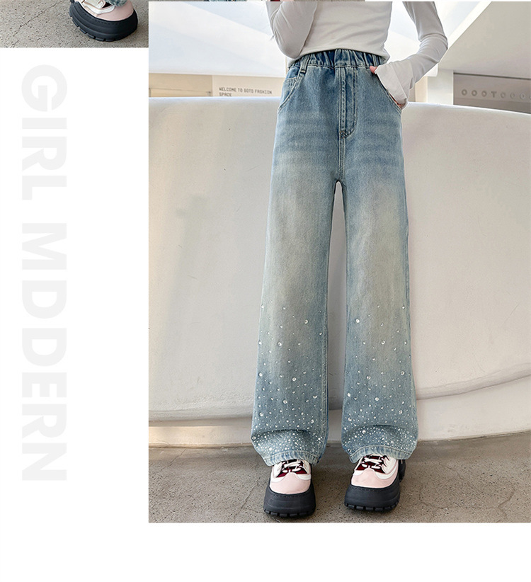여아용 다이아몬드 장식 데님 팬츠 2025 봄 신상 아동용 봄 가을 루즈핏 와이드 팬츠 캐주얼 만능 스트레이트 팬츠스토어 가기
