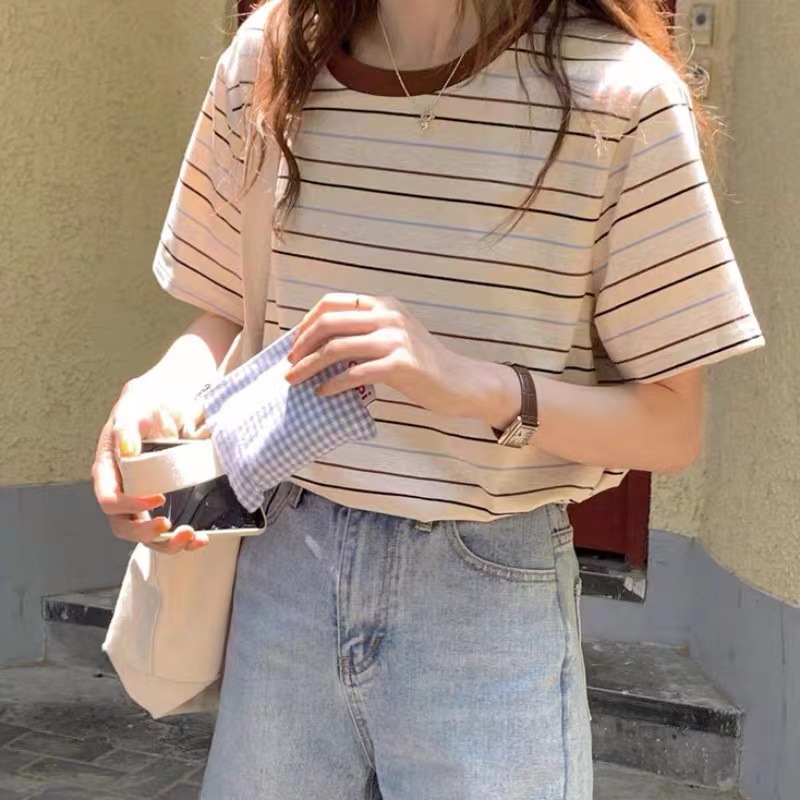 플러스 사이즈 스트라이프 반팔 티셔츠 여성 여름 한국식 패션 커플 반소매 거리 라운드 넥 캐주얼 느슨한 여성용 탑스토어 가기