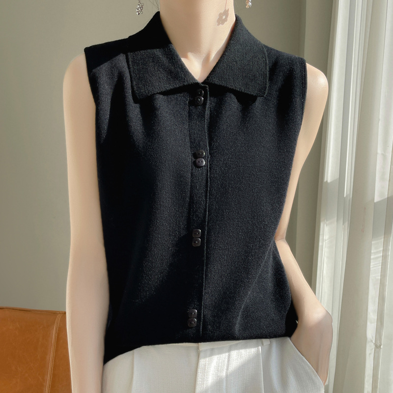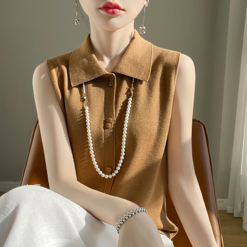 봄 2024 셔츠 칼라 민소매 니트 조끼 여성의 단색 짧은 내부 스웨터