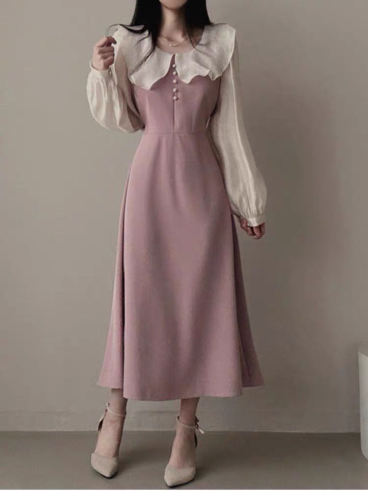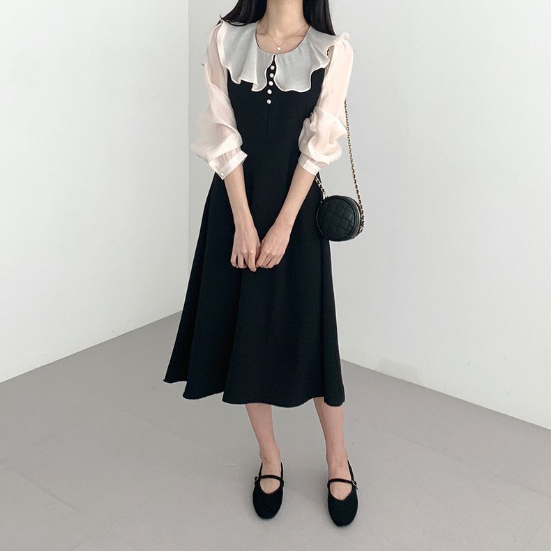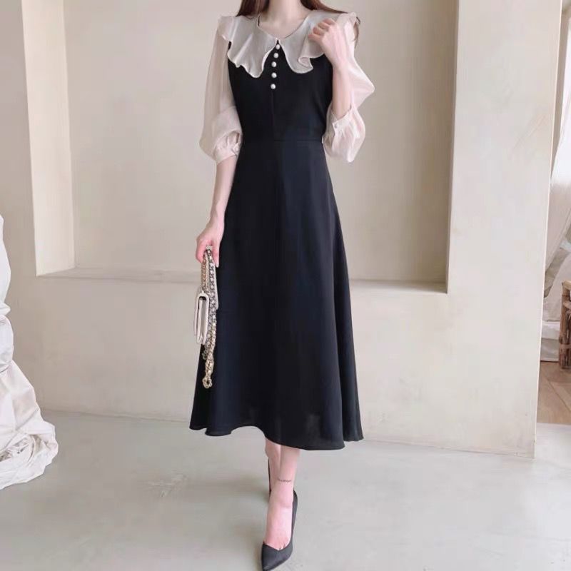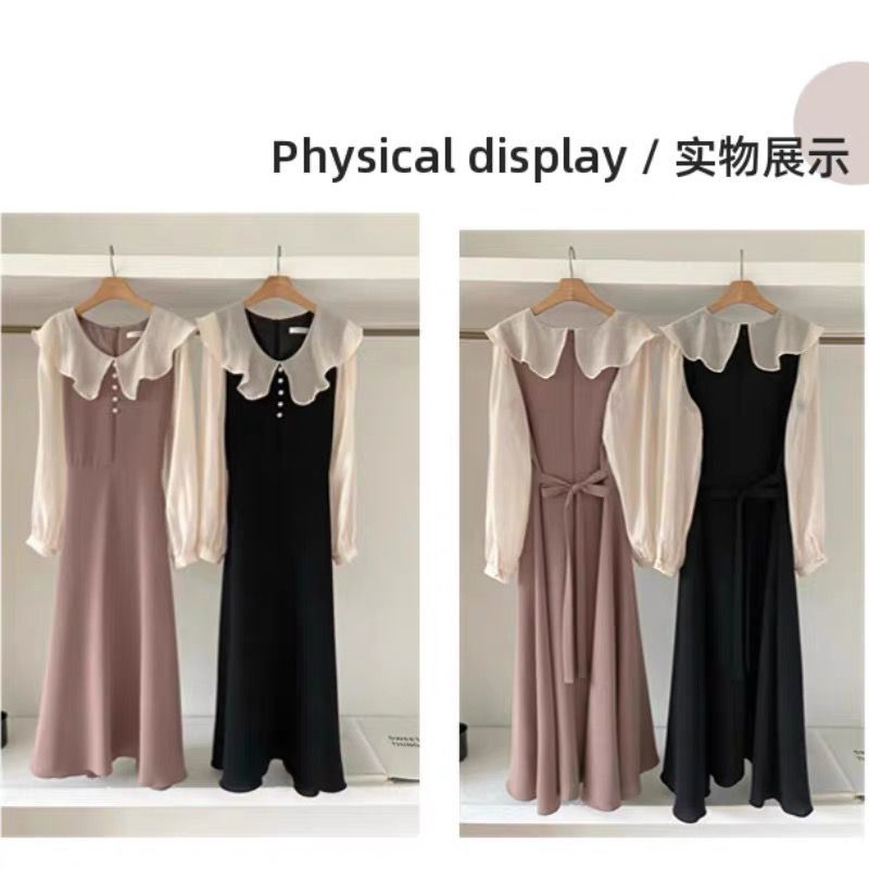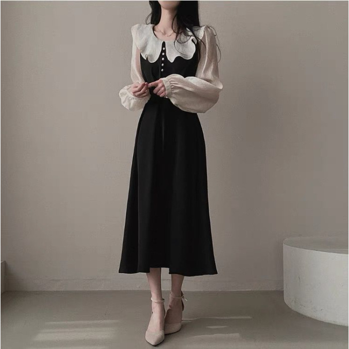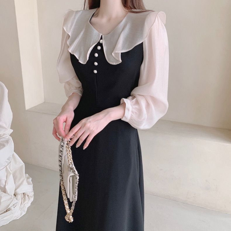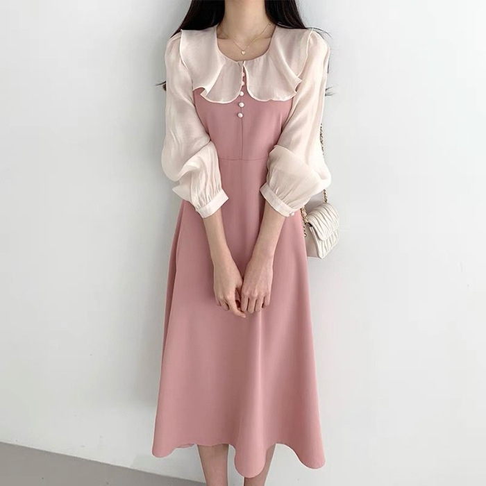 AliExpress 국경 간 봄 프랑스 기질 주름 장식 스티칭 가짜 투피스 레이스 업 허리 타이트 퍼프 슬리브 원피스 여성스토어 가기