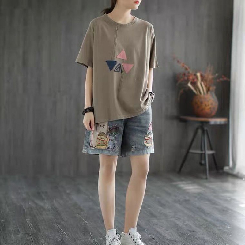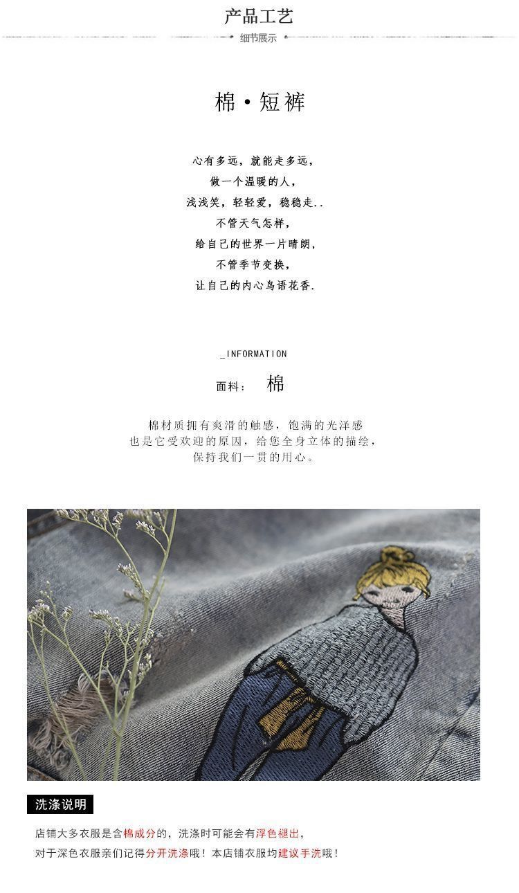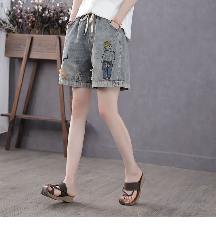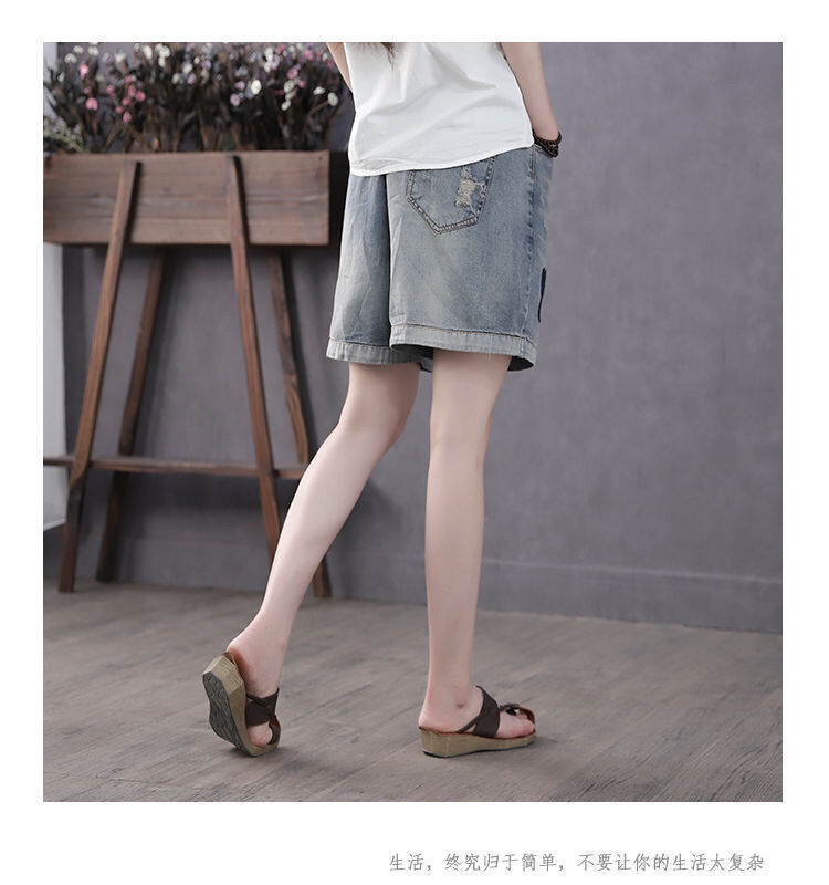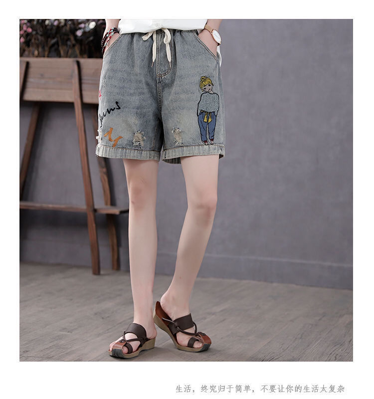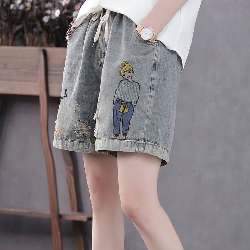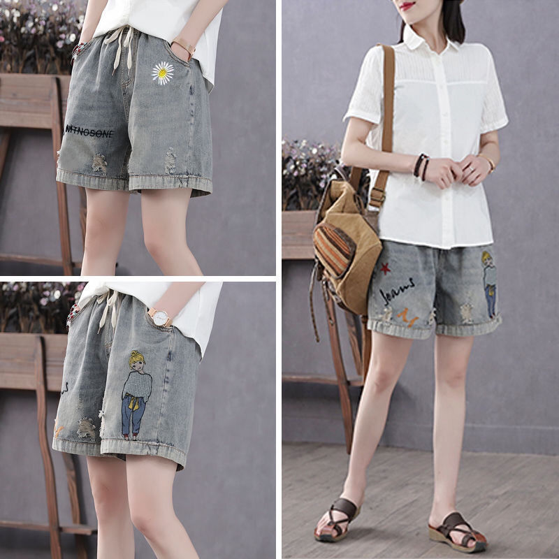 높은 허리 데님 반바지 여성 여름 새로운 느슨한 다용도 슬리밍 자수 탄성 허리 찢어진 복고풍 스트레이트 팬츠