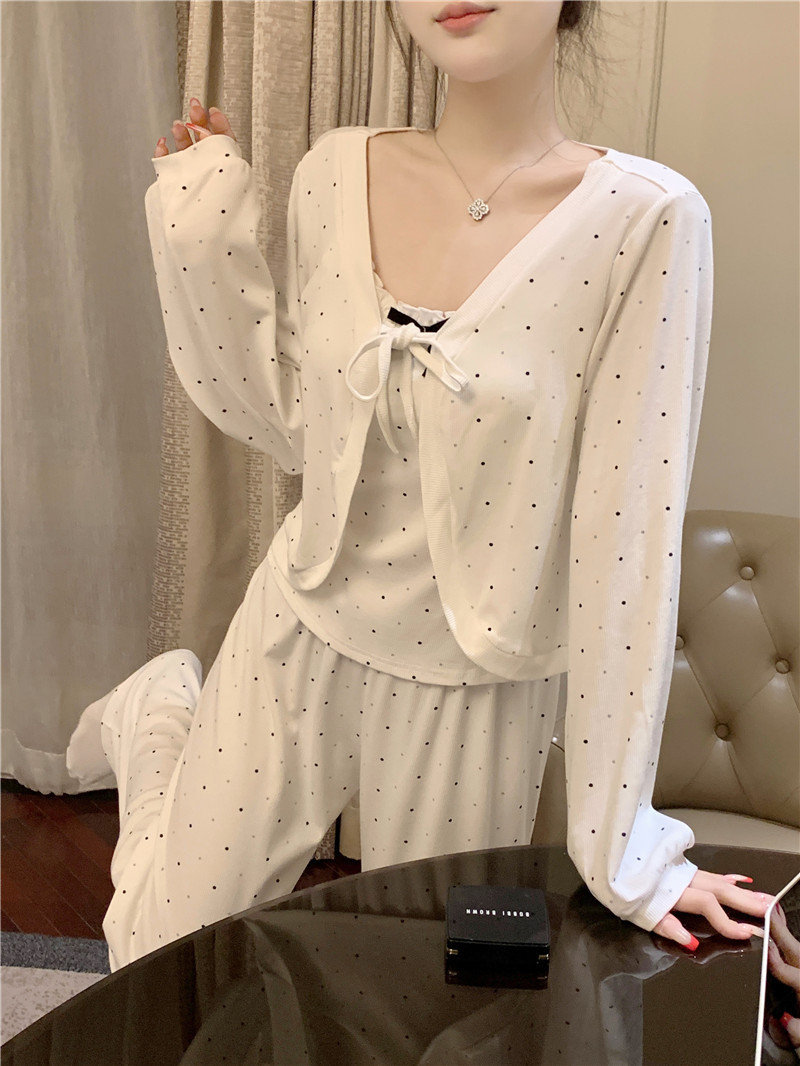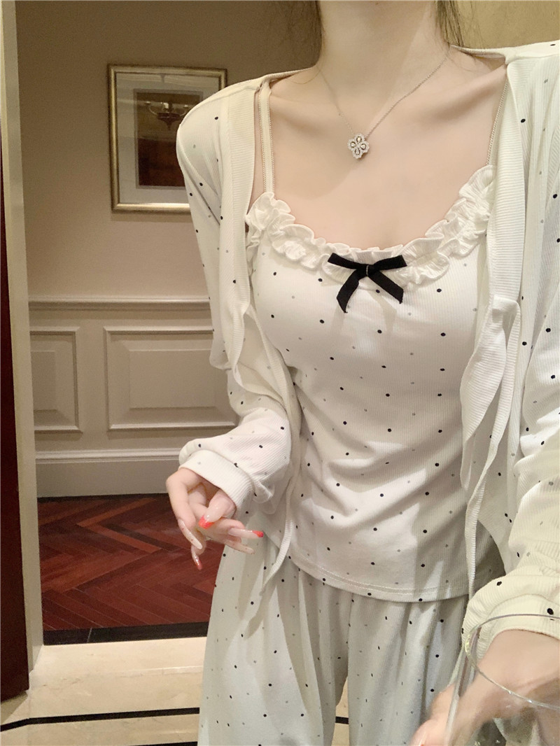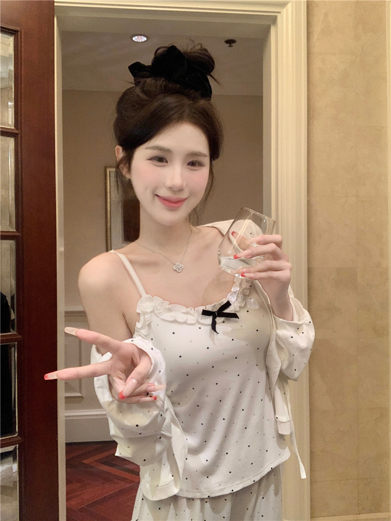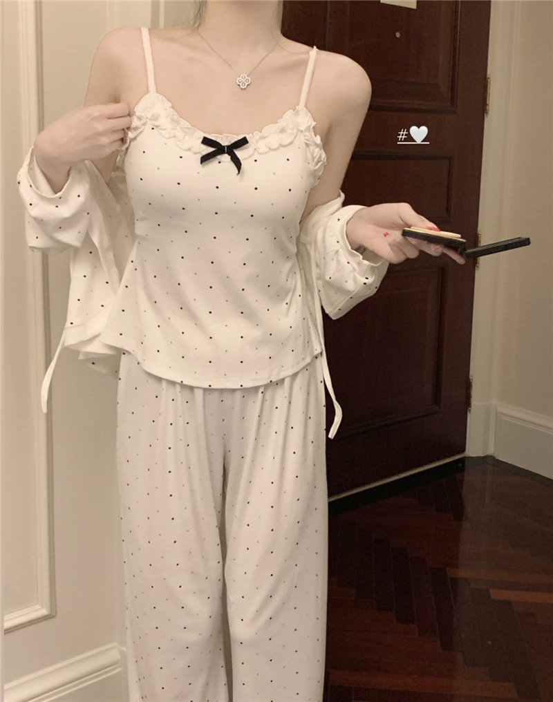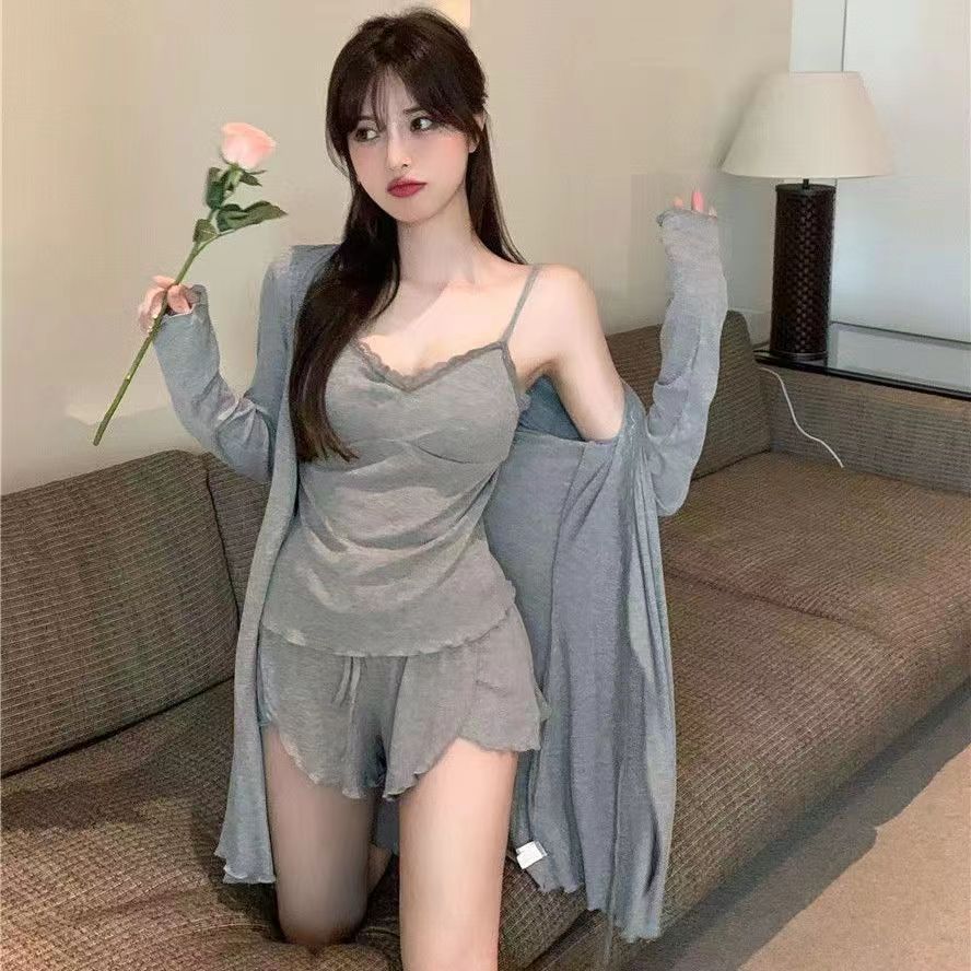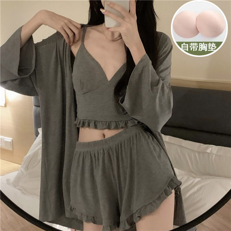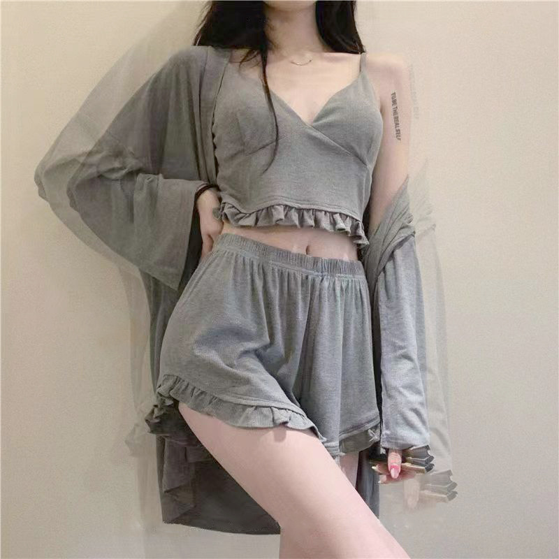 잠옷 3 피스 세트 봄과 여름 여성의 슬링 순수한 욕망 긴팔 반바지 모조 가슴 패드가 달린 면화 외출 홈 옷