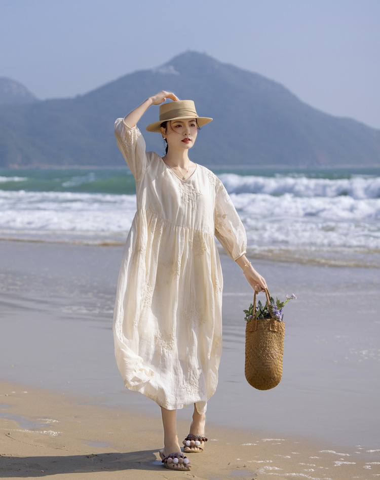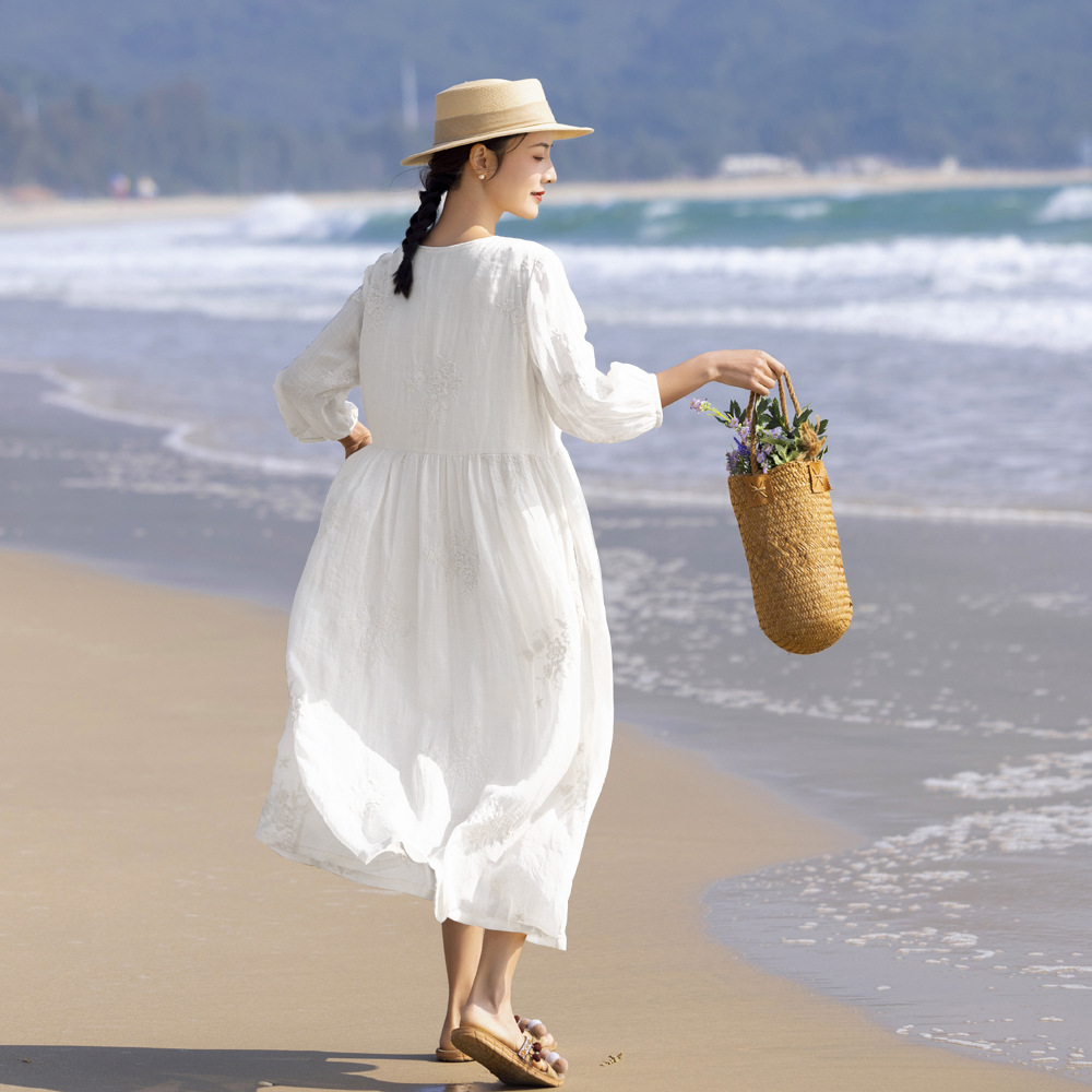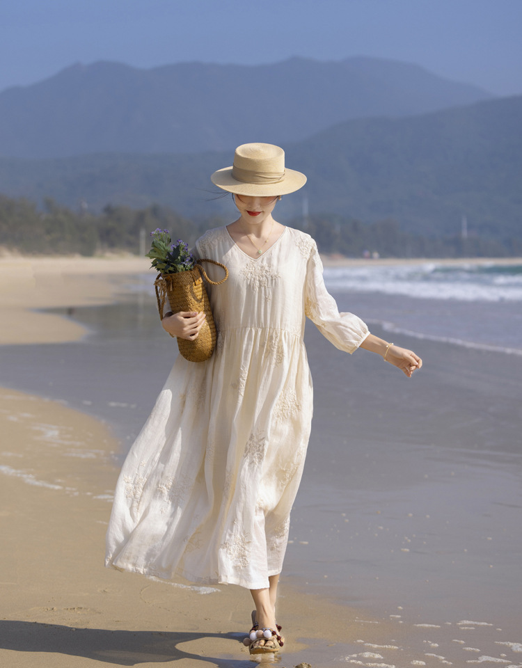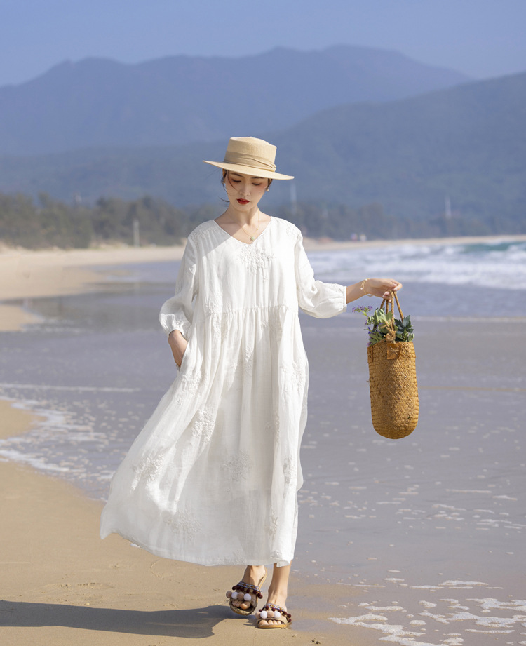 2024 봄과 여름 느슨한 라미 하이 엔드 무거운 자수 프랑스 V 넥 여행 우아한 요정 흰색 원피스