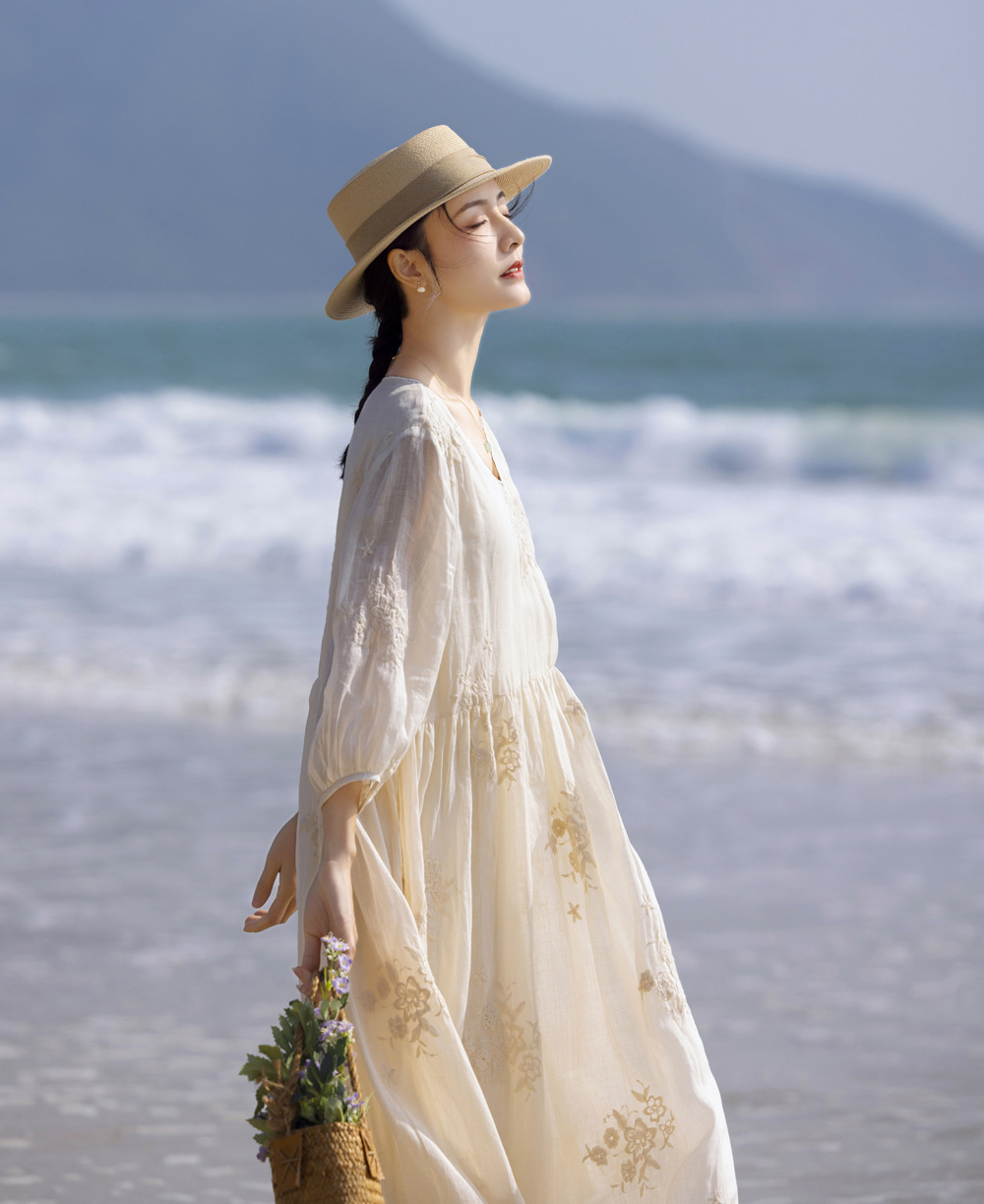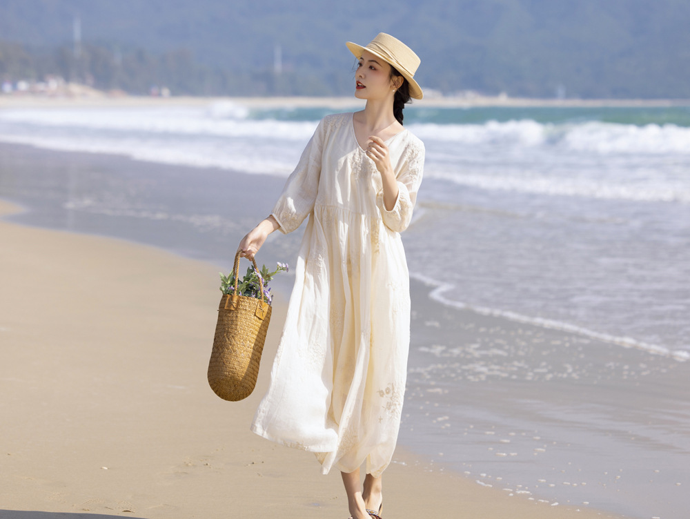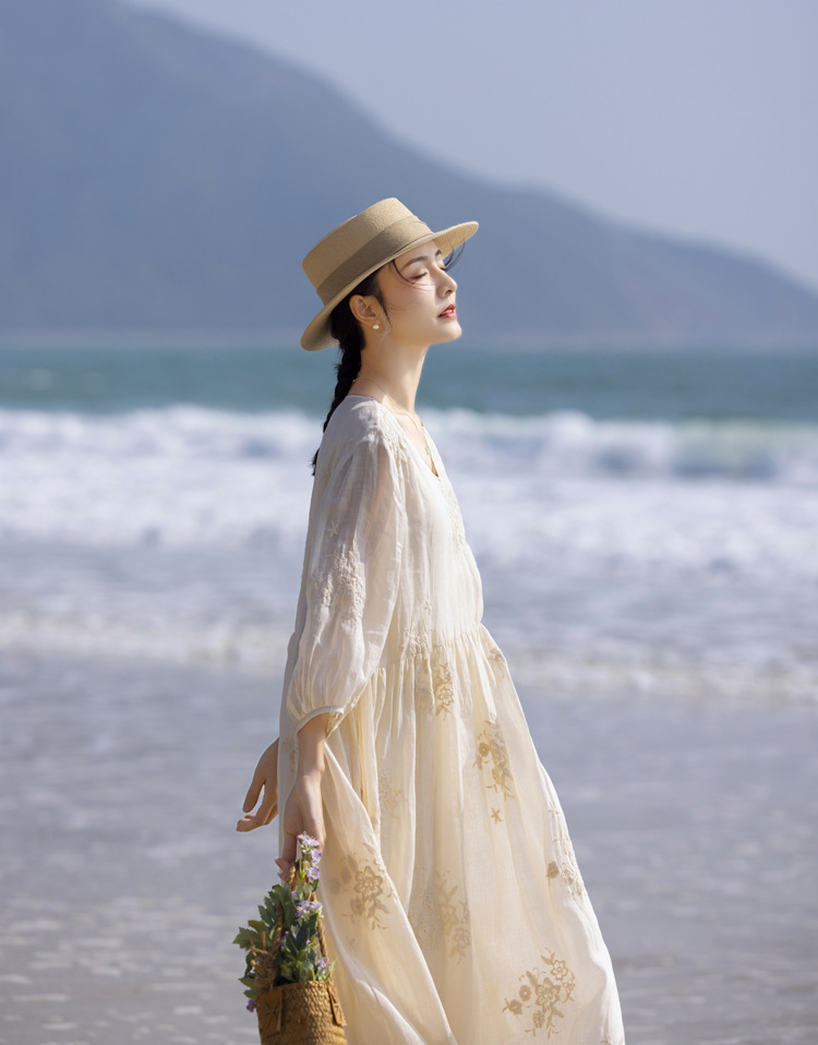 2024 봄과 여름 느슨한 라미 하이 엔드 무거운 자수 프랑스 V 넥 여행 우아한 요정 흰색 원피스스토어 가기