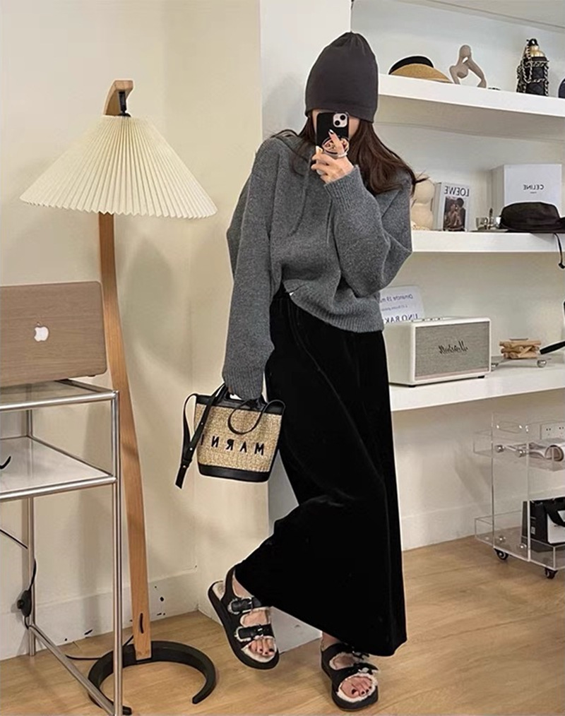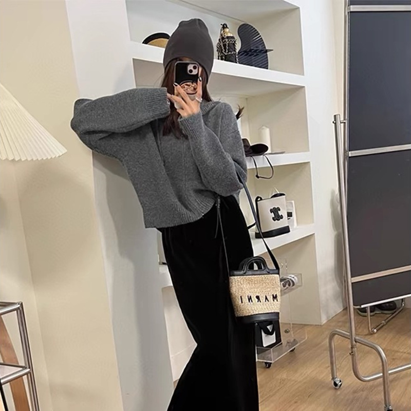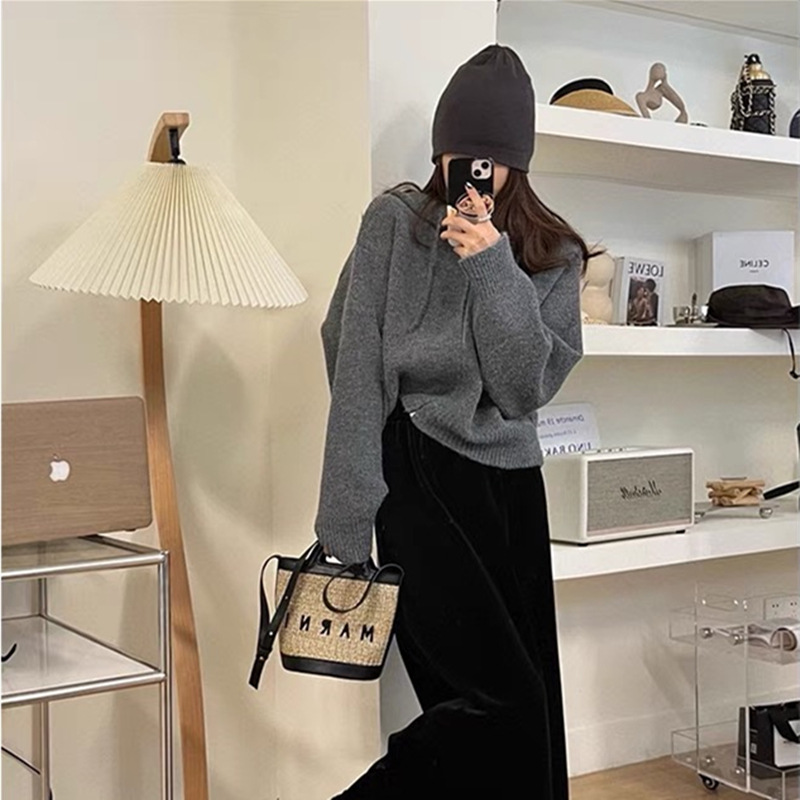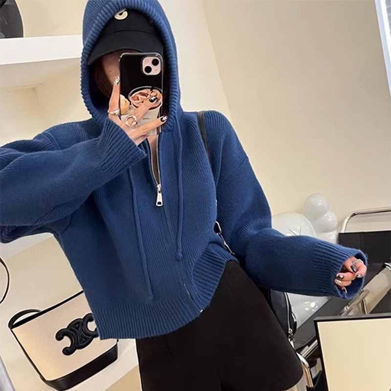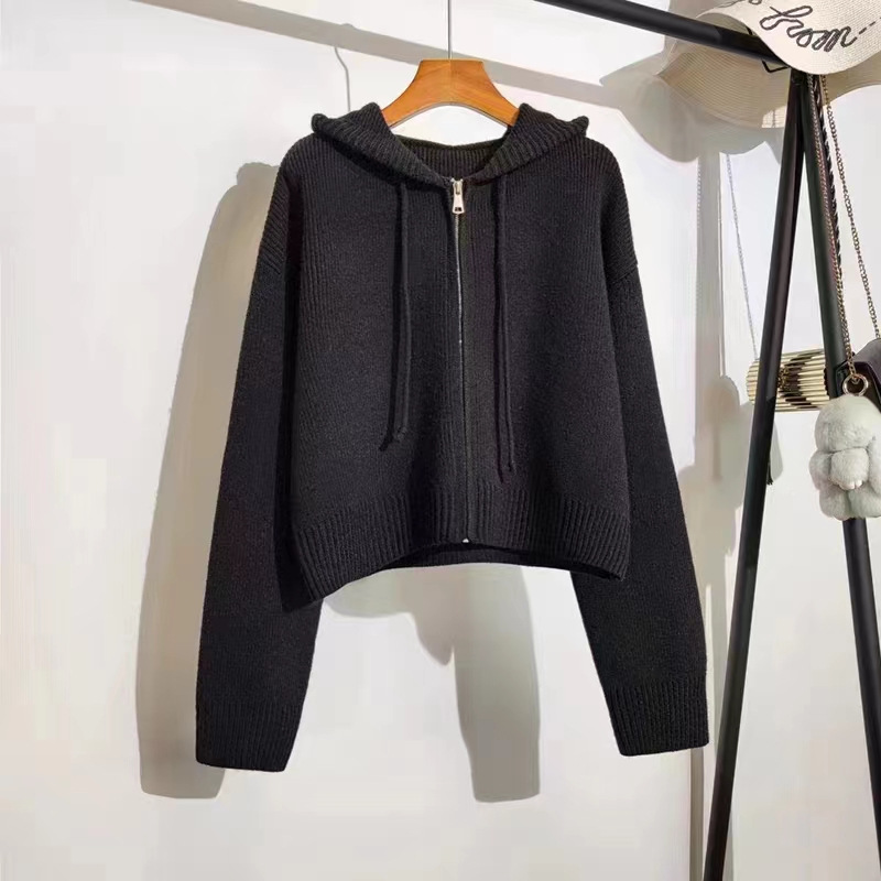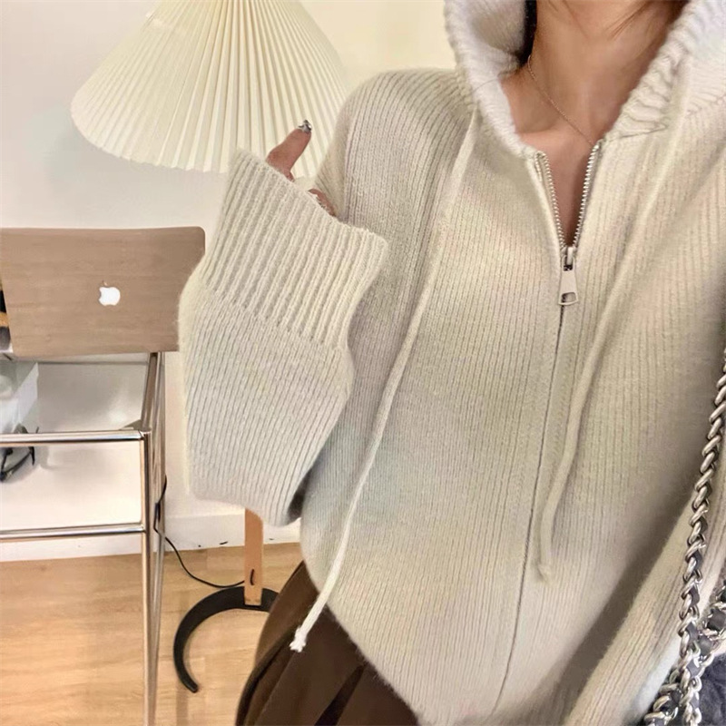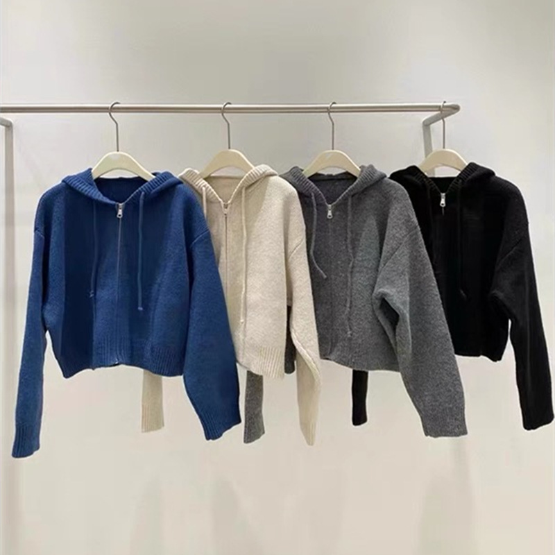 한국식 디자인 지퍼 후드 니트 카디건 여성 봄과 가을 새로운 느슨한 캐주얼 짧은 게으른 스웨터 코트스토어 가기