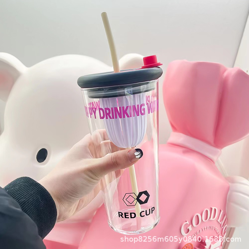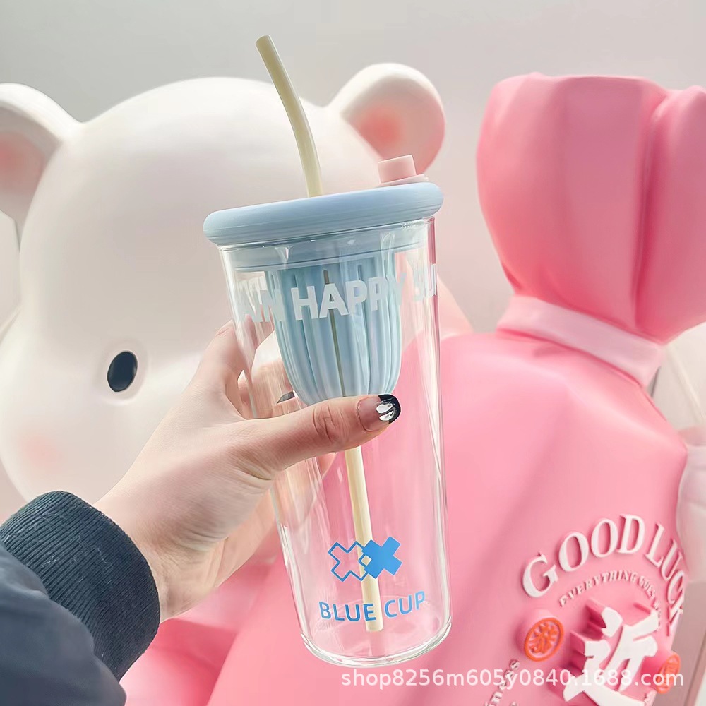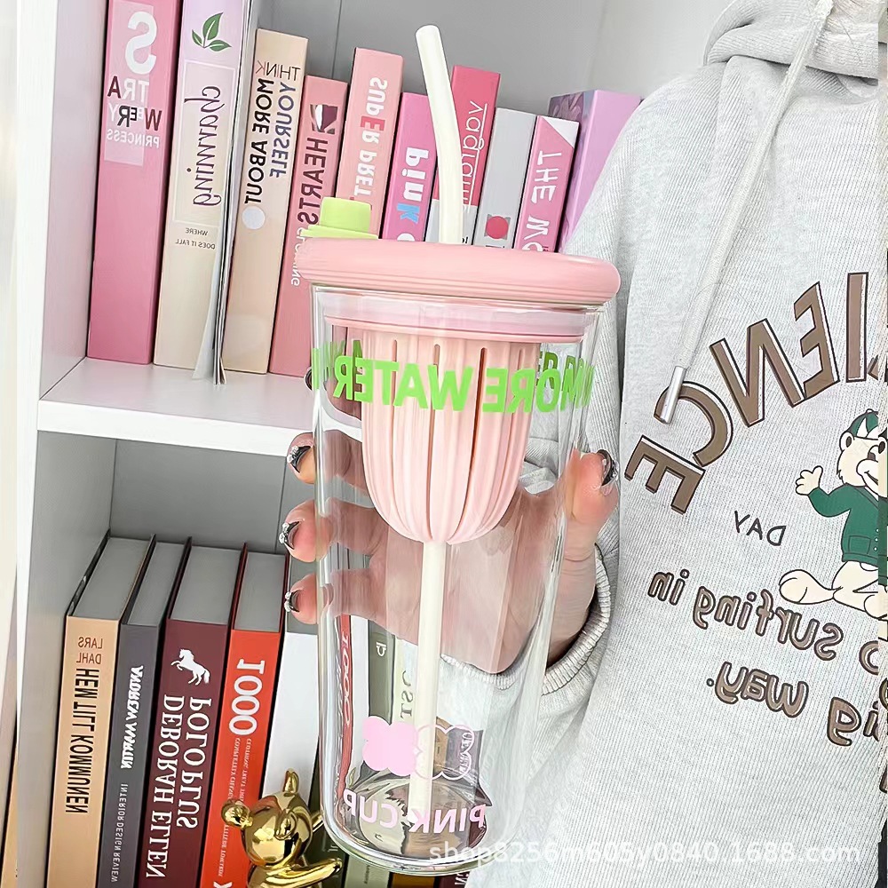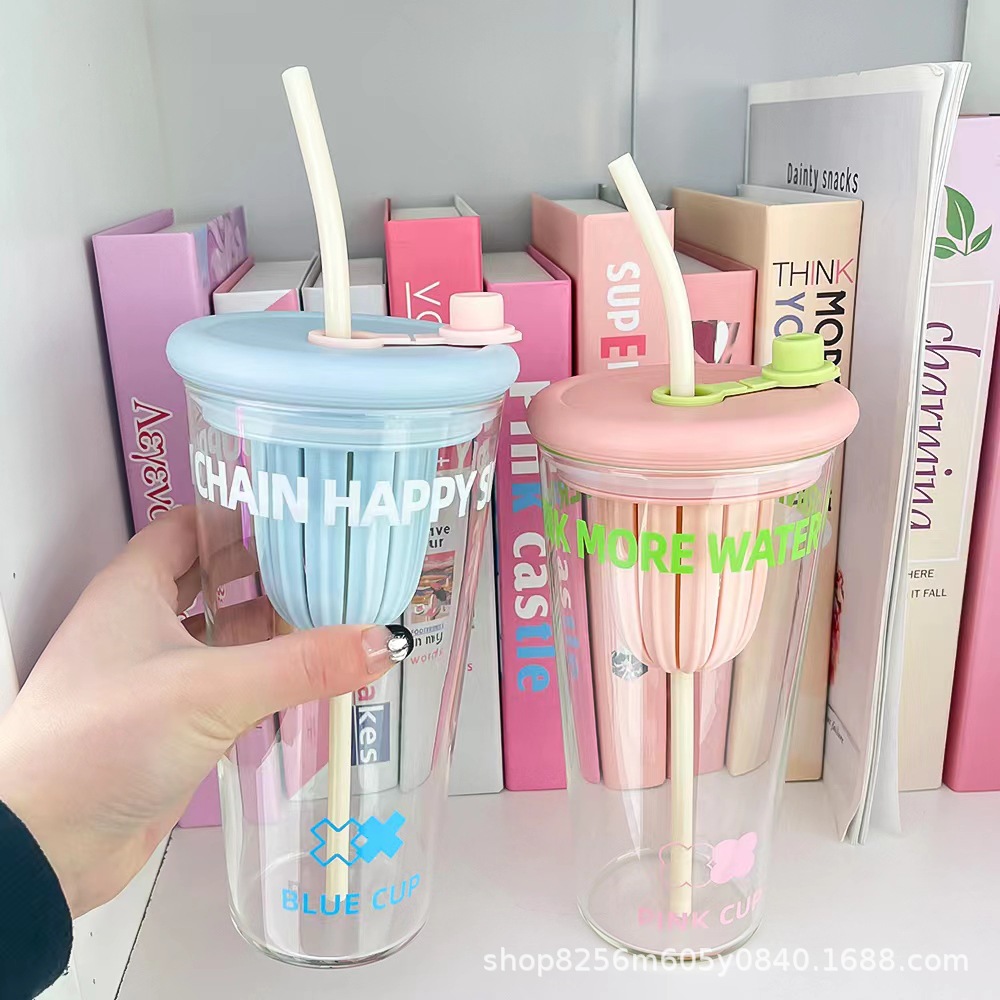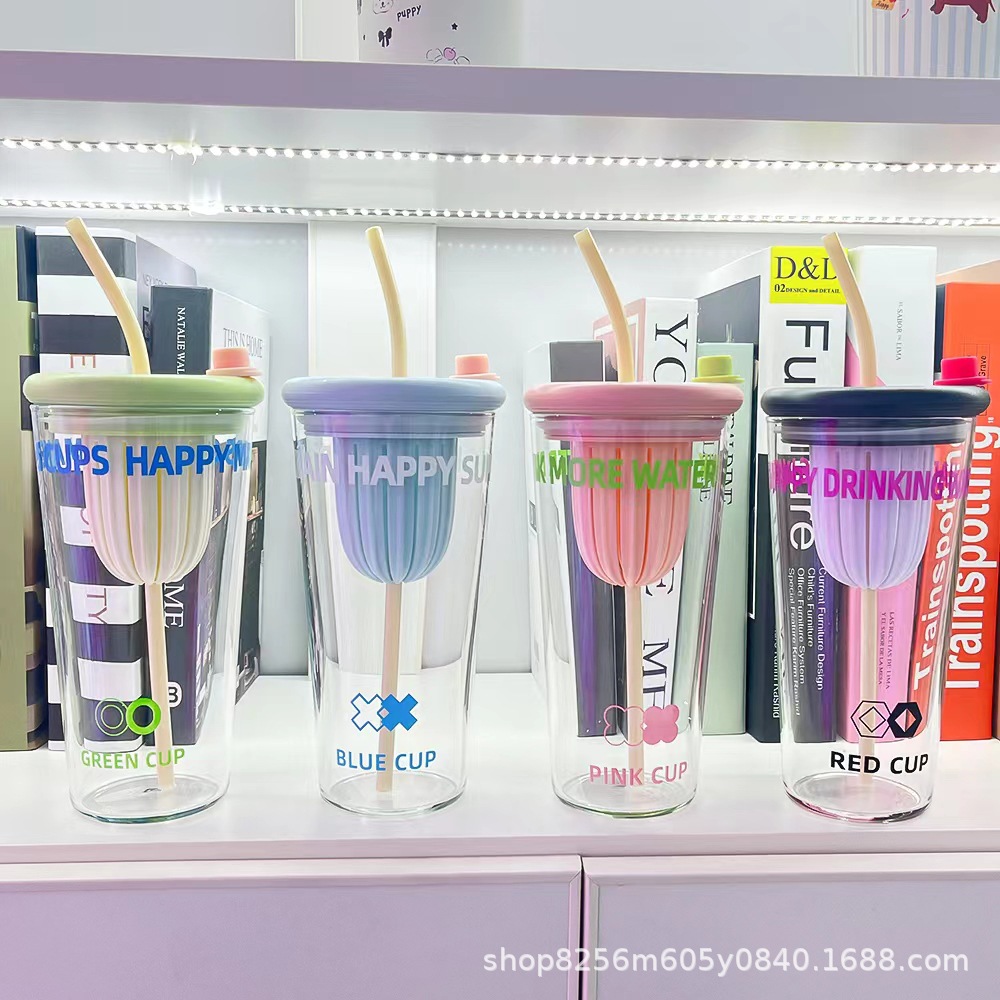 고붕규산 유리컵 여성용 고급스러운 가정용 물컵 차와 물 분리컵 대용량 빨대컵