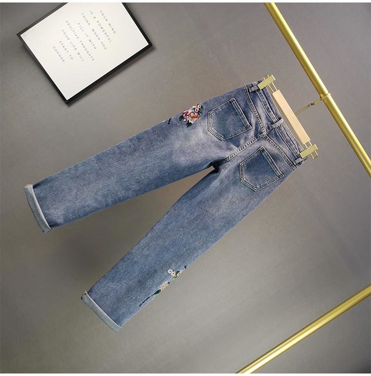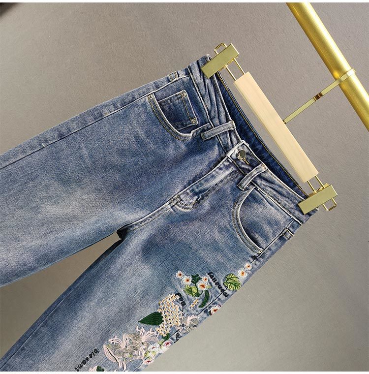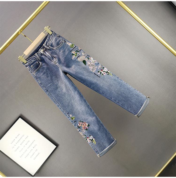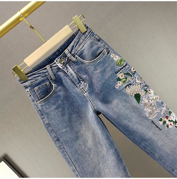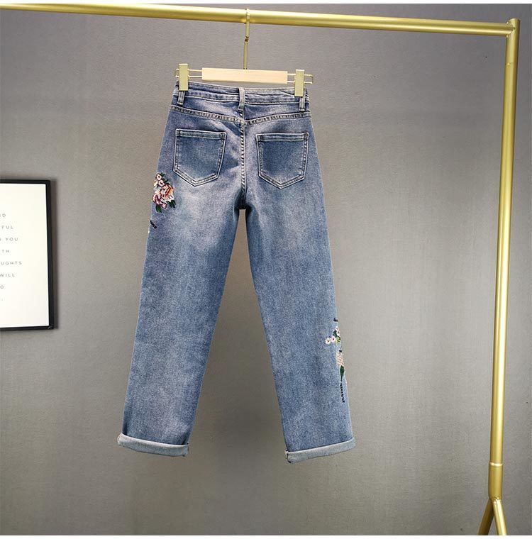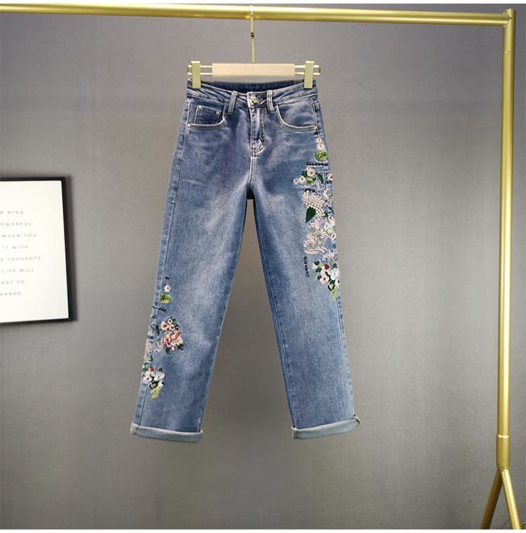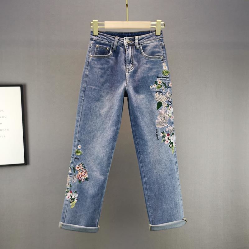 재고 있음] 여성용 에스닉 스타일 자수 스트레이트 청바지 2024 봄 신작 코튼 스트레치 하이 웨이스트 루즈 슬리밍 담배 파이프스토어 가기