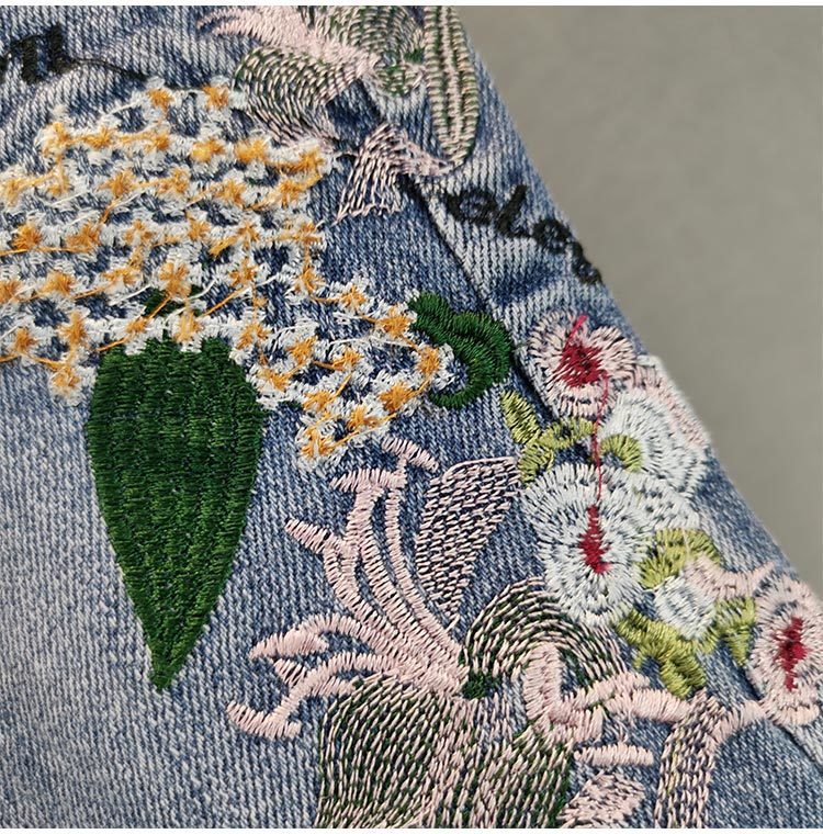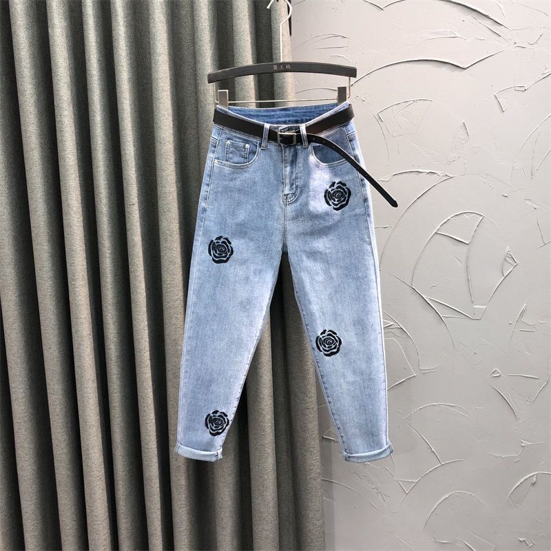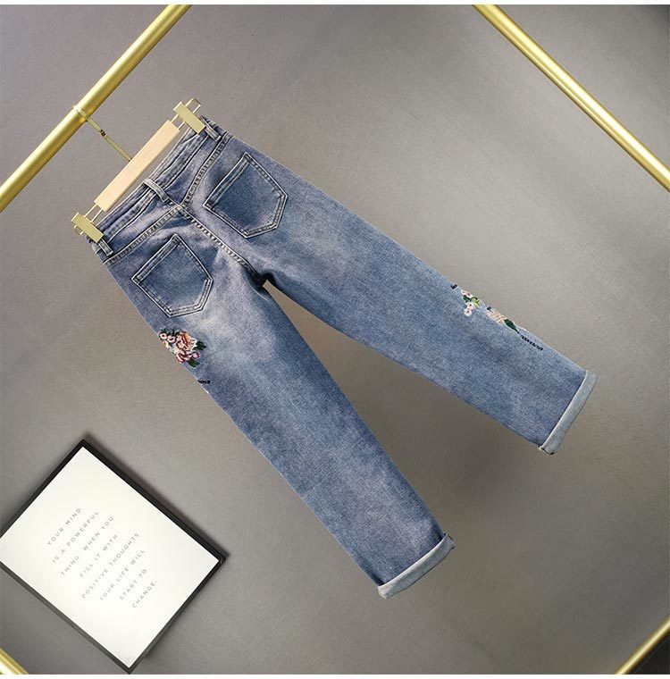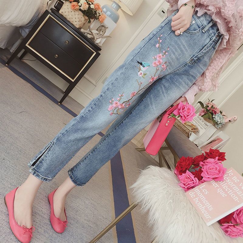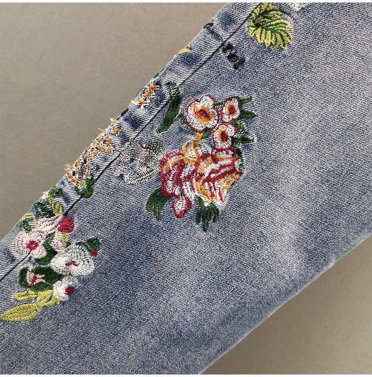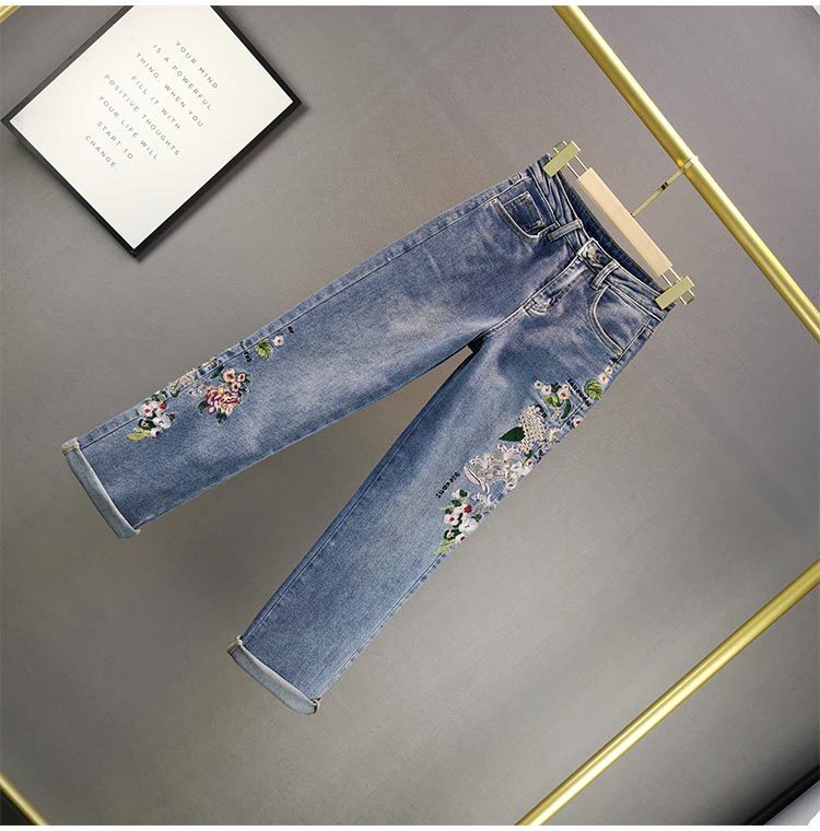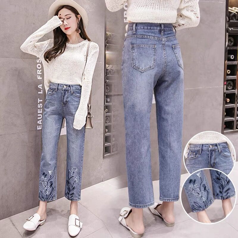 재고 있음] 여성용 에스닉 스타일 자수 스트레이트 청바지 2024 봄 신작 코튼 스트레치 하이 웨이스트 루즈 슬리밍 담배 파이프스토어 가기