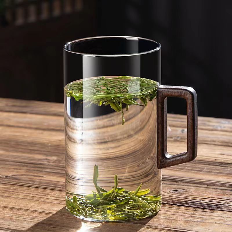 새로운 나무 손잡이 녹차 컵 고온 저항 유리 남자 사무실 다도 차 컵 개인 유리 도매