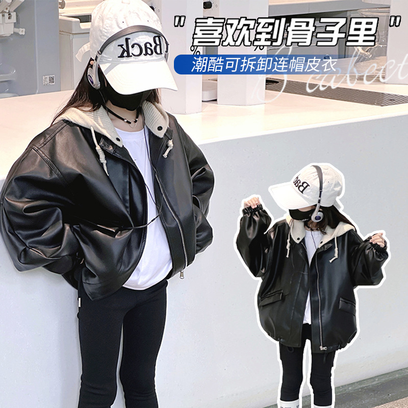 소녀 가죽 자켓 봄과 가을 2024 새로운 어린이 한국 스타일 서양식 가죽 자켓 중 큰 어린이 소녀 후드 가죽 재킷