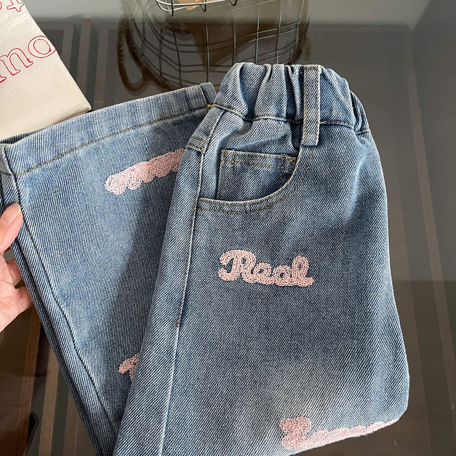 여자 청바지 2024 봄 새로운 한국식 어린이 편지 수 놓은 여자 데님 바지 국경 배달
