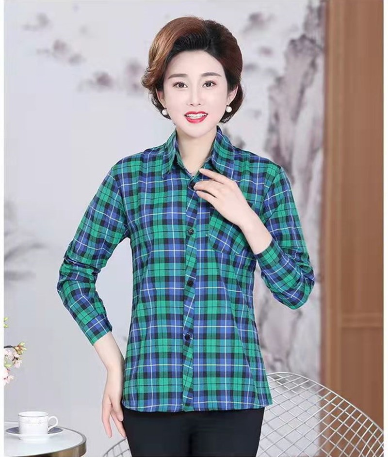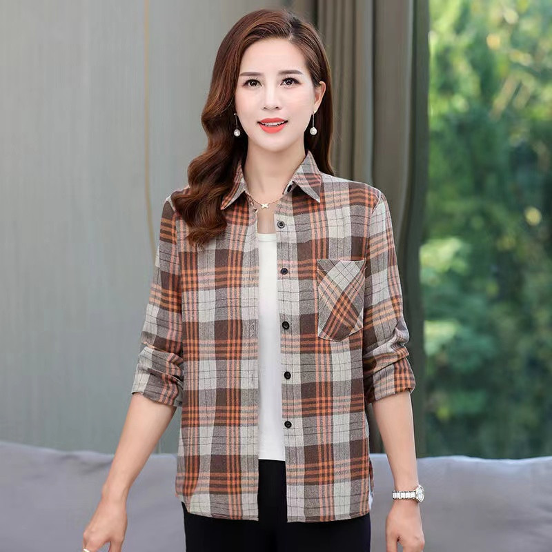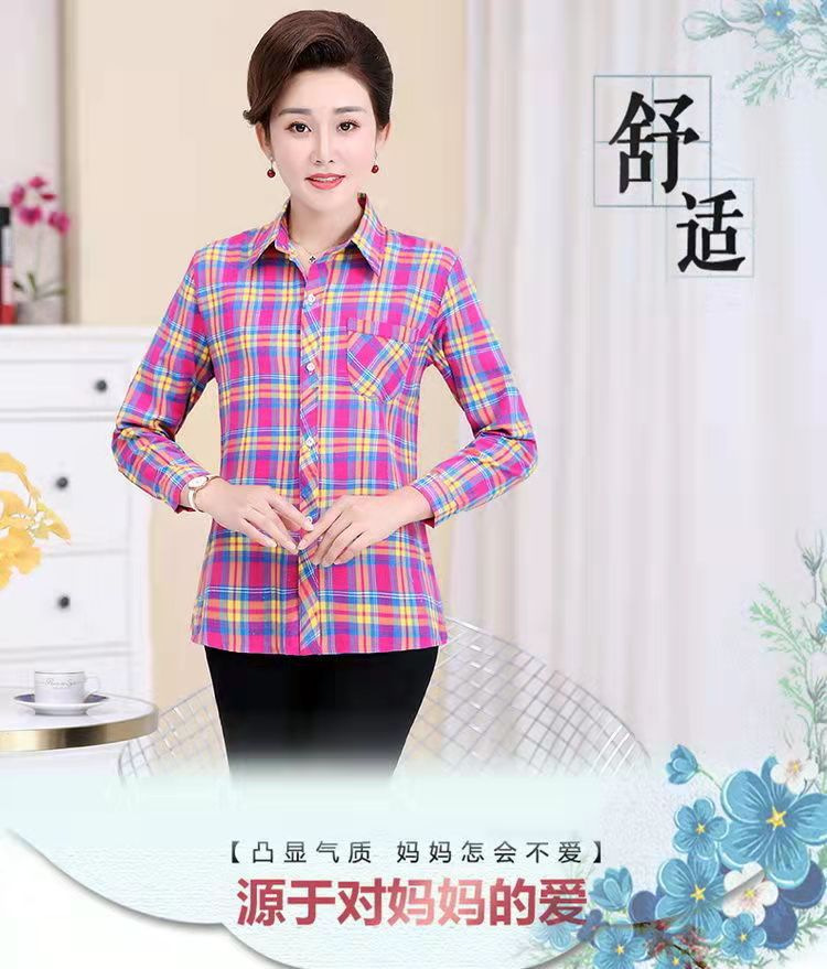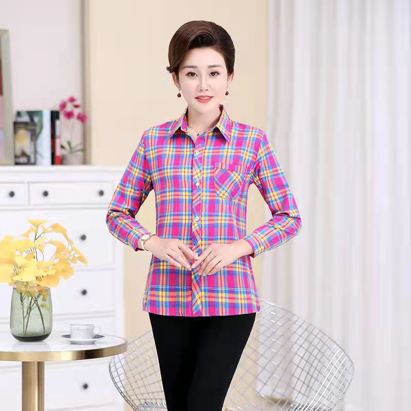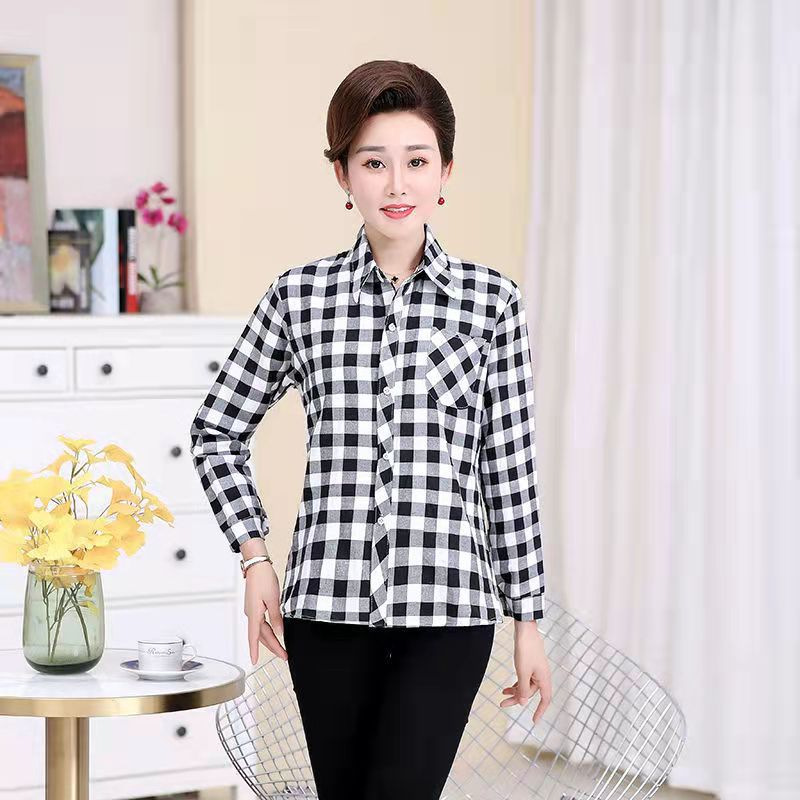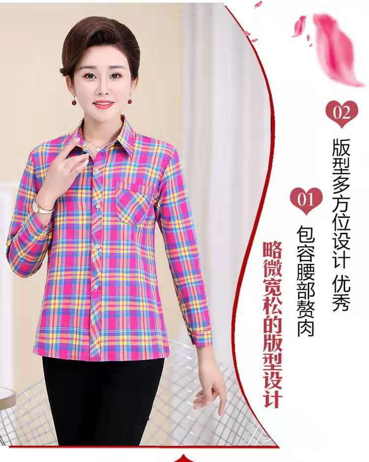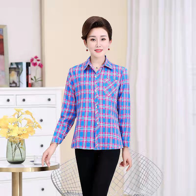 봄과 가을 긴팔 체크 무늬 셔츠 여성 루즈 카디건 엄마 얇은 탑 캐주얼 셔츠 중년 및 노년 여성을위한 유행 셔츠스토어 가기