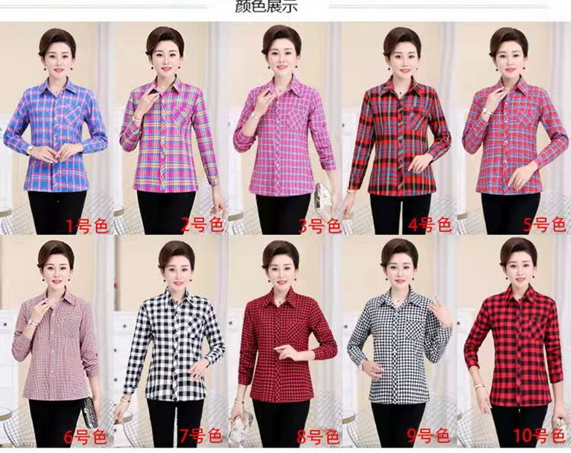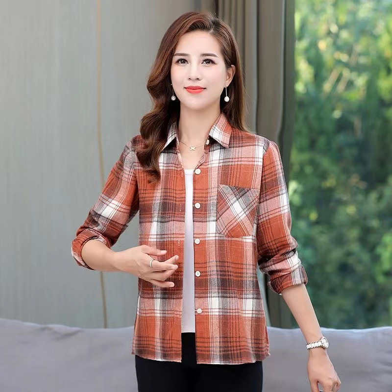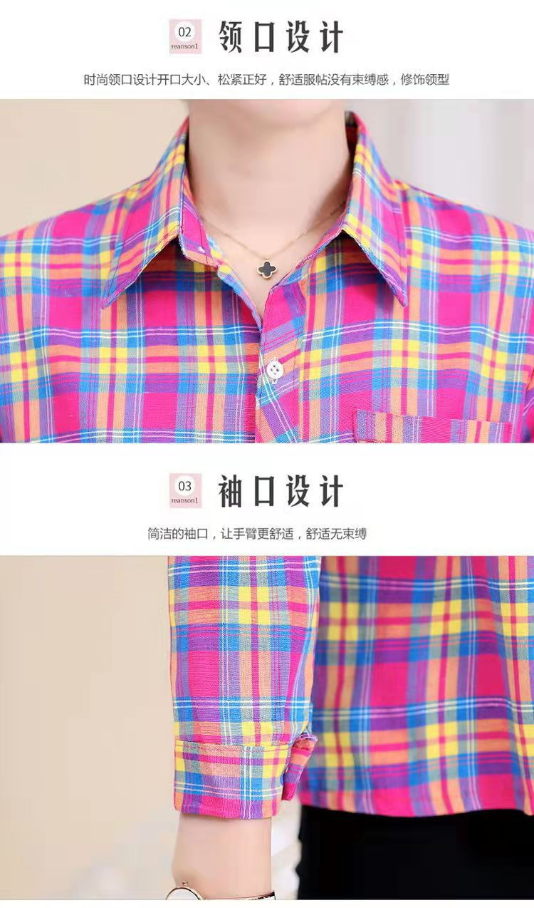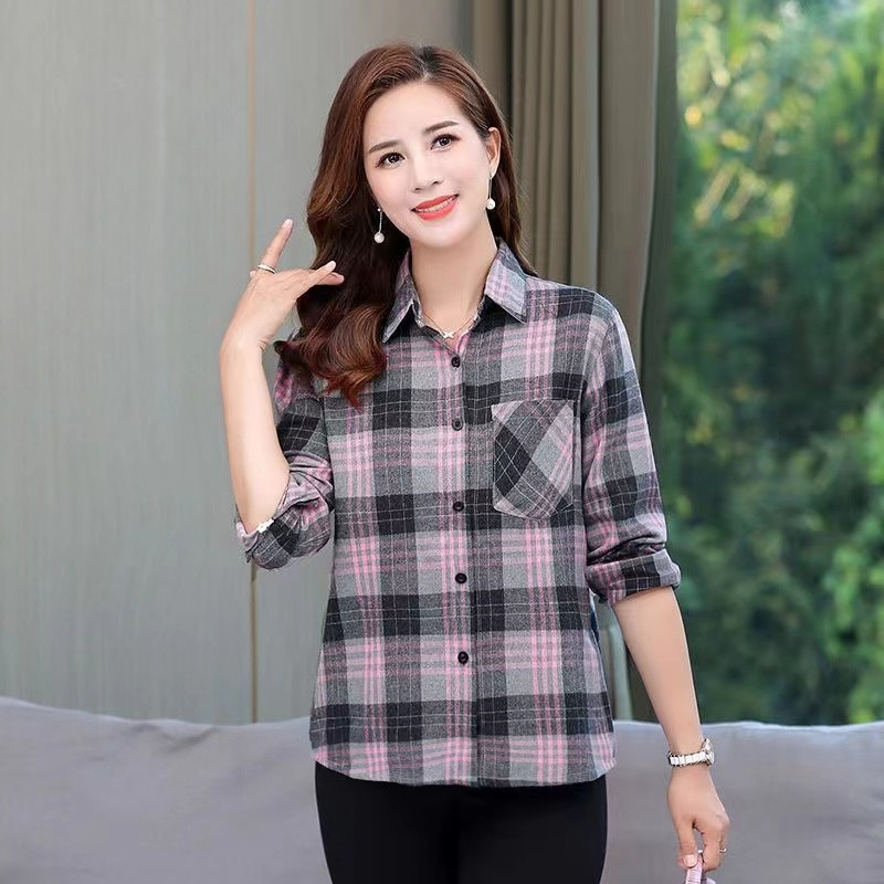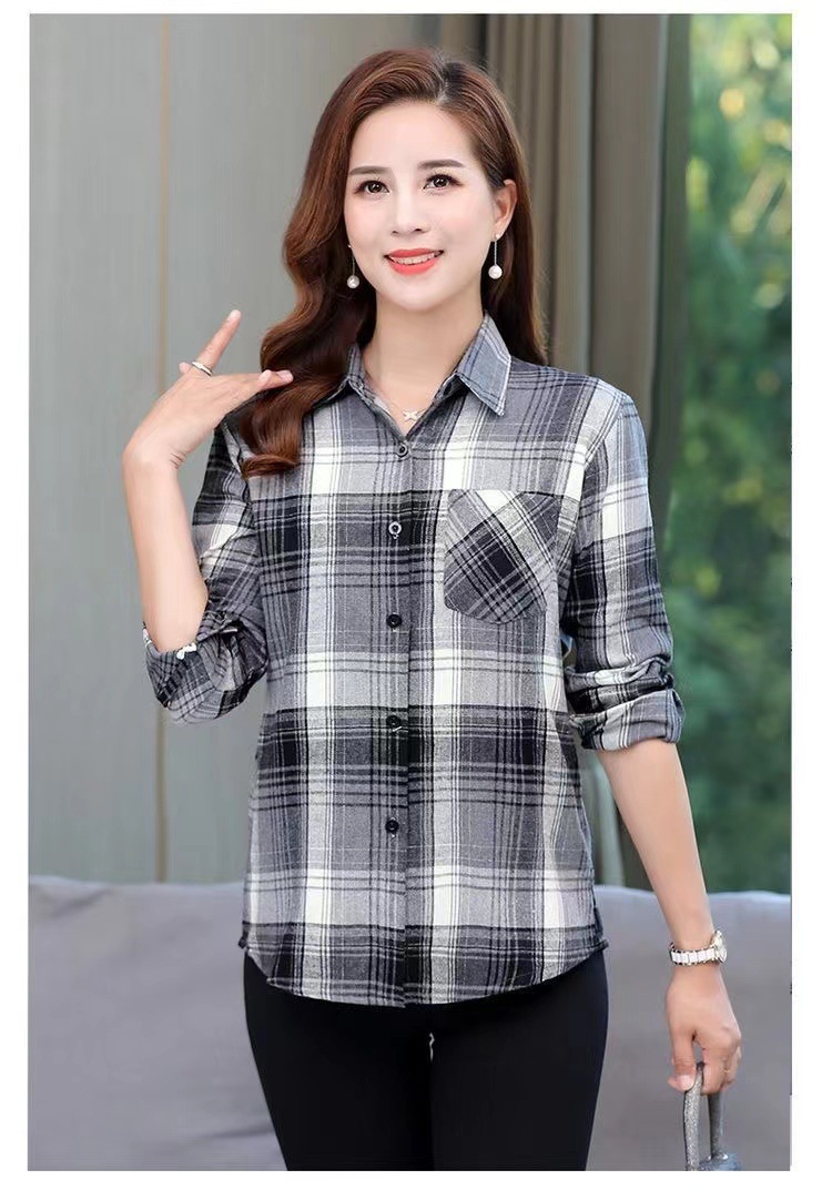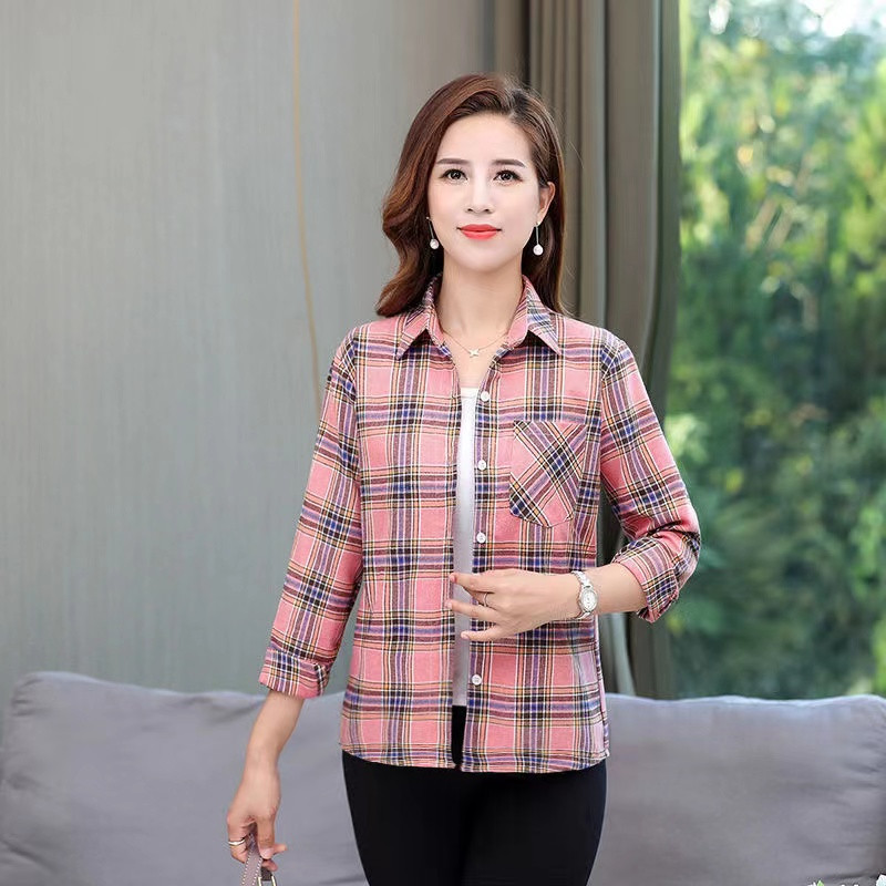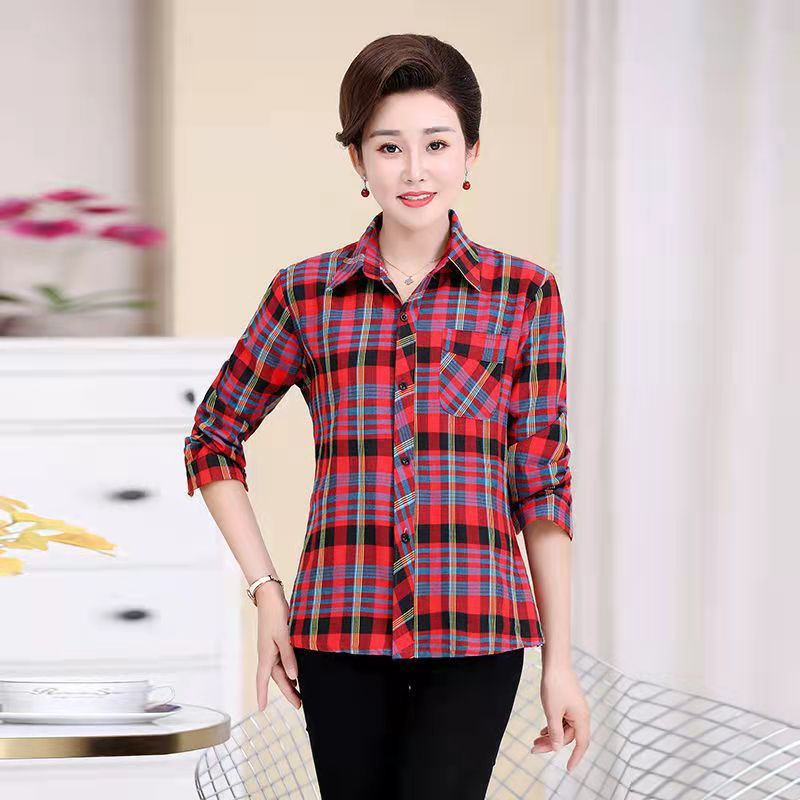 봄과 가을 긴팔 체크 무늬 셔츠 여성 루즈 카디건 엄마 얇은 탑 캐주얼 셔츠 중년 및 노년 여성을위한 유행 셔츠스토어 가기