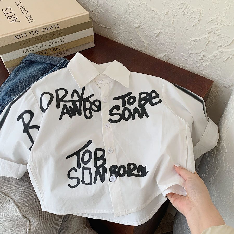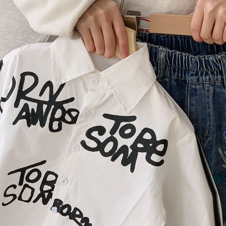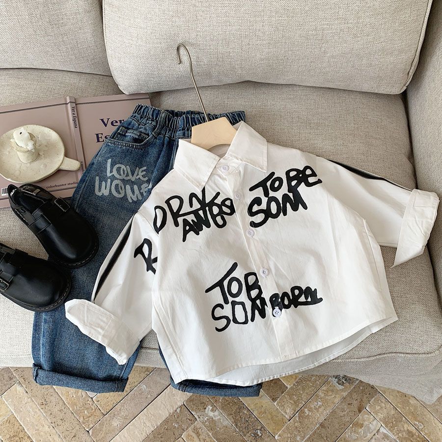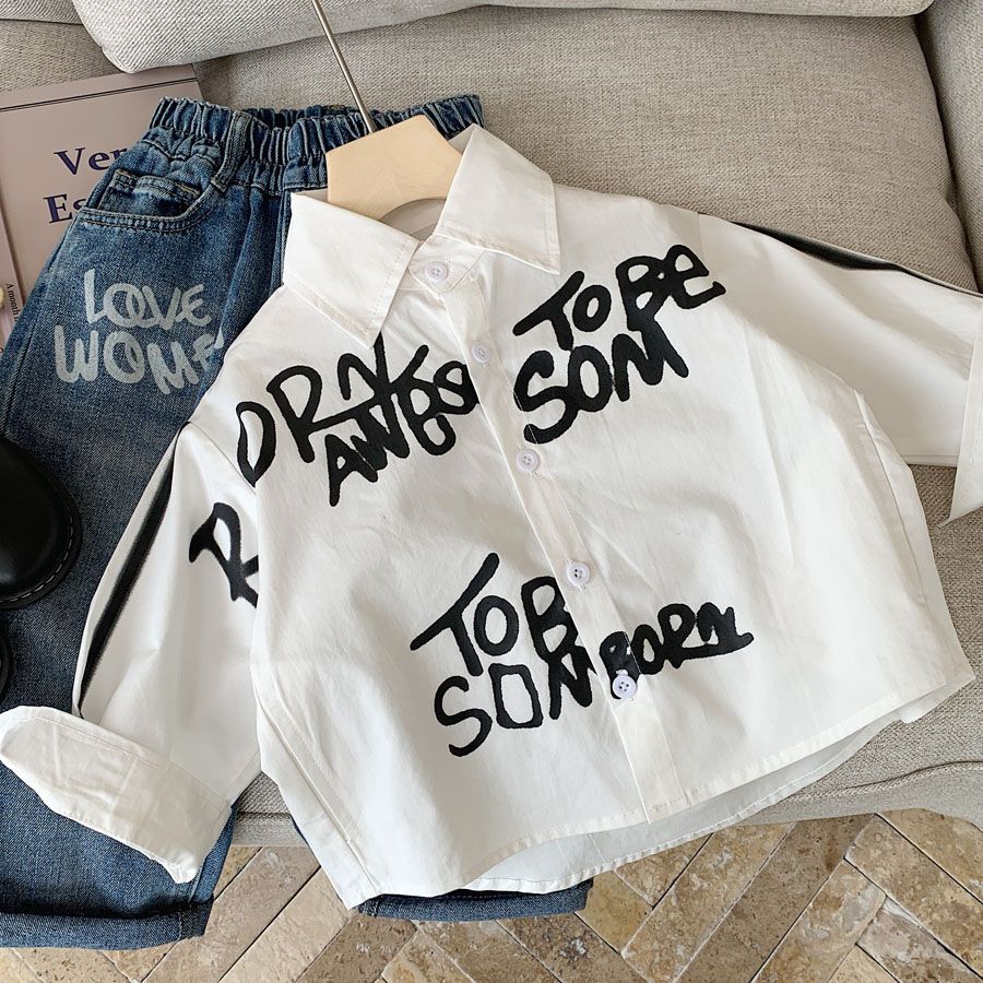 소년 셔츠 2025 가을 새로운 스타일 어린이 유행 편지 낙서 한국 스타일 유행 캐주얼 루즈 셔츠스토어 가기