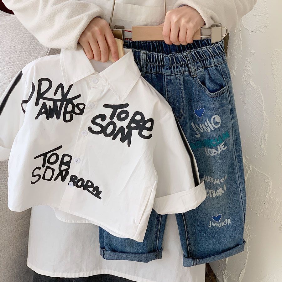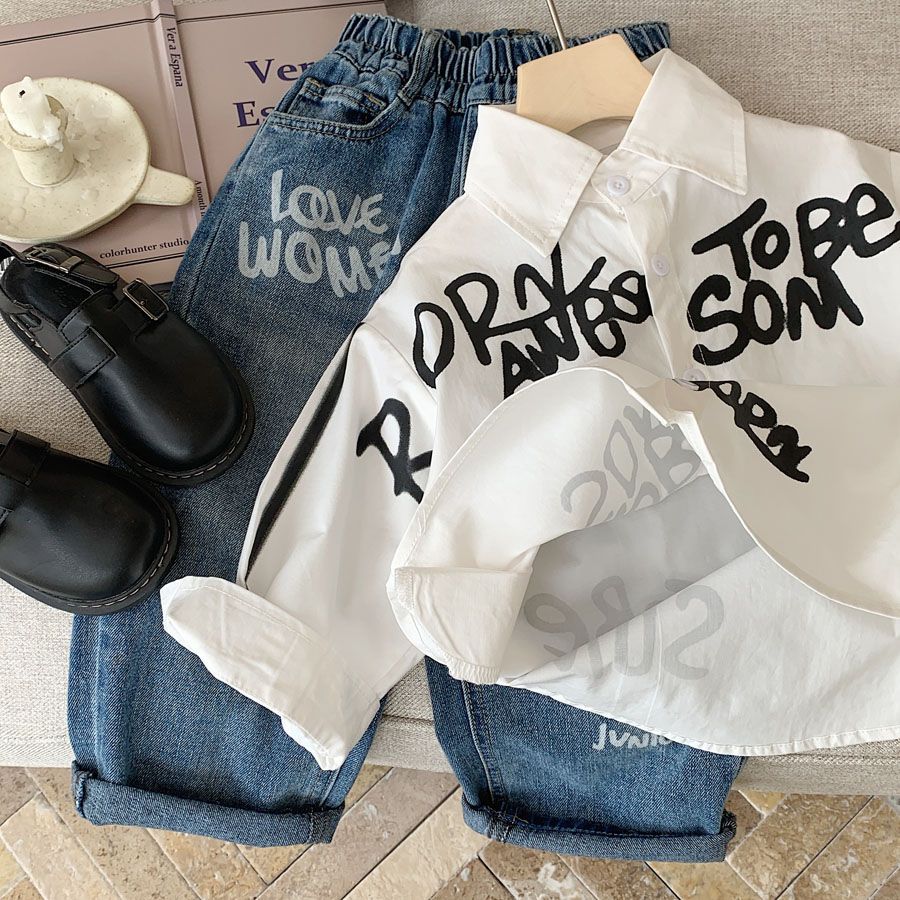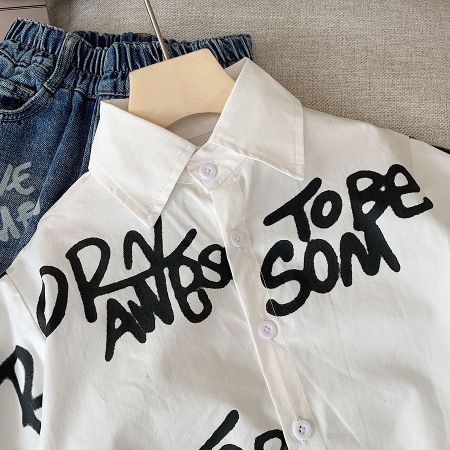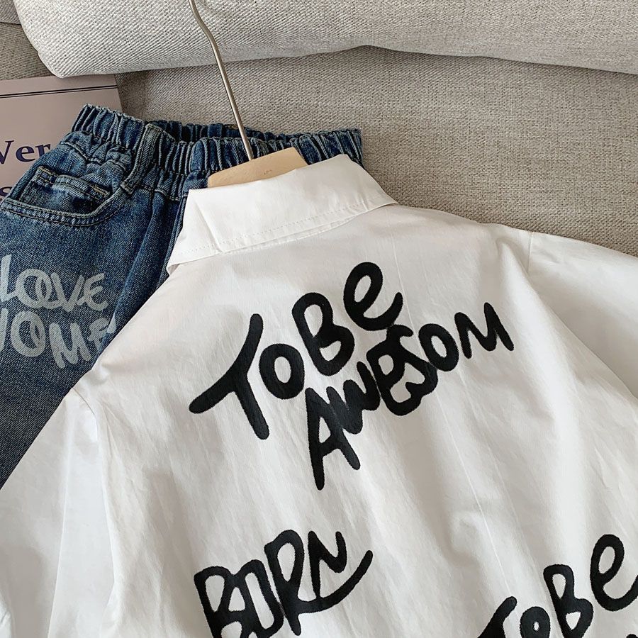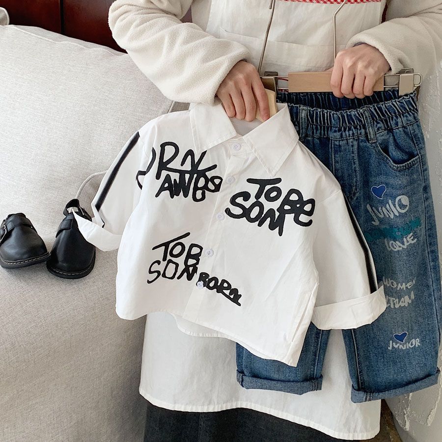소년 셔츠 2025 가을 새로운 스타일 어린이 유행 편지 낙서 한국 스타일 유행 캐주얼 루즈 셔츠스토어 가기
