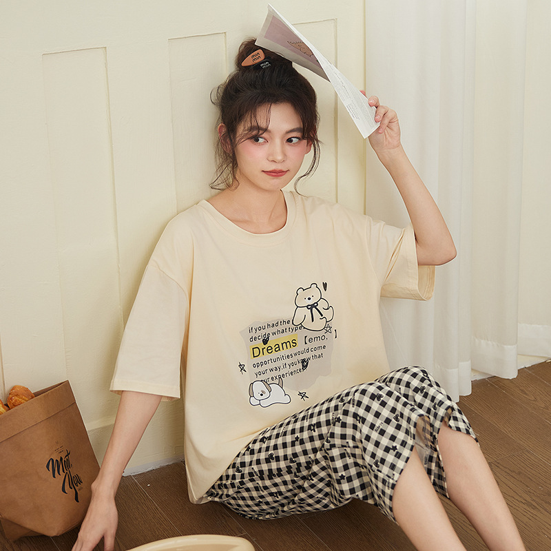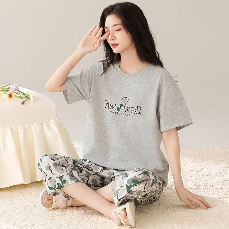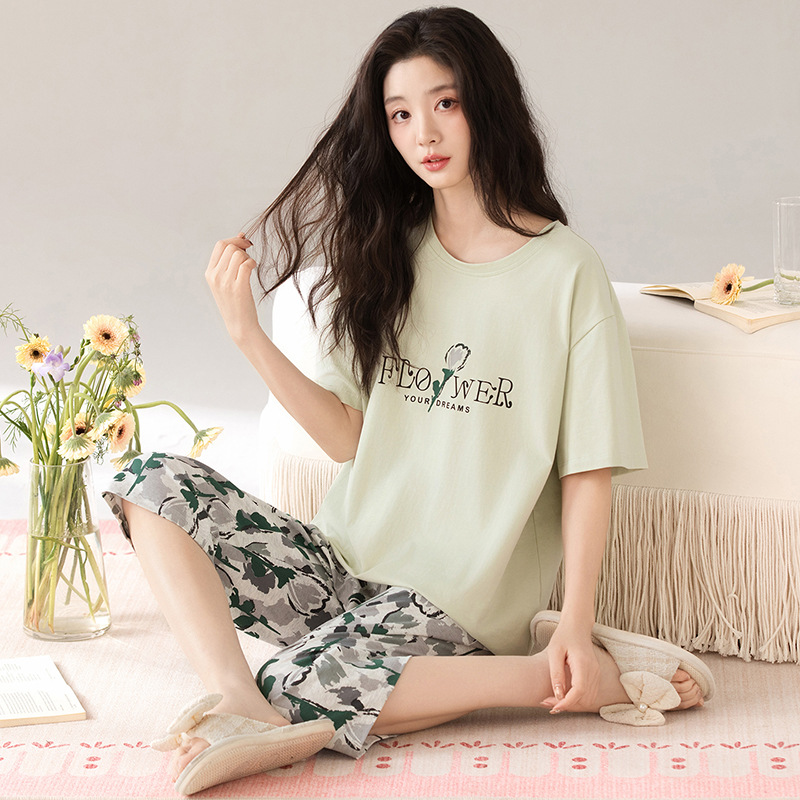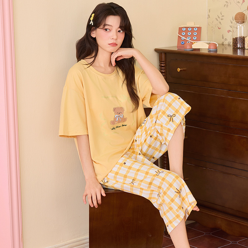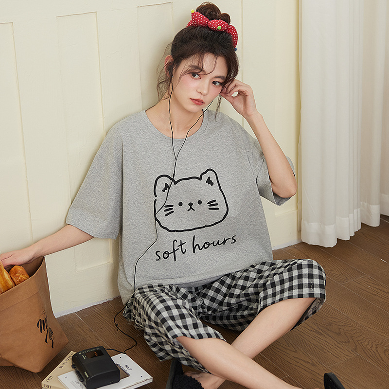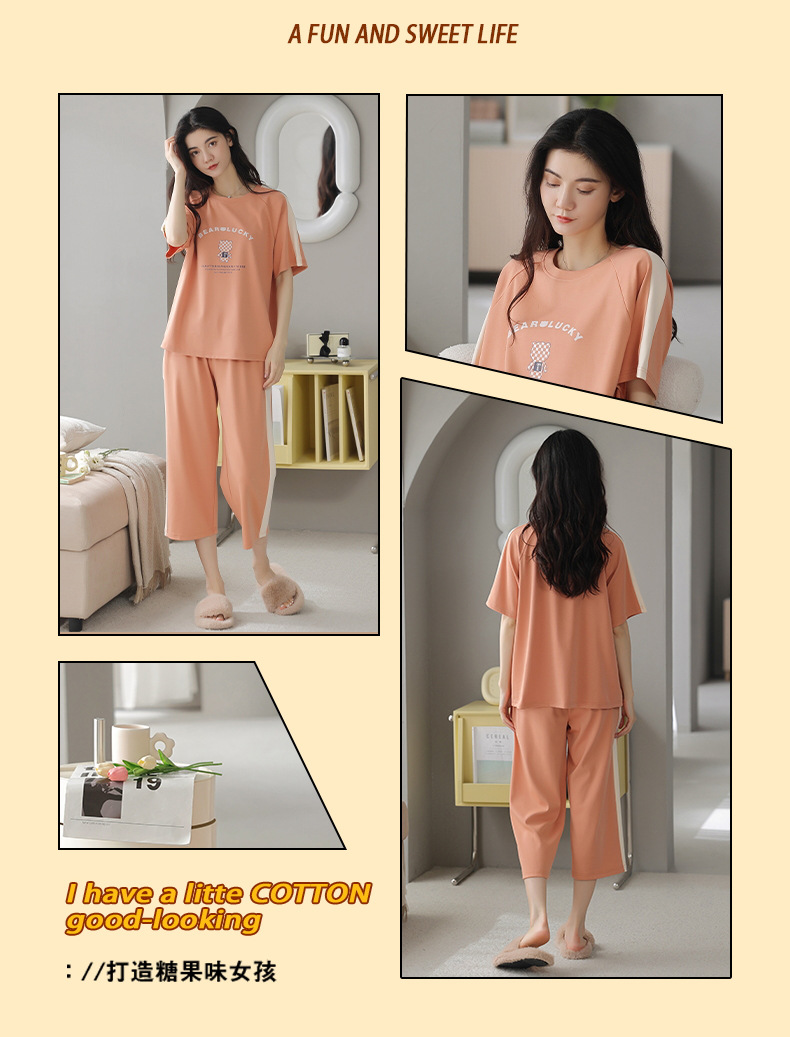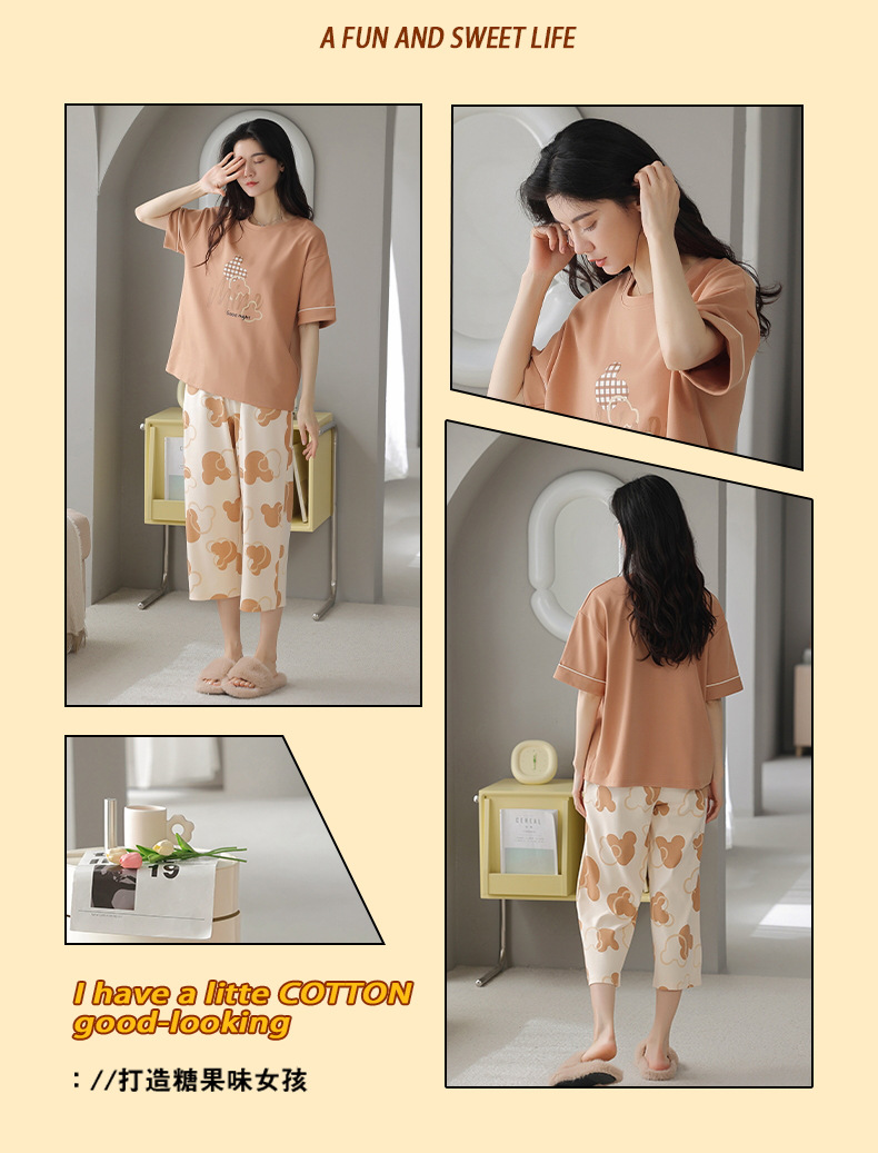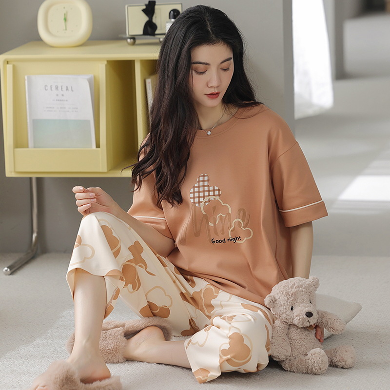 100% 면 잠옷 여성 반팔 크롭 팬츠 한국 여름 새로운 느슨한 캐주얼 학생 홈웨어 세트 얇은스토어 가기
